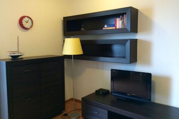 Die 46 m² große Wohnung ist modern ausgestattet und verfügt über einen Wohnraum mit ausziehbarem Schlafsofa für zwei Personen (1,95 m x 1,4 m), einem Essplatz für vier Personen, einem Flachbildfernseher und einem Radio mit CD-Spieler. Das Schlafzimmer verfügt über ein Doppelbett (1,80 m Breite), einen großen Kleiderschrank und einer Kommode. Gerne stellt Ihnen der Vermieter auch kostenfrei ein Babybett zur Verfügung. Eine zum Wohnraum offene Küche mit E-Herd, Backofen, Kühlschrank mit Tiefkühlfach, Kaffeemaschine, Toaster und einem Wasserkocher lässt keine Wünsche offen. Ein Badezimmer mit Dusche, WC, Waschbecken, Föhn und Zentralheizung ist ebenfalls vorhanden. Alle Fenster sind mit Fliegengittern und die Terrassentüren sind jeweils mit einer Insektenschutztür versehen. Die Ferienwohnung hat einen Kabelanschluss und verfügt im gesamten Objekt über WLAN. Auch einige Gesellschaftsspiele warten hier schon auf Sie.