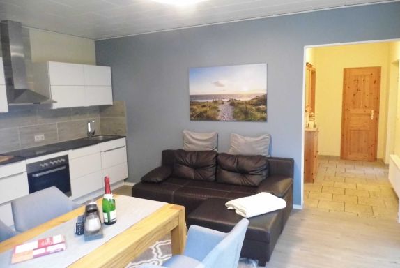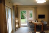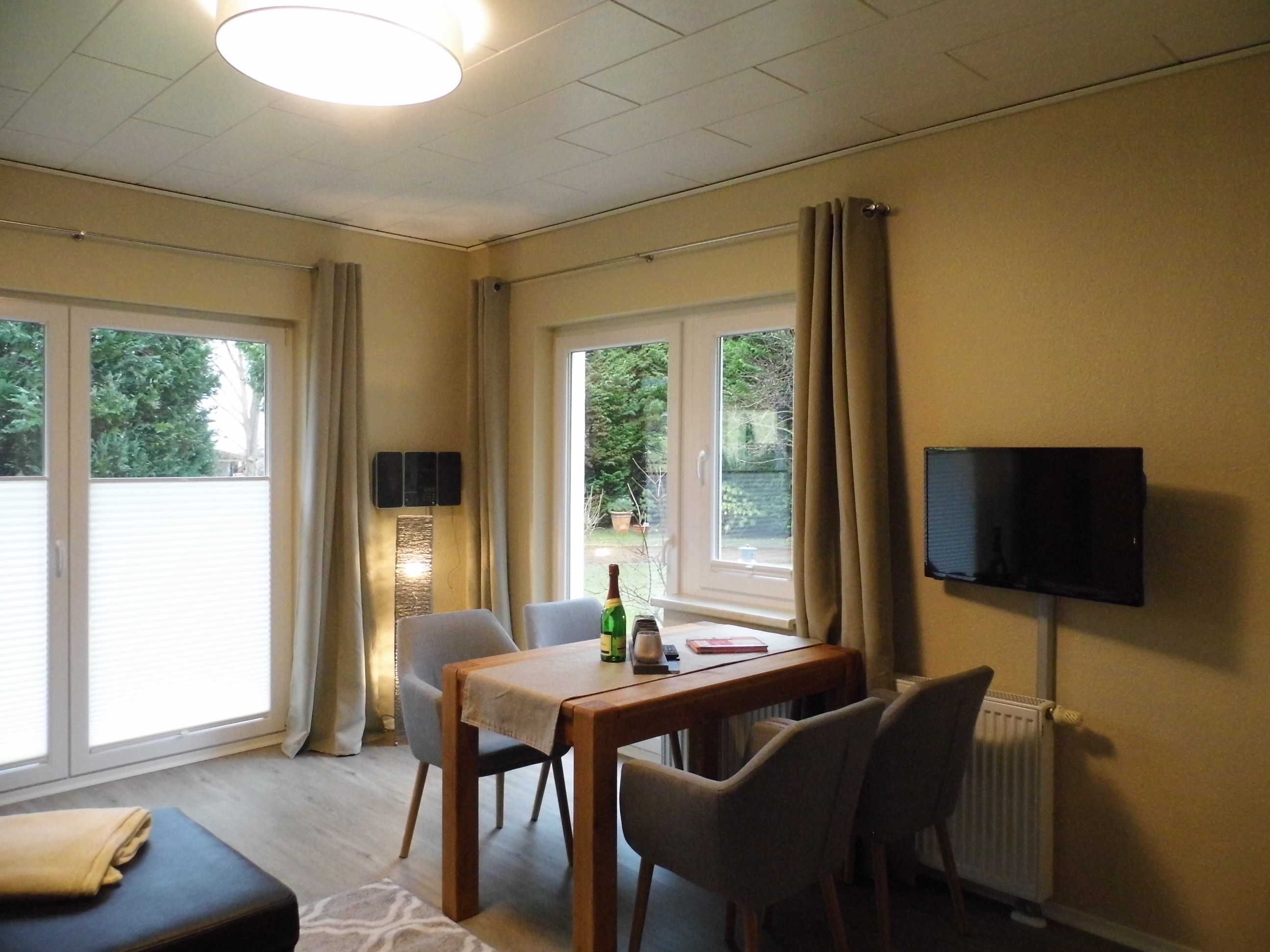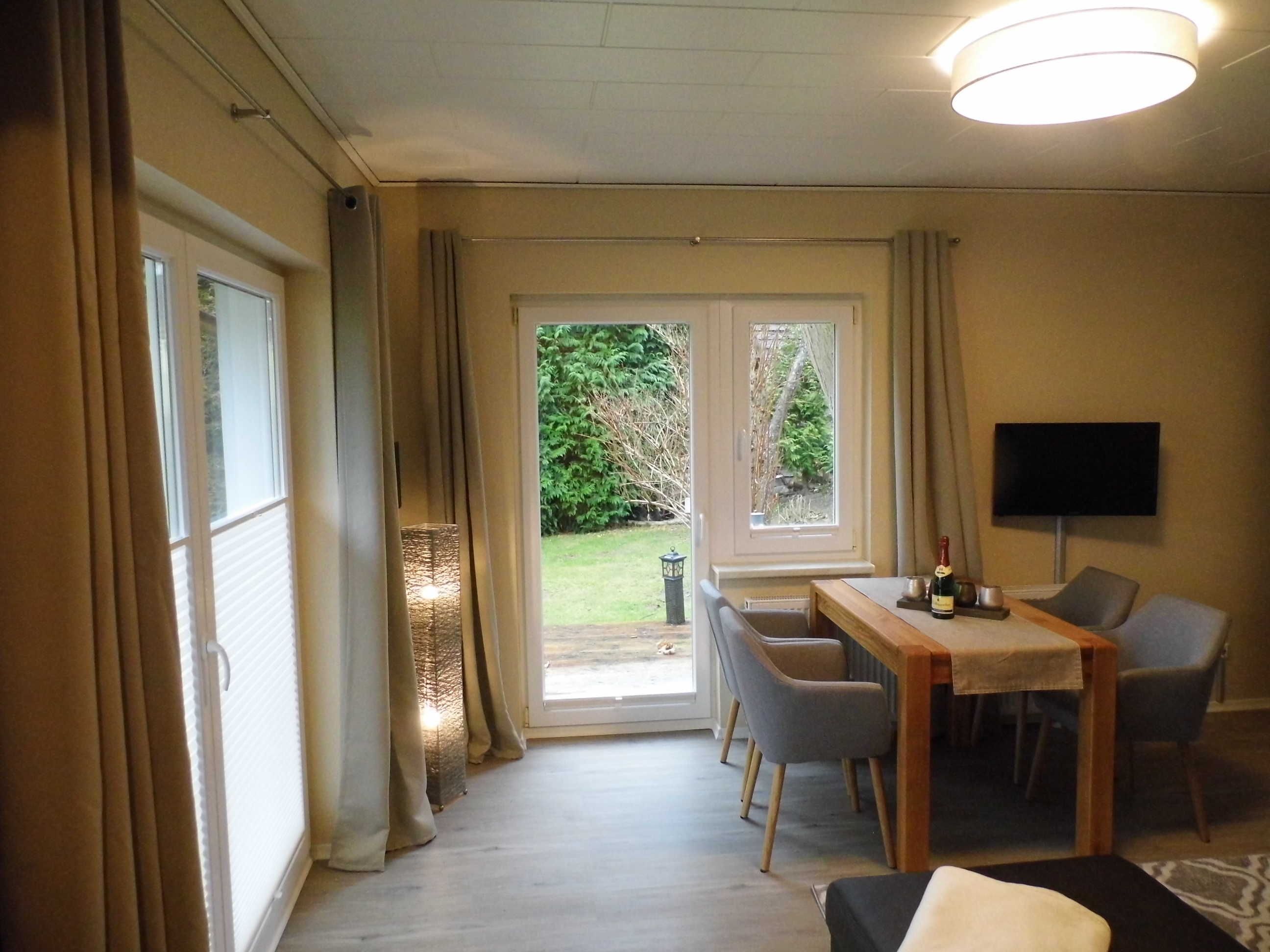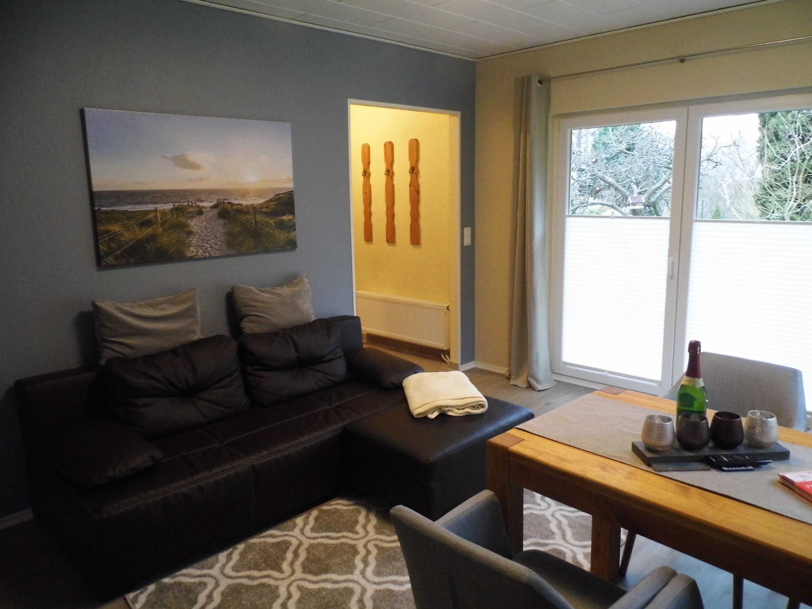 Sie wohnen in einem komfortabel neu eingerichteten 50m² Ferienhaus. Geräumiger heller Wohnraum mit Küche, direkter Zugang über 2 Terrassentüren zum Aussenbereich mit Holzterrasse und großer Grünfläche und NATURGARTEN , Gartenmöbeln und Grill.