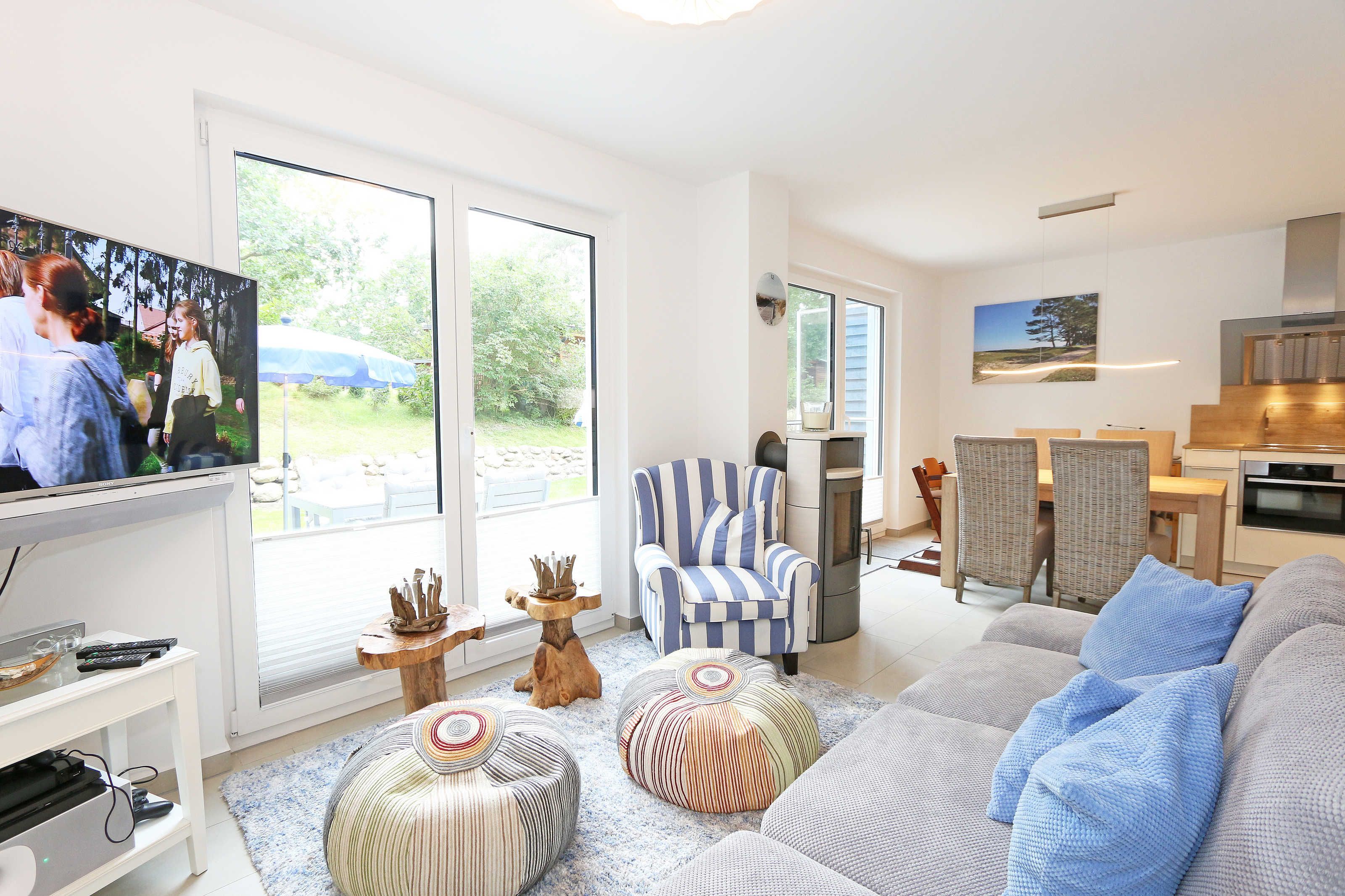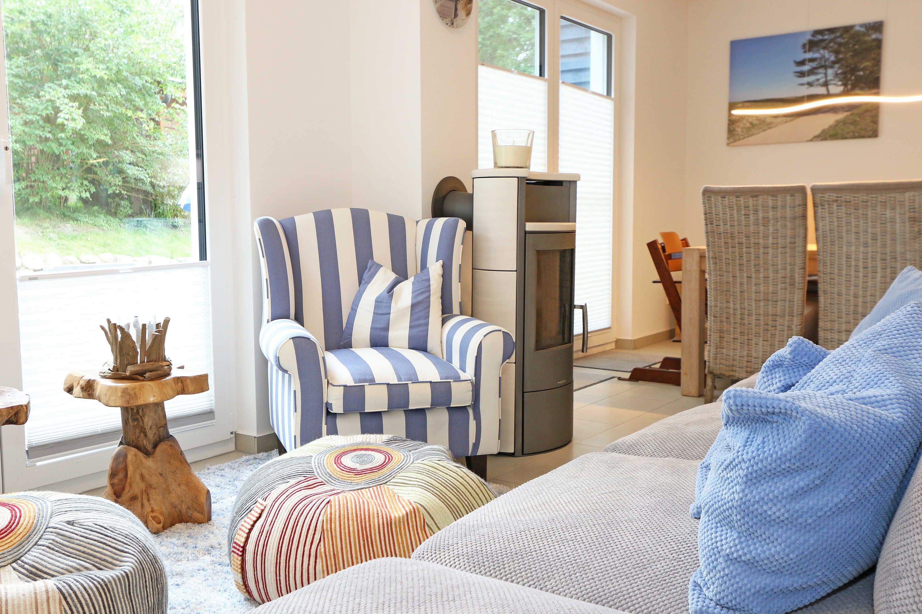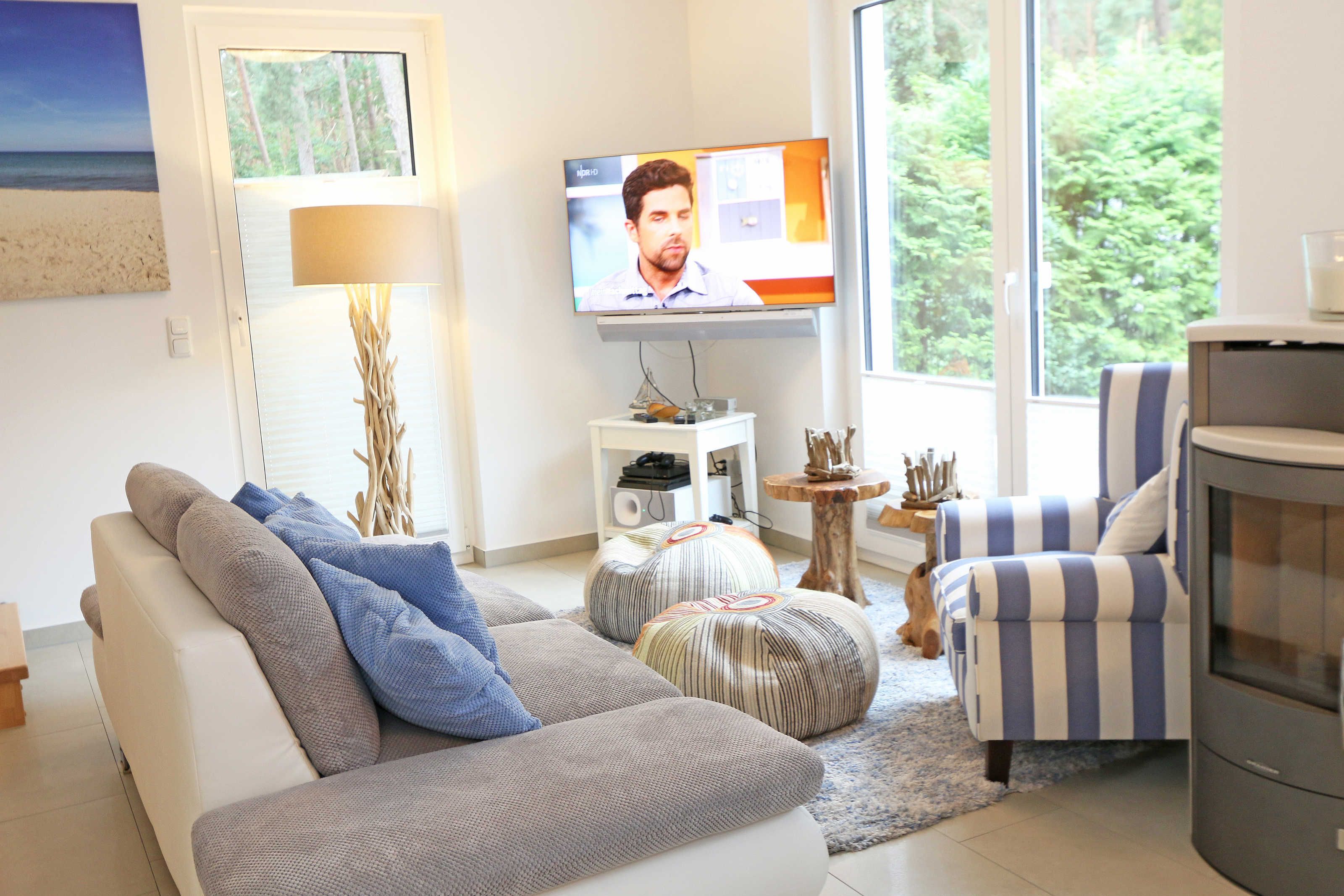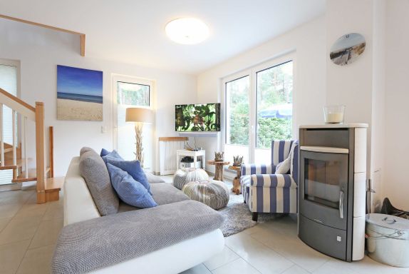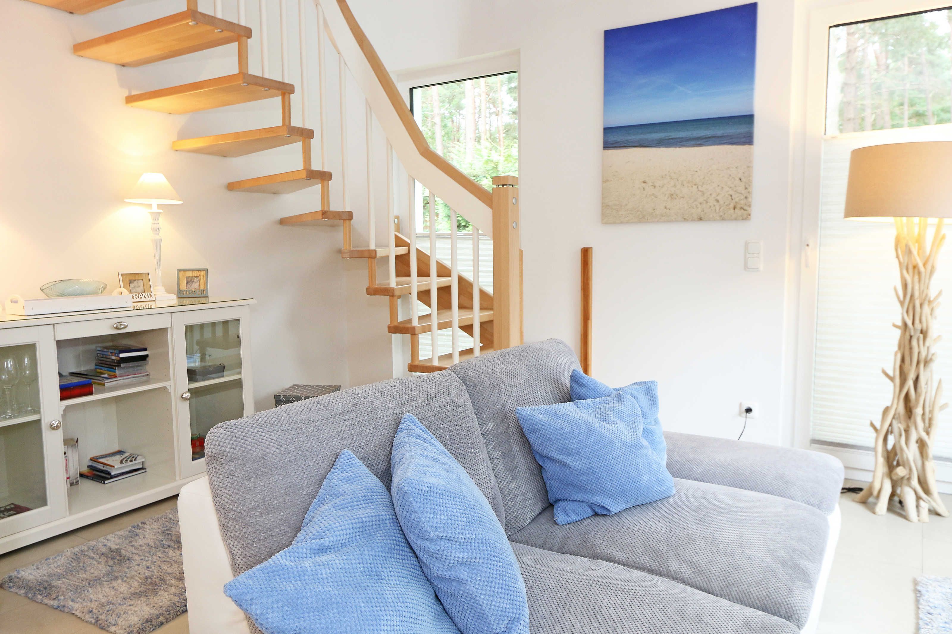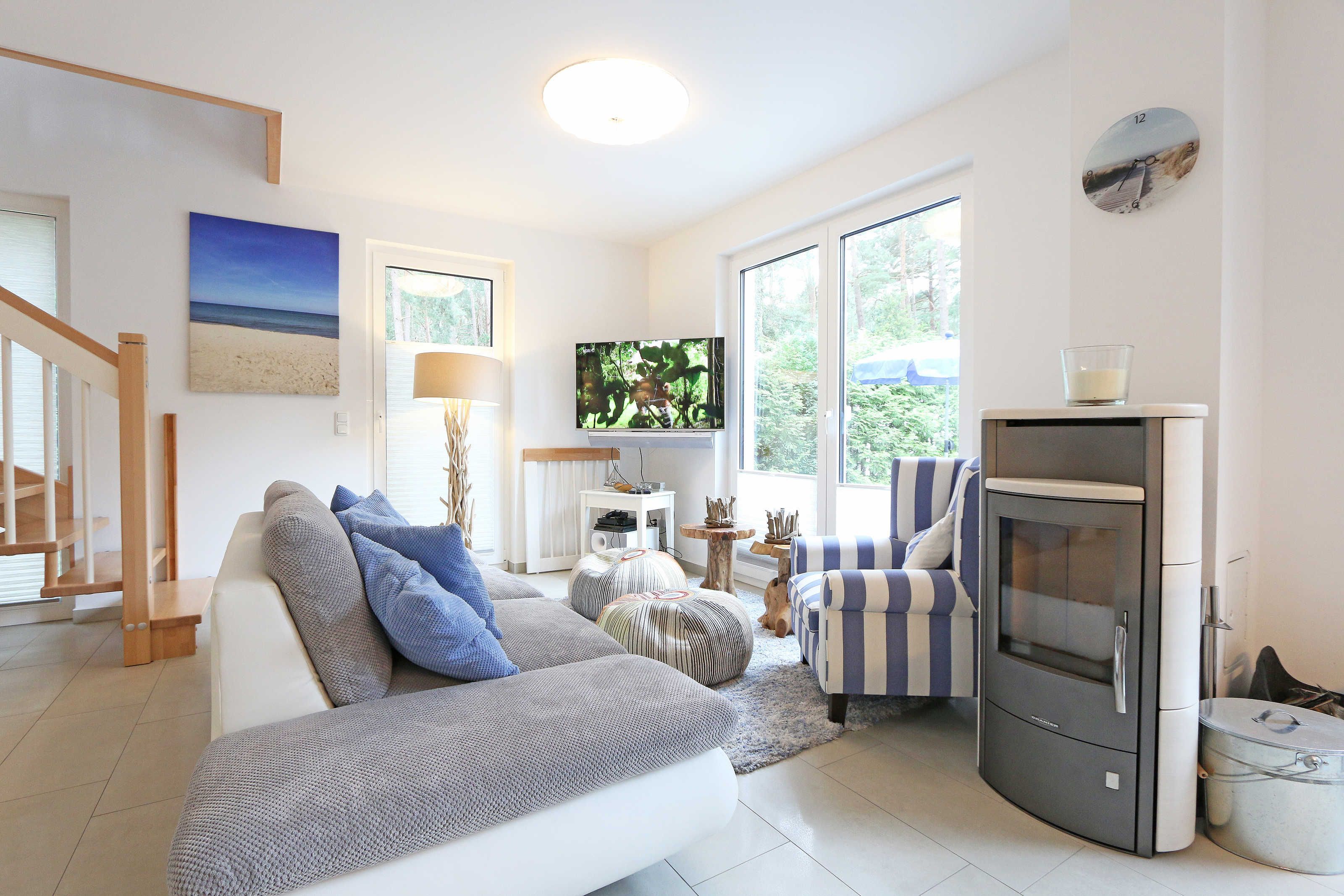Das Nichtraucherferienhaus „Blaue Welle“ befindet sich in einzigartiger Lage, im Dünenpark Baabe. Durch die großzügige Wohnfläche von ca. 95 qm, welche sich über 2 Etagen erstreckt, bietet Ihnen das Haus ausreichend Platz für max. 5 Erwachsene und 1 Kleinkind bis 3 Jahre im Kinderreisebett. Die Innenausstattung wird Ihr Herz höher schlagen lassen, denn durch die angefertigten Echtholzmöbel sowie die Einbauküche aus dem Hause Leicht werden besondere Akzente im Haus gesetzt. Der kombinierte Wohn-/Essbereich wurde mit einer gemütlichen Couchecke, Couchtisch, einem Hocker, Leselampe sowie ein Sideboard ausgestattet. Für gemütliche Abende dient ein Flachbild-TV mit passender Soundbar von SONY, ein DVD-Player durch die PS4 und ein moderner Kaminofen mit großem Sichtfenster. Auch auf einen Internetanschluss (WLAN) brauchen Sie nicht verzichten dieser ist für Sie inklusive. Die angrenzende Einbauküche lässt keine Wünsche offen mit einem Kühlschrank inklusive großem Eisfach, ein Cerankochfeld, einer Dunstabzugshaube, ein kombinierter Backofen mit Mikrowelle, einem Geschirrspüler, einer Duo-Kaffeemaschine (Pads und Filter/Phillips Senseo Thermo Duo), einem Toaster, einem Wasserkocher, einem Handrührgerät, einem Pürierstab sowie vielen Küchenhelfer. Vom Wohnbereich gelangen Sie auf die großflächige und beleuchtete Terrasse (Süd/West) mit robuster Bestuhlung. Im Gartenbereich wartet zusätzlich ein Ostseestrandkorb sowie ein Steingrill auf Sie. Im Erdgeschoss befindet sich eines von insgesamt 3 Schlafzimmern, welches mit einem Queensize-Bett (1,40 m x 2,00 m), 2 kleinen Schränken, 2 kleinen Sesseln und einem Flachbild-TV ausgestattet ist. Gleich gegenüber befindet sich das ebenerdige Badezimmer mit einer Echtglasdusche, WC, Fön, Waschtisch sowie einer hauseigenen Sauna. Über die Treppe gelangen Sie vom Wohnbereich in die 1. Etage des Hauses, wo Sie eine lichtdurchflutete und offene Galerie erwartet. Hier lässt es sich wunderbar mit einem Buch relaxen. 2 weitere Schlafzimmer sind hier hell und freundlich eingerichtet worden und bieten Ihnen jeweils 1 Doppelbett (1,80 m x 2,00 m), 2 Nachttischablagen, ein Flachbild-TV und Echtholzkommoden. Bei geöffnetem Fenster können Sie dem Wellenspiel der Ostsee zuhören. Alle Schlafräume sind mit verdunkelnden Rollos oder Plissee und Insektenschutzgitter versehen, so dass einem ruhigen Ausschlafen nichts im Wege steht. Das 2. Tageslichtbad wird durch eine ebenerdige Dusche, eine formschöne Badewanne, ein WC, einen Fön, einen Waschtisch sowie einen Waschtrockner abgerundet. Für eine angenehme Wärme sorgt in allen Räumlichkeiten die Fußbodenheizung. Zusätzliche Highlights sind eine Entkalkungsanlage sowie eine verbrauchsarme Gasbrennwerttherme. Für unsere kleinen Gäste stehen 1x Tripp-Trapp Hochstuhl und 1x Kinderreisebett (mit Zusatzkindermatratze / ohne Bett-Inlett) kostenfrei zur Verfügung. Auch 2 vorhandene Fallschutzgitter für die Treppe oder auch Steckdosenschutz sind vorhanden. Haustiere sind nicht erlaubt. Zum Ferienhaus gehören 2 nebeneinander gelegene PKW-Stellplätze (Blaue Welle). Die Erstausstattung eines Wäschepaketes (komplette Bettwäsche, 1 Duschhandtuch, 2 kleine Handtücher) können Sie bis 14 Tage vor Anreise gegen einen Aufpreis dazu buchen oder durch eigene ergänzen. Ab 2 gebuchten Paketen erhalten Sie einmalig 1 Geschirrhandtuch und 1 Duschvorleger hinzu.