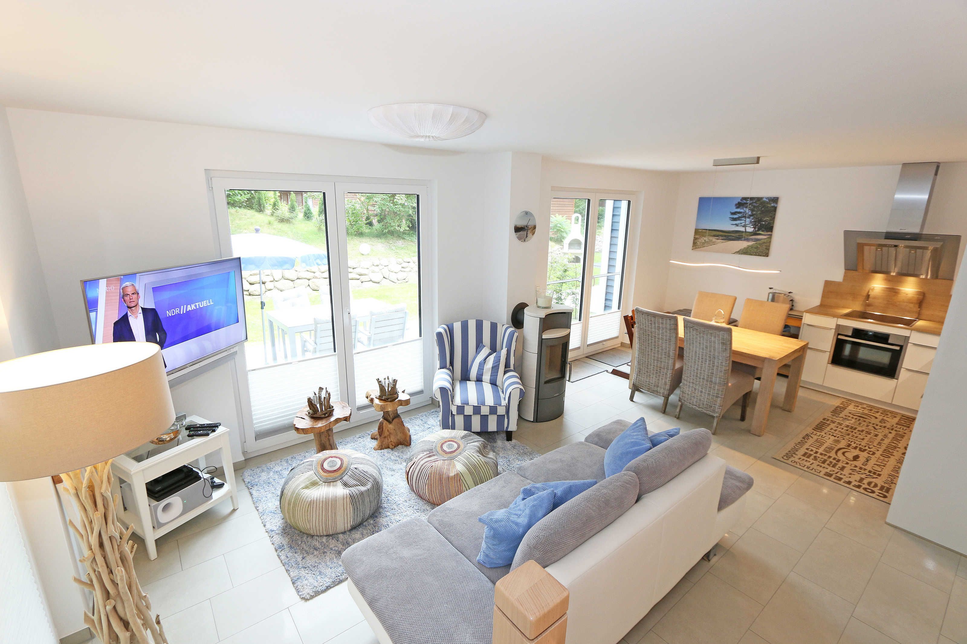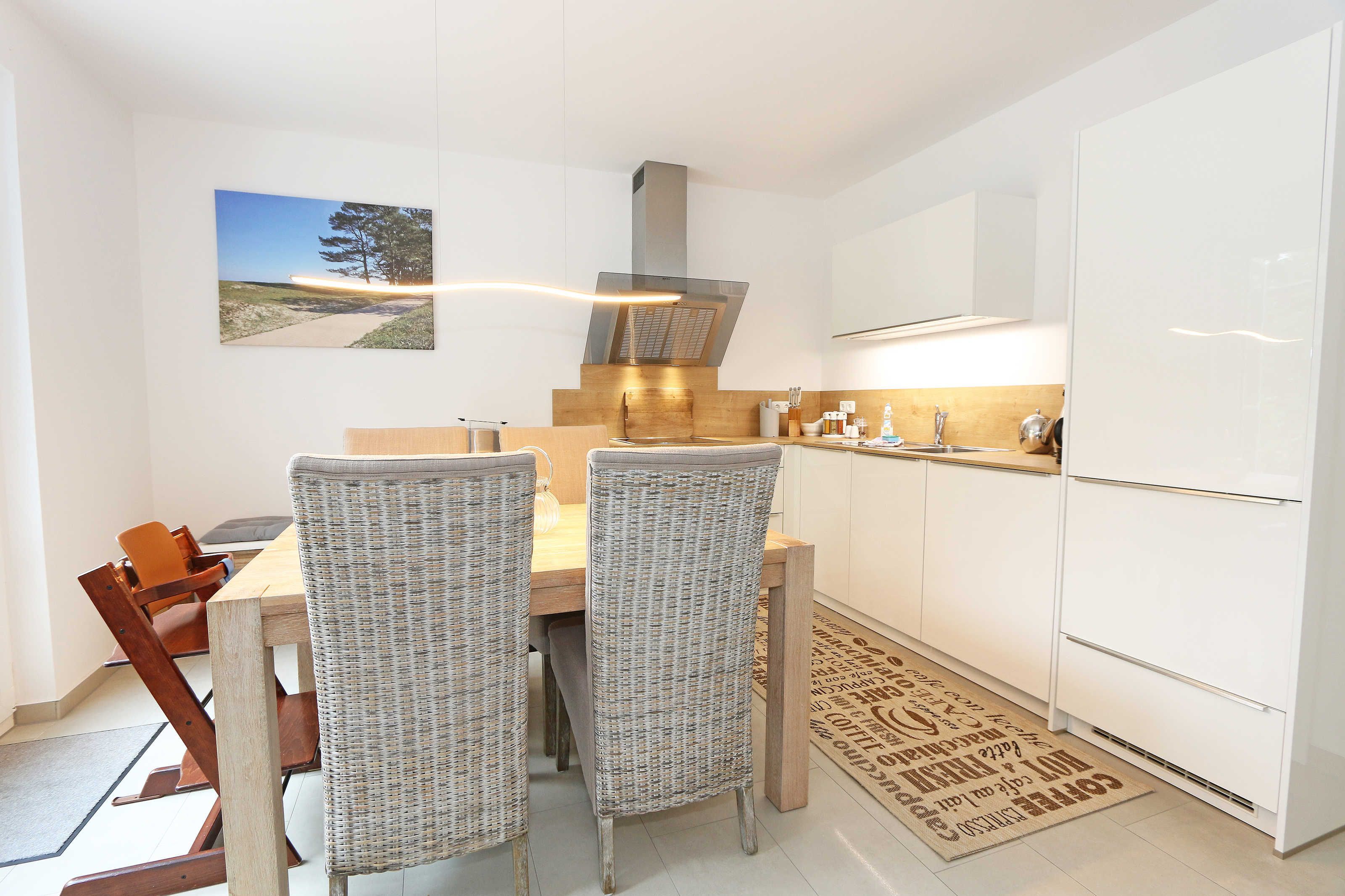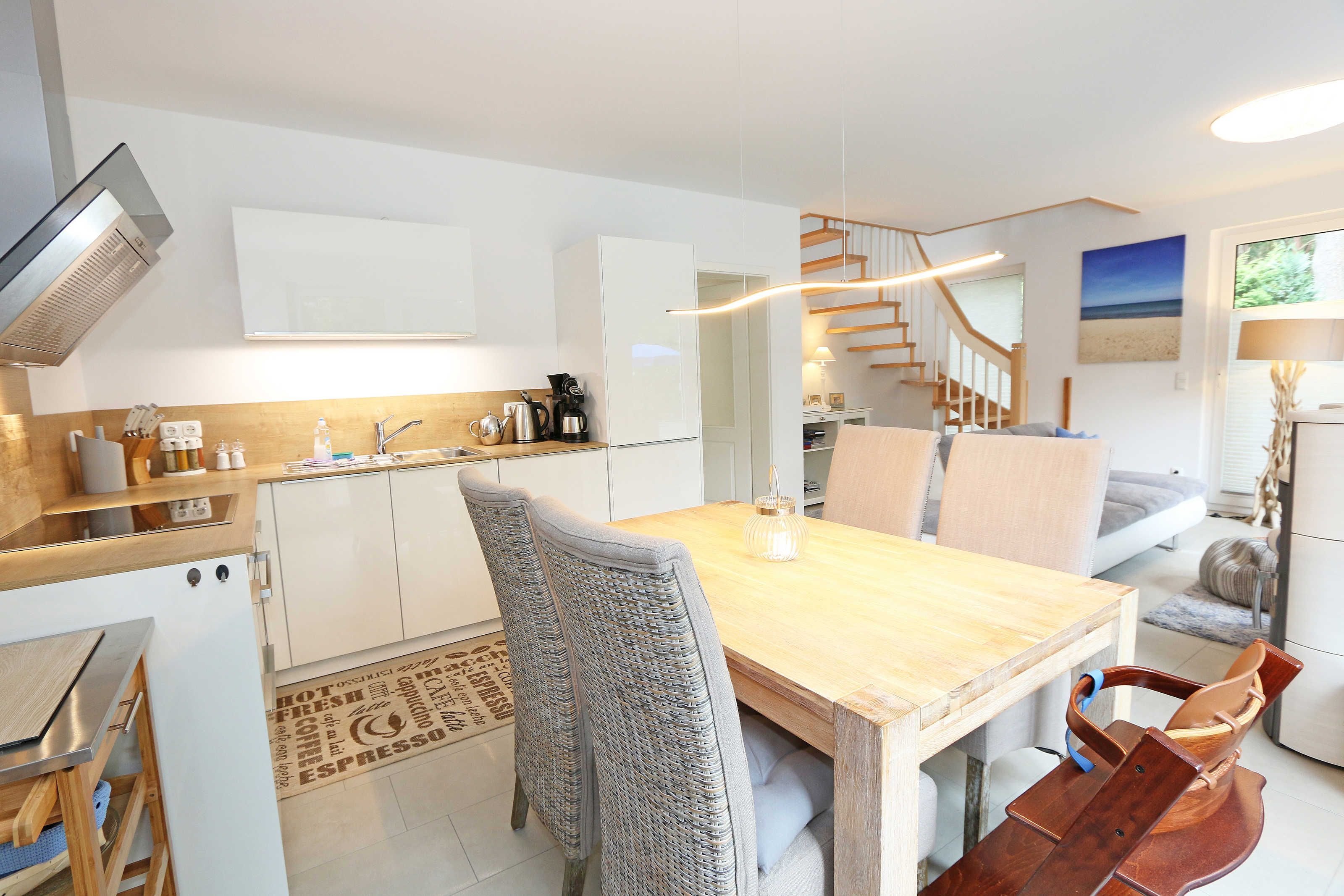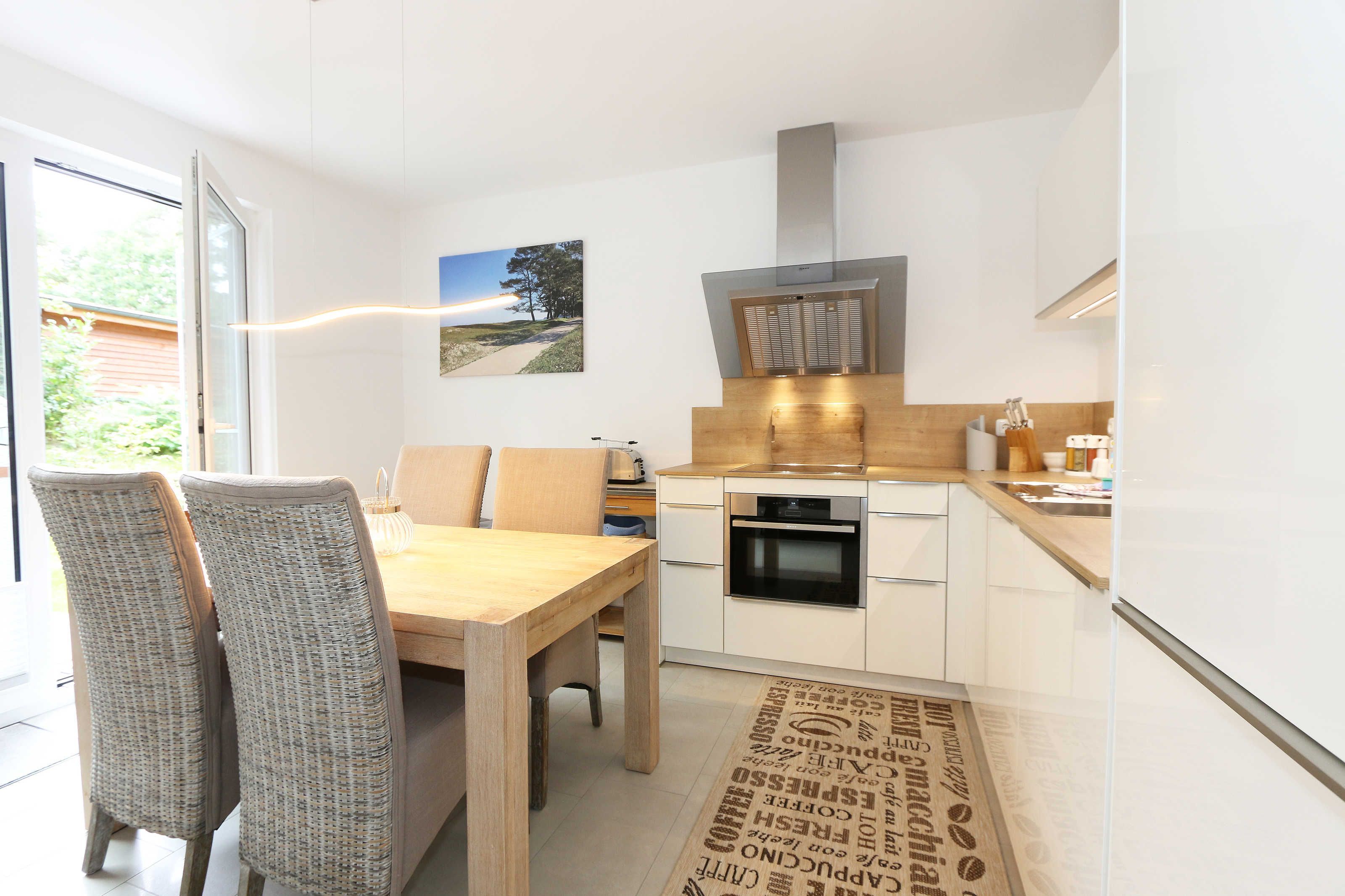 Das Nichtraucherferienhaus „Blaue Welle“ befindet sich in einzigartiger Lage, im Dünenpark Baabe. Durch die großzügige Wohnfläche von ca. 95 qm, welche sich über 2 Etagen erstreckt, bietet Ihnen das Haus ausreichend Platz für max. 5 Erwachsene und 1 Kleinkind bis 3 Jahre im Kinderreisebett. Die Innenausstattung wird Ihr Herz höher schlagen lassen, denn durch die angefertigten Echtholzmöbel sowie die Einbauküche aus dem Hause Leicht werden besondere Akzente im Haus gesetzt. Der kombinierte Wohn-/Essbereich wurde mit einer gemütlichen Couchecke, Couchtisch, einem Hocker, Leselampe sowie ein Sideboard ausgestattet. Für gemütliche Abende dient ein Flachbild-TV mit passender Soundbar von SONY, ein DVD-Player durch die PS4 und ein moderner Kaminofen mit großem Sichtfenster. Auch auf einen Internetanschluss (WLAN) brauchen Sie nicht verzichten dieser ist für Sie inklusive. Die angrenzende Einbauküche lässt keine Wünsche offen mit einem Kühlschrank inklusive großem Eisfach, ein Cerankochfeld, einer Dunstabzugshaube, ein kombinierter Backofen mit Mikrowelle, einem Geschirrspüler, einer Duo-Kaffeemaschine (Pads und Filter/Phillips Senseo Thermo Duo), einem Toaster, einem Wasserkocher, einem Handrührgerät, einem Pürierstab sowie vielen Küchenhelfer. Vom Wohnbereich gelangen Sie auf die großflächige und beleuchtete Terrasse (Süd/West) mit robuster Bestuhlung. Im Gartenbereich wartet zusätzlich ein Ostseestrandkorb sowie ein Steingrill auf Sie. Im Erdgeschoss befindet sich eines von insgesamt 3 Schlafzimmern, welches mit einem Queensize-Bett (1,40 m x 2,00 m), 2 kleinen Schränken, 2 kleinen Sesseln und einem Flachbild-TV ausgestattet ist. Gleich gegenüber befindet sich das ebenerdige Badezimmer mit einer Echtglasdusche, WC, Fön, Waschtisch sowie einer hauseigenen Sauna. Über die Treppe gelangen Sie vom Wohnbereich in die 1. Etage des Hauses, wo Sie eine lichtdurchflutete und offene Galerie erwartet. Hier lässt es sich wunderbar mit einem Buch relaxen. 2 weitere Schlafzimmer sind hier hell und freundlich eingerichtet worden und bieten Ihnen jeweils 1 Doppelbett (1,80 m x 2,00 m), 2 Nachttischablagen, ein Flachbild-TV und Echtholzkommoden. Bei geöffnetem Fenster können Sie dem Wellenspiel der Ostsee zuhören. Alle Schlafräume sind mit verdunkelnden Rollos oder Plissee und Insektenschutzgitter versehen, so dass einem ruhigen Ausschlafen nichts im Wege steht. Das 2. Tageslichtbad wird durch eine ebenerdige Dusche, eine formschöne Badewanne, ein WC, einen Fön, einen Waschtisch sowie einen Waschtrockner abgerundet. Für eine angenehme Wärme sorgt in allen Räumlichkeiten die Fußbodenheizung. Zusätzliche Highlights sind eine Entkalkungsanlage sowie eine verbrauchsarme Gasbrennwerttherme. Für unsere kleinen Gäste stehen 1x Tripp-Trapp Hochstuhl und 1x Kinderreisebett (mit Zusatzkindermatratze / ohne Bett-Inlett) kostenfrei zur Verfügung. Auch 2 vorhandene Fallschutzgitter für die Treppe oder auch Steckdosenschutz sind vorhanden. Haustiere sind nicht erlaubt. Zum Ferienhaus gehören 2 nebeneinander gelegene PKW-Stellplätze (Blaue Welle). Die Erstausstattung eines Wäschepaketes (komplette Bettwäsche, 1 Duschhandtuch, 2 kleine Handtücher) können Sie bis 14 Tage vor Anreise gegen einen Aufpreis dazu buchen oder durch eigene ergänzen. Ab 2 gebuchten Paketen erhalten Sie einmalig 1 Geschirrhandtuch und 1 Duschvorleger hinzu.
