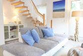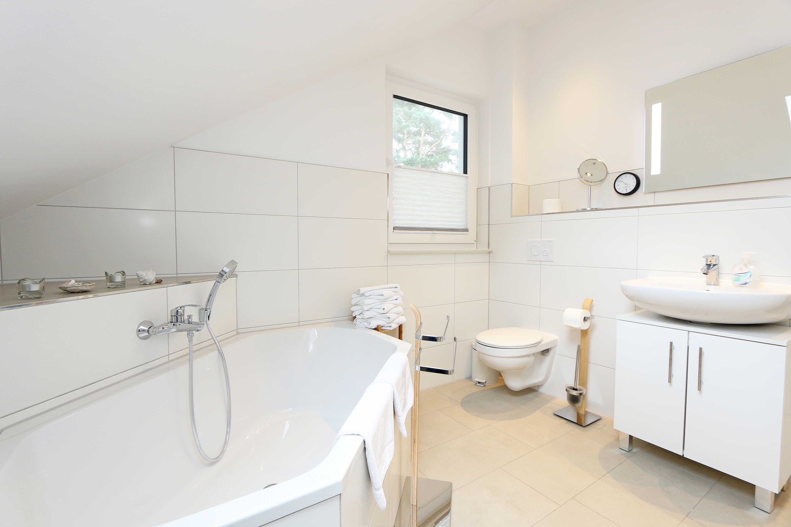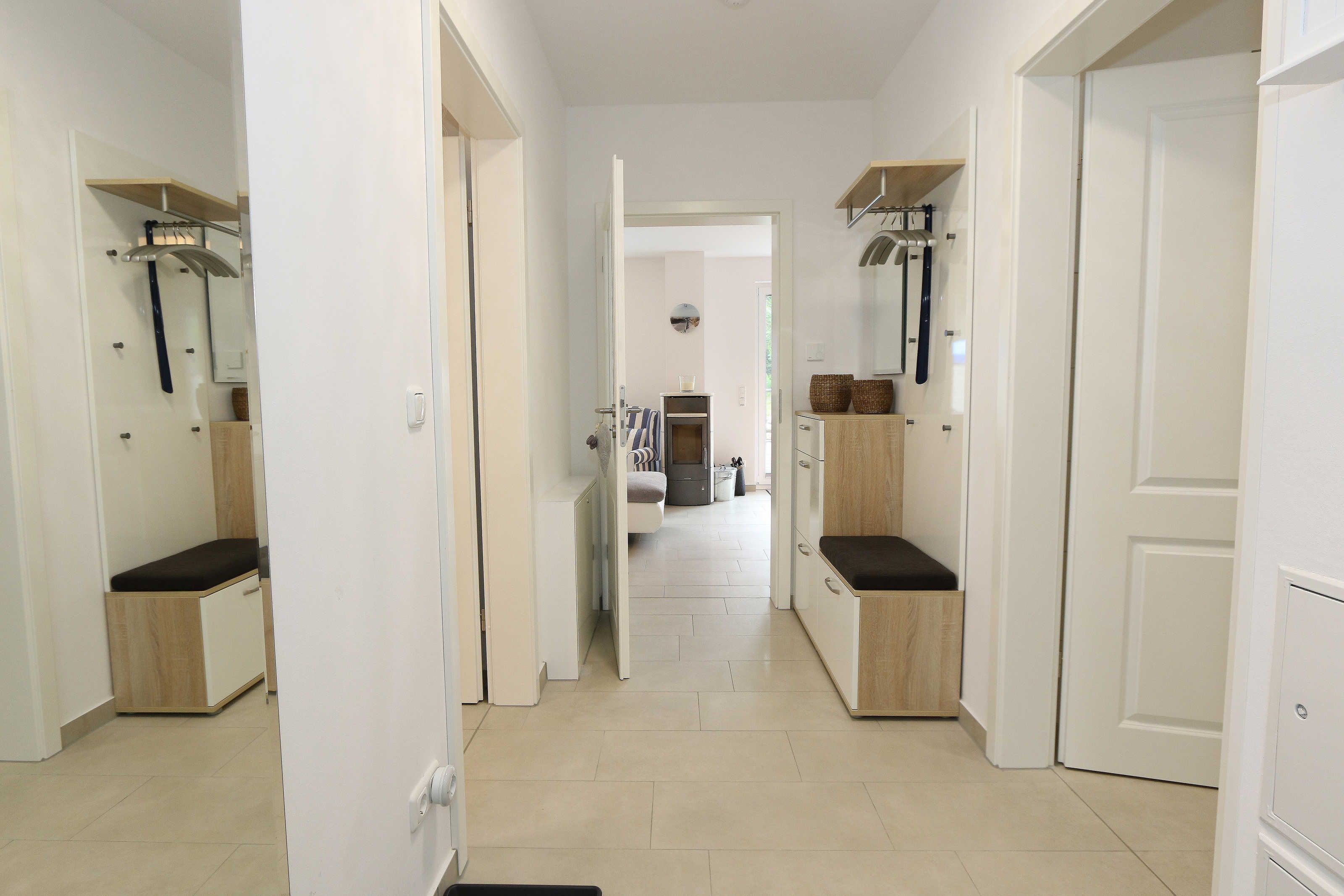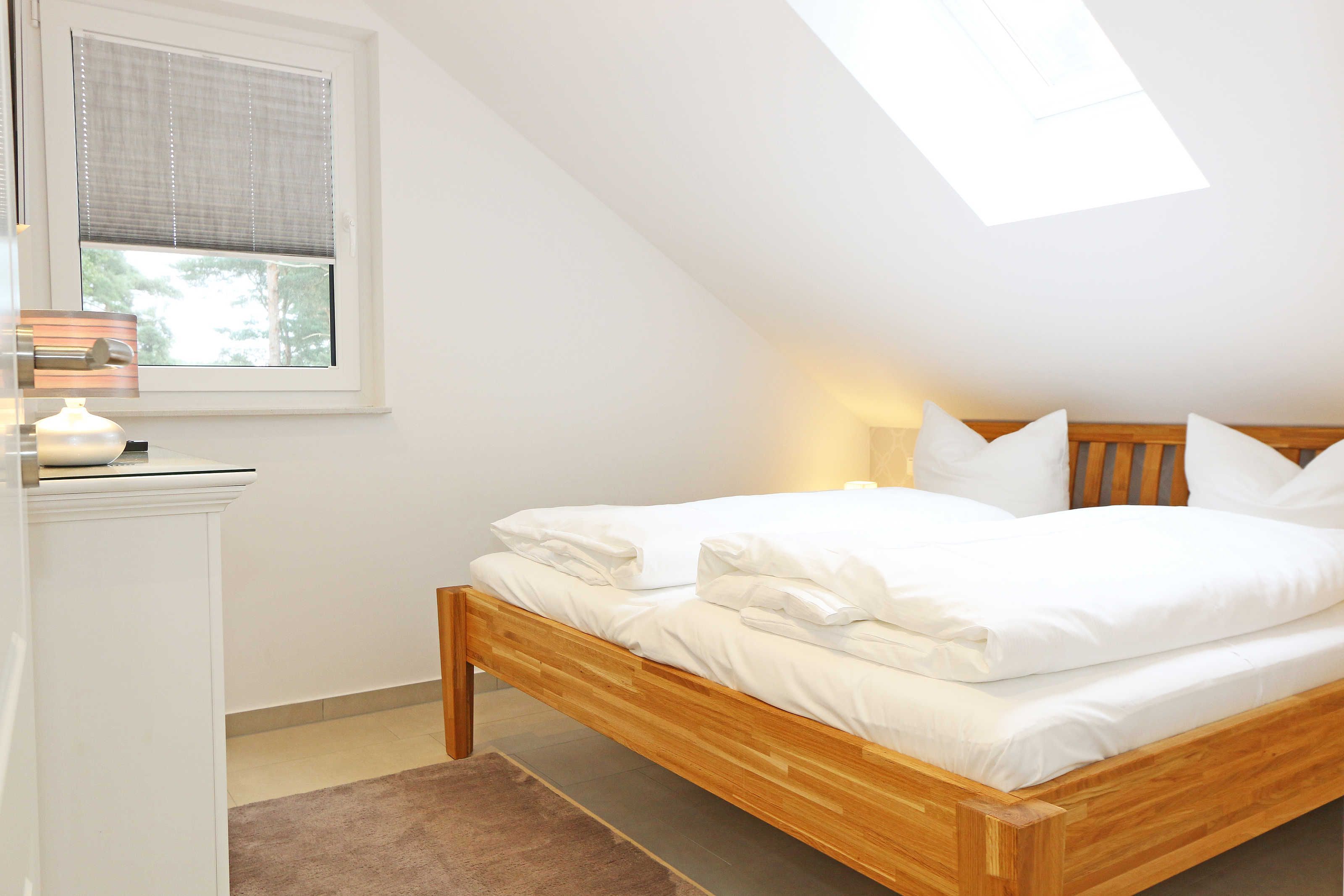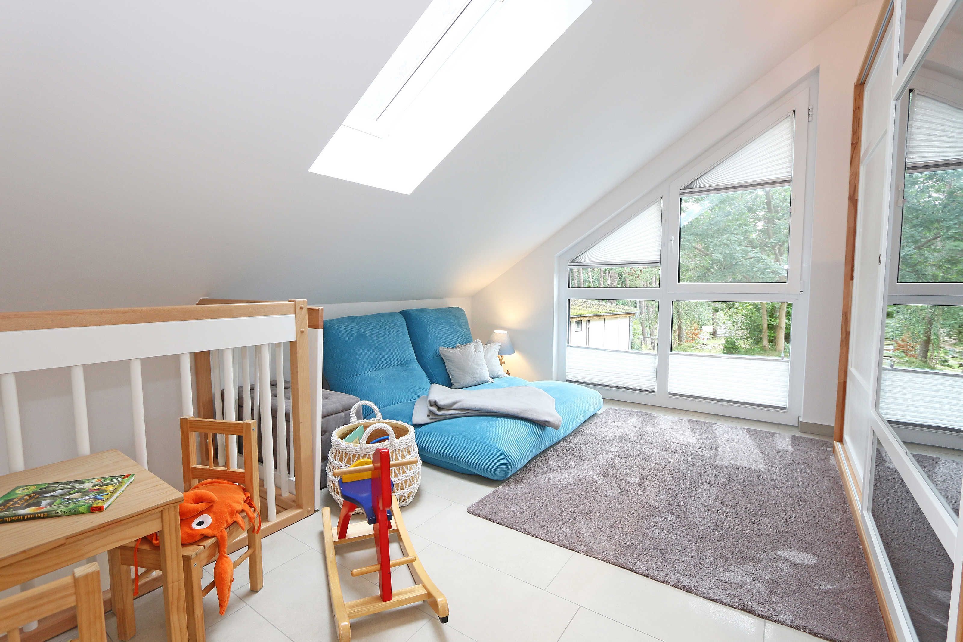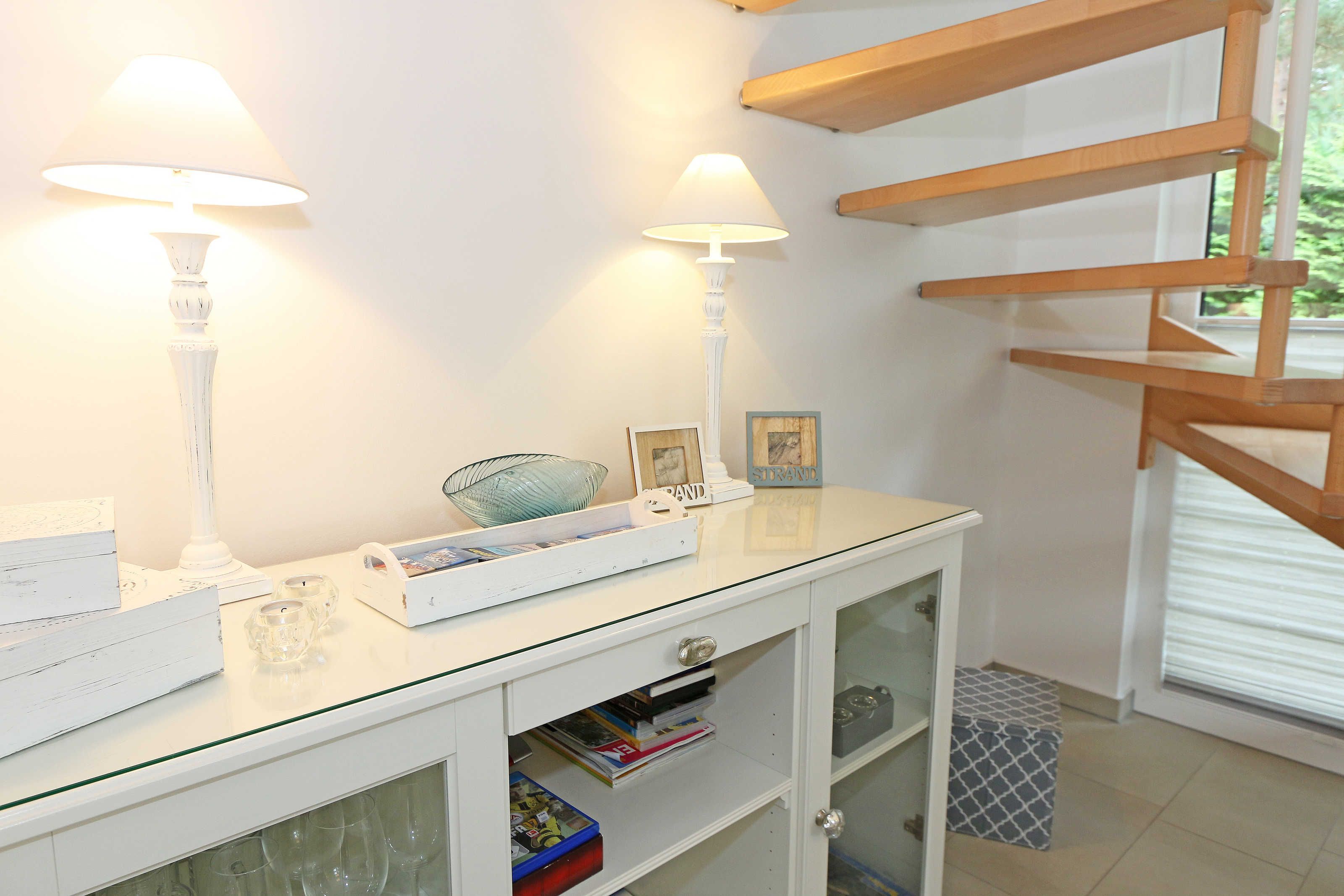 Das Nichtraucherferienhaus „Blaue Welle“ befindet sich in einzigartiger Lage, im Dünenpark Baabe. Durch die großzügige Wohnfläche von ca. 95 qm, welche sich über 2 Etagen erstreckt, bietet Ihnen das Haus ausreichend Platz für max. 5 Erwachsene und 1 Kleinkind bis 3 Jahre im Kinderreisebett. Die Innenausstattung wird Ihr Herz höher schlagen lassen, denn durch die angefertigten Echtholzmöbel sowie die Einbauküche aus dem Hause Leicht werden besondere Akzente im Haus gesetzt. Der kombinierte Wohn-/Essbereich wurde mit einer gemütlichen Couchecke, Couchtisch, einem Hocker, Leselampe sowie ein Sideboard ausgestattet. Für gemütliche Abende dient ein Flachbild-TV mit passender Soundbar von SONY, ein DVD-Player durch die PS4 und ein moderner Kaminofen mit großem Sichtfenster. Auch auf einen Internetanschluss (WLAN) brauchen Sie nicht verzichten dieser ist für Sie inklusive. Die angrenzende Einbauküche lässt keine Wünsche offen mit einem Kühlschrank inklusive großem Eisfach, ein Cerankochfeld, einer Dunstabzugshaube, ein kombinierter Backofen mit Mikrowelle, einem Geschirrspüler, einer Duo-Kaffeemaschine (Pads und Filter/Phillips Senseo Thermo Duo), einem Toaster, einem Wasserkocher, einem Handrührgerät, einem Pürierstab sowie vielen Küchenhelfer. Vom Wohnbereich gelangen Sie auf die großflächige und beleuchtete Terrasse (Süd/West) mit robuster Bestuhlung. Im Gartenbereich wartet zusätzlich ein Ostseestrandkorb sowie ein Steingrill auf Sie. Im Erdgeschoss befindet sich eines von insgesamt 3 Schlafzimmern, welches mit einem Queensize-Bett (1,40 m x 2,00 m), 2 kleinen Schränken, 2 kleinen Sesseln und einem Flachbild-TV ausgestattet ist. Gleich gegenüber befindet sich das ebenerdige Badezimmer mit einer Echtglasdusche, WC, Fön, Waschtisch sowie einer hauseigenen Sauna. Über die Treppe gelangen Sie vom Wohnbereich in die 1. Etage des Hauses, wo Sie eine lichtdurchflutete und offene Galerie erwartet. Hier lässt es sich wunderbar mit einem Buch relaxen. 2 weitere Schlafzimmer sind hier hell und freundlich eingerichtet worden und bieten Ihnen jeweils 1 Doppelbett (1,80 m x 2,00 m), 2 Nachttischablagen, ein Flachbild-TV und Echtholzkommoden. Bei geöffnetem Fenster können Sie dem Wellenspiel der Ostsee zuhören. Alle Schlafräume sind mit verdunkelnden Rollos oder Plissee und Insektenschutzgitter versehen, so dass einem ruhigen Ausschlafen nichts im Wege steht. Das 2. Tageslichtbad wird durch eine ebenerdige Dusche, eine formschöne Badewanne, ein WC, einen Fön, einen Waschtisch sowie einen Waschtrockner abgerundet. Für eine angenehme Wärme sorgt in allen Räumlichkeiten die Fußbodenheizung. Zusätzliche Highlights sind eine Entkalkungsanlage sowie eine verbrauchsarme Gasbrennwerttherme. Für unsere kleinen Gäste stehen 1x Tripp-Trapp Hochstuhl und 1x Kinderreisebett (mit Zusatzkindermatratze / ohne Bett-Inlett) kostenfrei zur Verfügung. Auch 2 vorhandene Fallschutzgitter für die Treppe oder auch Steckdosenschutz sind vorhanden. Haustiere sind nicht erlaubt. Zum Ferienhaus gehören 2 nebeneinander gelegene PKW-Stellplätze (Blaue Welle). Die Erstausstattung eines Wäschepaketes (komplette Bettwäsche, 1 Duschhandtuch, 2 kleine Handtücher) können Sie bis 14 Tage vor Anreise gegen einen Aufpreis dazu buchen oder durch eigene ergänzen. Ab 2 gebuchten Paketen erhalten Sie einmalig 1 Geschirrhandtuch und 1 Duschvorleger hinzu.