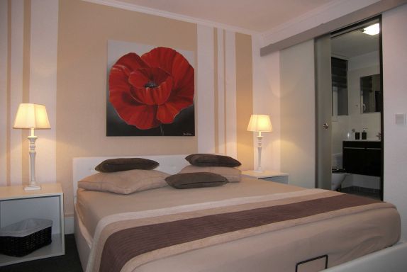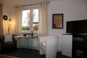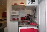 Das stilvolle 1-Raum-Appartement im Bungalowstil bietet Ihnen auf einer Fläche von ca. 25qm einen kombinierten Wohn-Schlafbereich mit gemütlichem Doppelbett, Flat-TV und einem Esstisch für 2 Personen. Angrenzend befindet sich die kleine Küche mit 2-Plattenherd, Kühlschrank, Mikrowelle, Wasserkocher,Toaster & Kaffeemaschine.