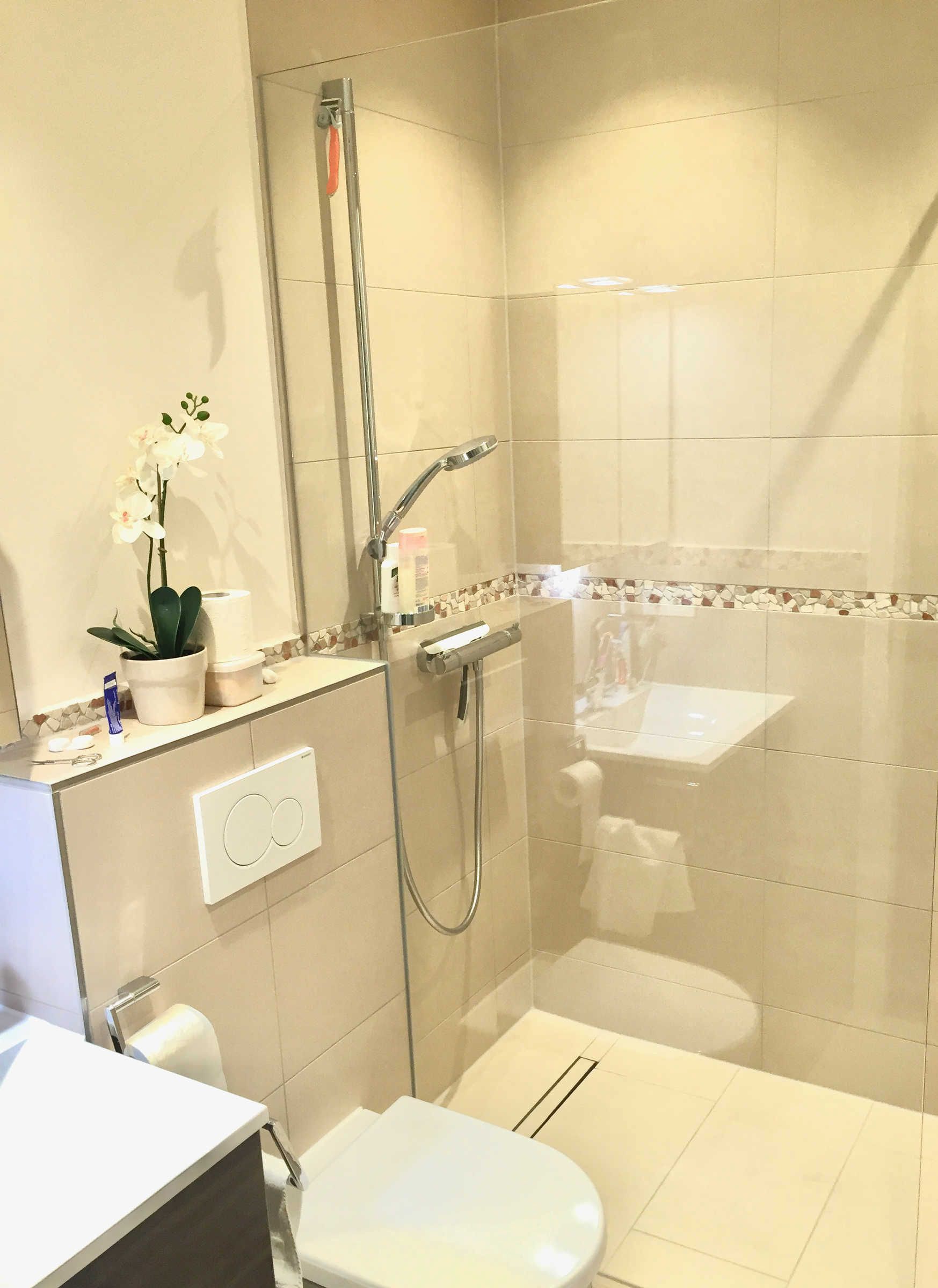 Ein modernes helles Duschbad mit Walk in Dusche machen das Ferienapartment komplett.