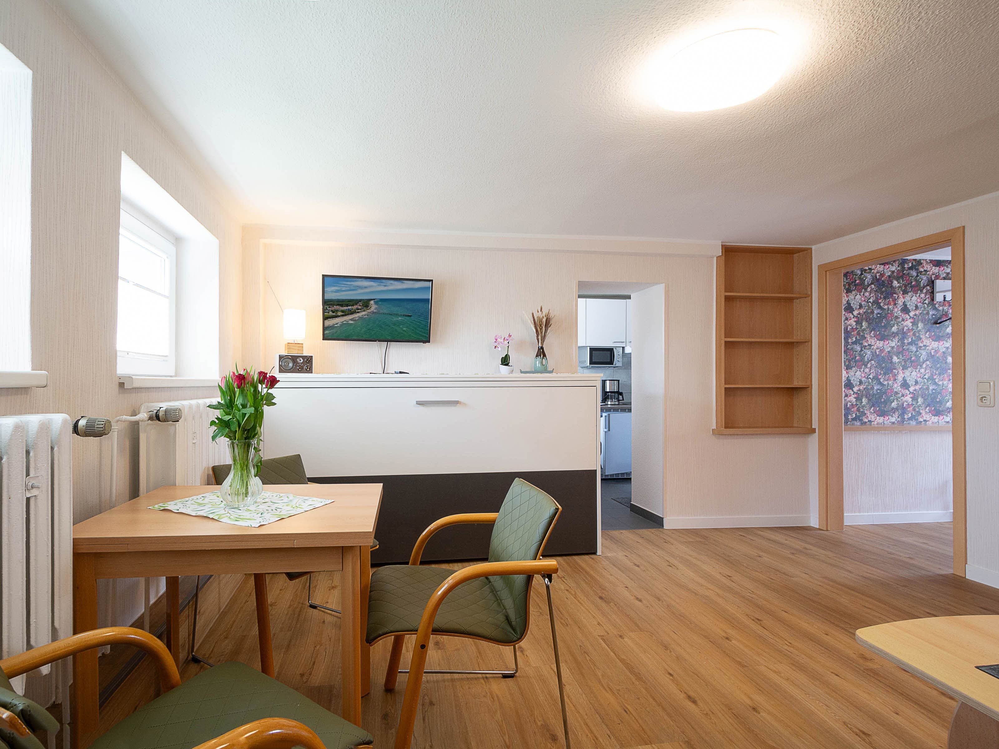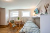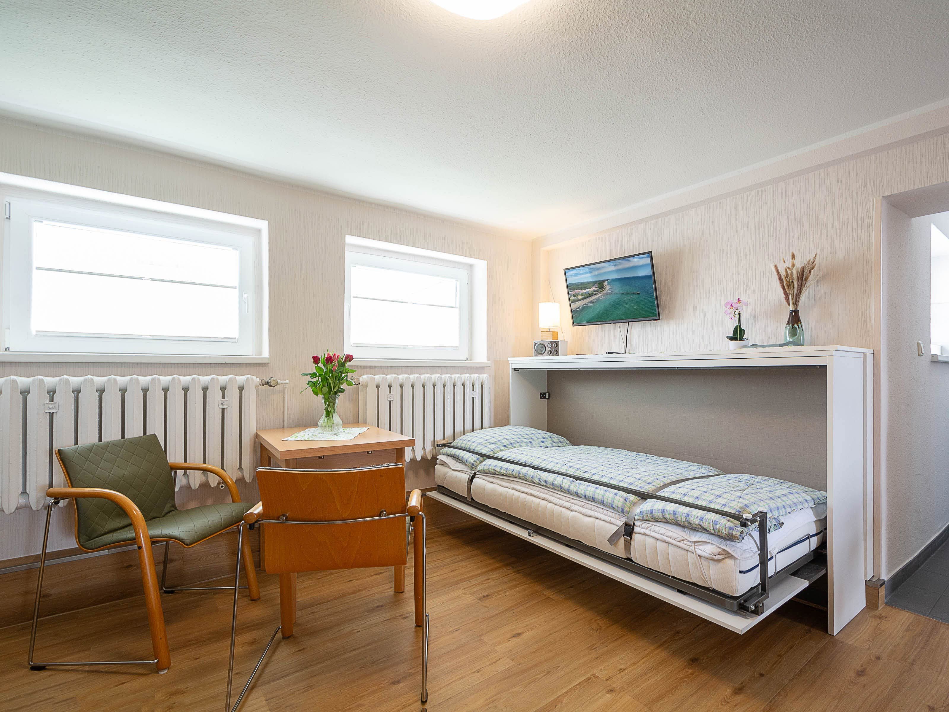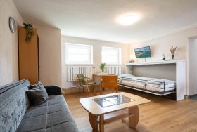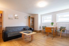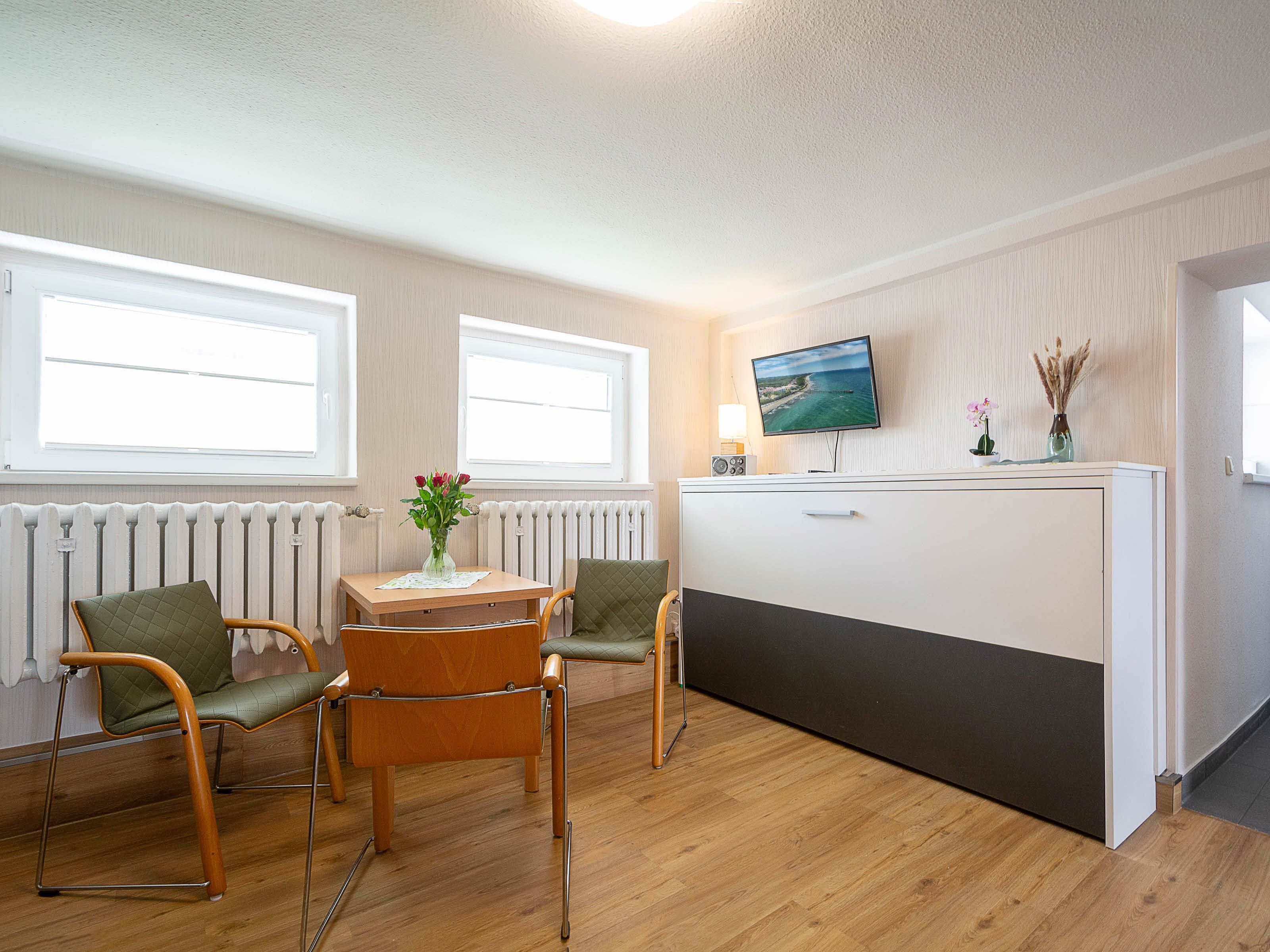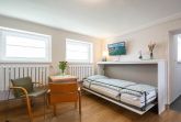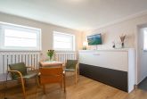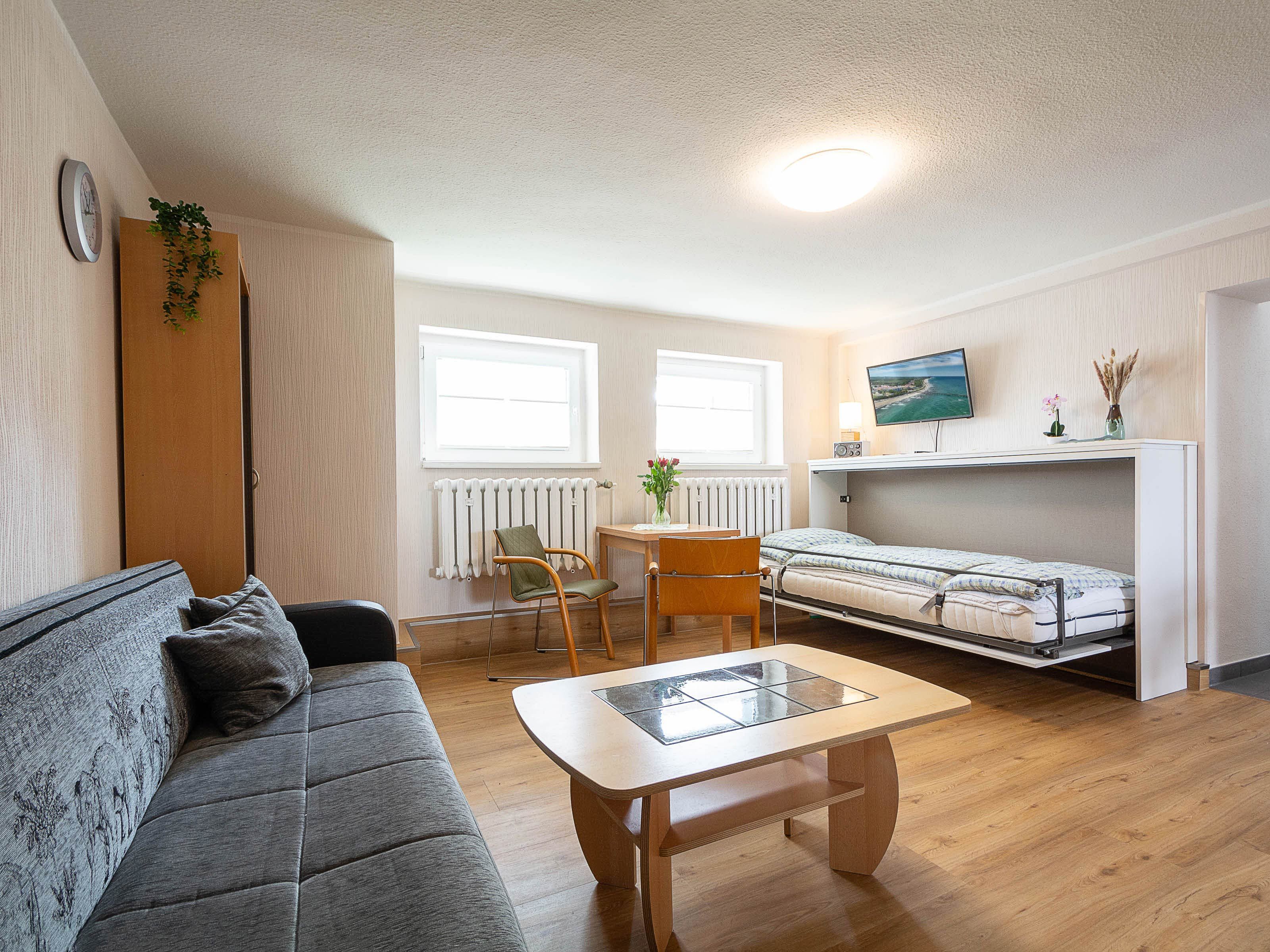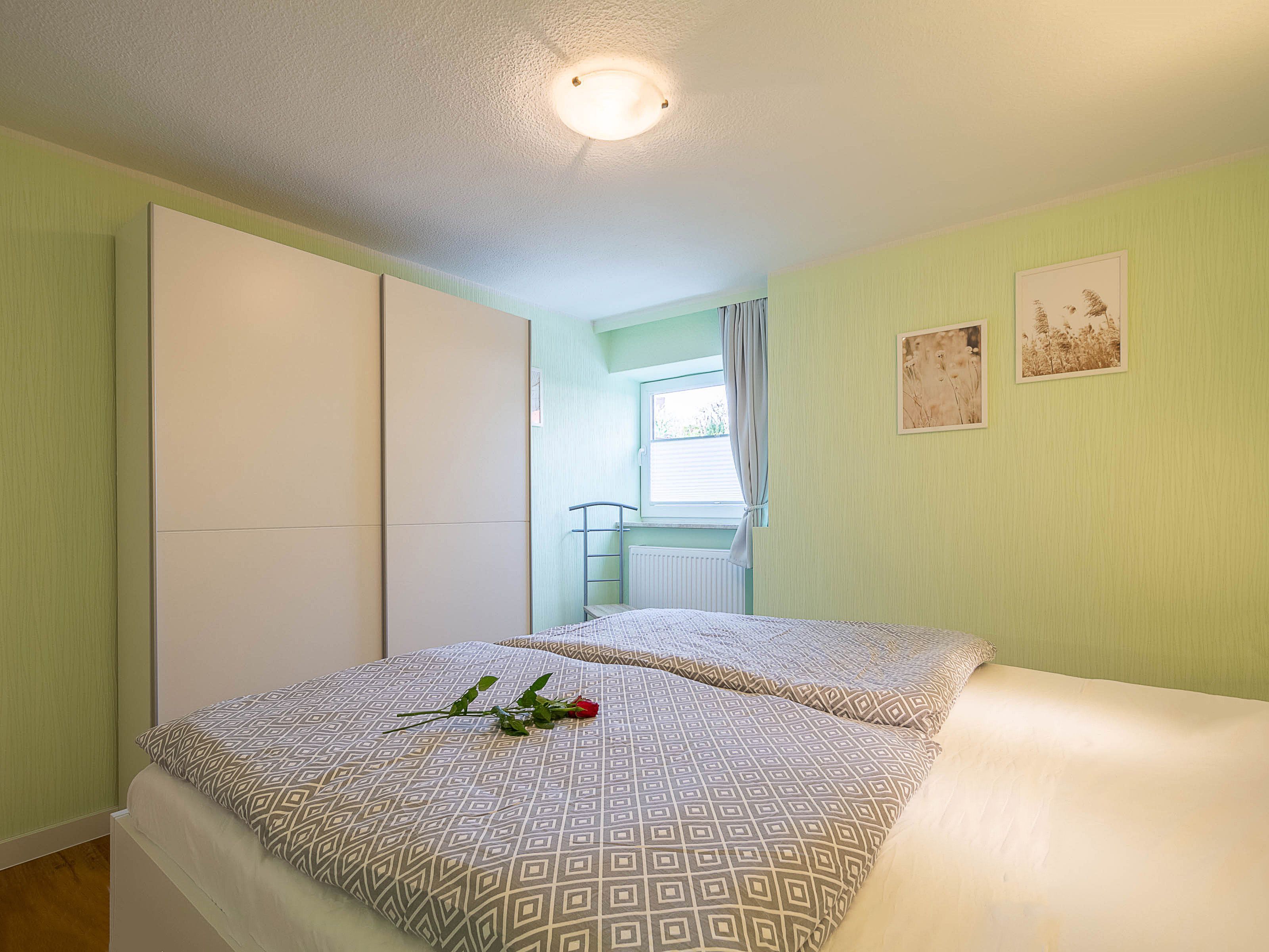 Sie wohnen in einer 2-Raum-Wohnung von ca. 45 qm Größe, die sich im Souterrain eines Einfamilienhauses befindet. Das Wohnzimmer ist ausgestattet mit einer bequemen Sitzgruppe, Essecke, Radio und Flachbild-TV sowie einem Schrankbett für eine dritte Person. Das Schlafzimmer ist ausgestattet mit einem großen Doppelbett und einem Kleiderschrank. In der kleinen separaten Küchenzeile (2021 neu eingebaut) finden Sie den 2-Platten-Herd, Mikrowelle, Kühlschrank, Kaffeemaschine, Toaster, Wasserkocher und vieles mehr vor. Das moderne geflieste Bad wurde im Frühjahr 2022 renoviert und ist ausgestattet mit einer ebenerdigen Dusche, WC und Handtuchheizung.