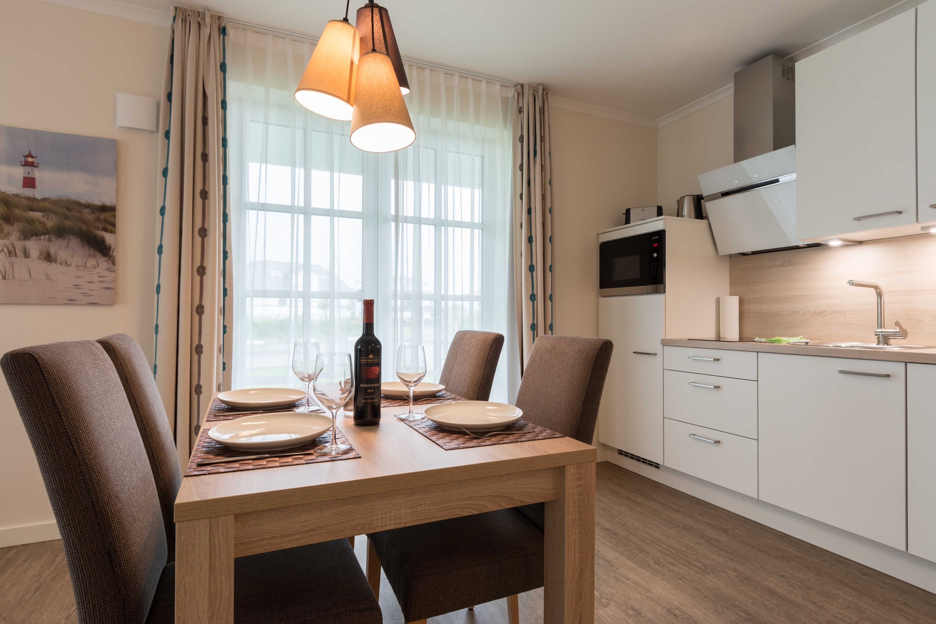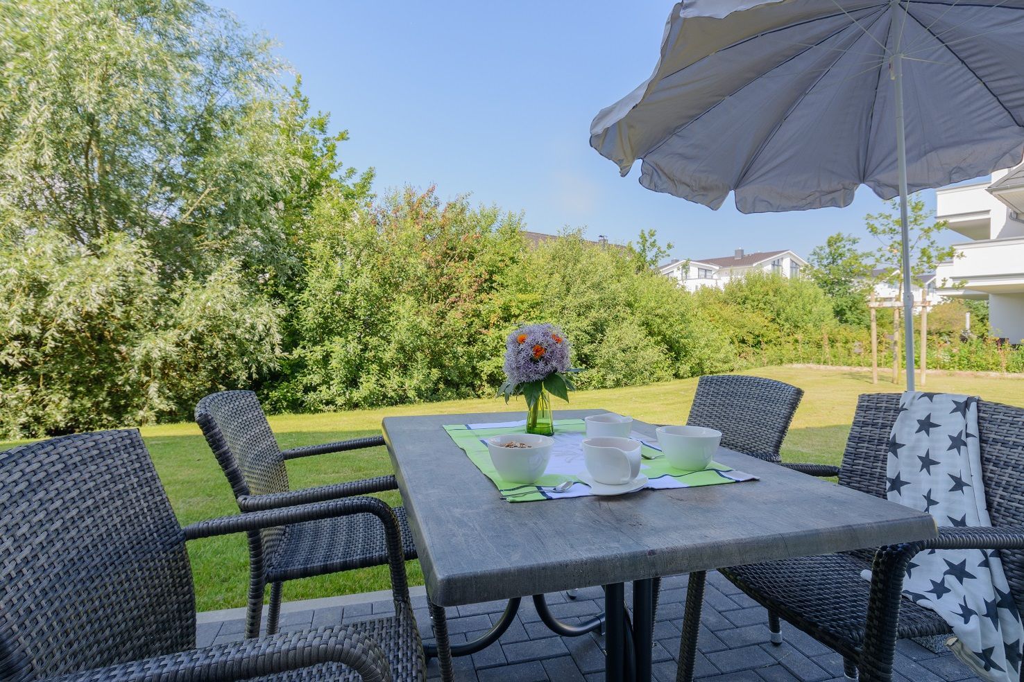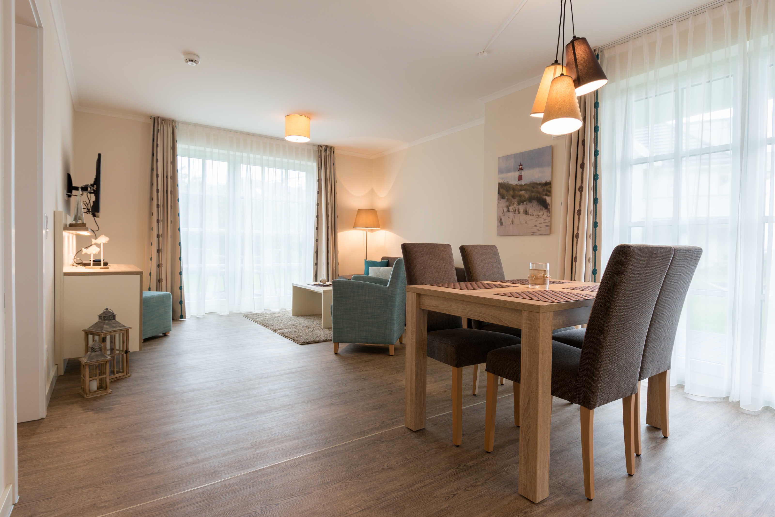 Die Wohnung verfügt über ein Wohn-Esszimmer inklusive offener Einbauküche, ein Schlafzimmer, ein Bad mit ebenerdiger Dusche, eine nach Norden ausgerichtete Terrasse sowie einen PKW-Stellplatz direkt am Haus. Vom Wohnbereich aus haben Sie Zugang zur Terrasse. Die Terrasse ist ausgestattet mit einem Tisch und vier Stühlen für gemütliche Stunden während Ihres Urlaubs. Der Wohnbereich mit Zugang zur Terrasse ist hell, lichtdurchflutet und geschmackvoll eingerichtet. Die bequeme Couchgarnitur mit Recamiere bietet eine weitere Schlafmöglichkeit (LF 150 x 200 cm). Ein Couchtisch sowie ein großer Esstisch mit vier Stühlen, ein Hocker, Flatscreen TV mit DVD-Player und eine kleine Musikanlage gehören ebenfalls zur Ausstattung. Die gut ausgestattete Küchenzeile beinhaltet einen Kühlschrank incl. integriertem 4*Tiefkühlfach, 2-Platten-Glaskeramikkochfeld mit Dunstabzugshaube , Mikrowelle mit Grillfunktion, Kaffeemaschine, Toaster sowie Wasserkocher. Geschirr und Gläser sind in ausreichender Zahl vorhanden. Im Schlafzimmer befindet sich ein komfortables Boxspringbett (180 x 200 cm) mit zwei Einzel- Bandscheiben-Federkernmatratzen, ein geräumiger Kleiderschrank und ein weiterer Flat-TV. An kühlen Herbst- und Wintertagen sorgt in allen Räumen eine Fußbodenheizung für Wärme und Gemütlichkeit.