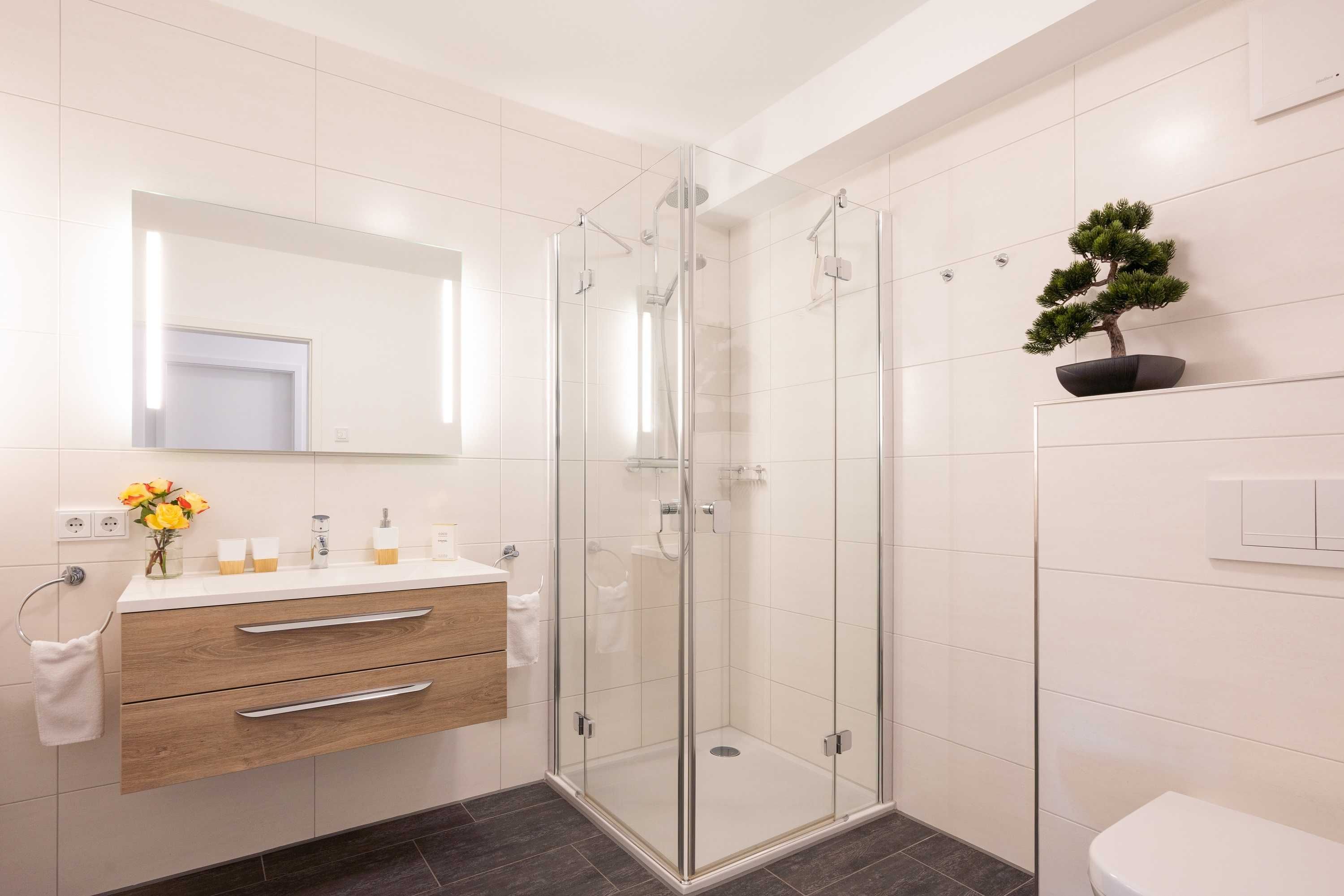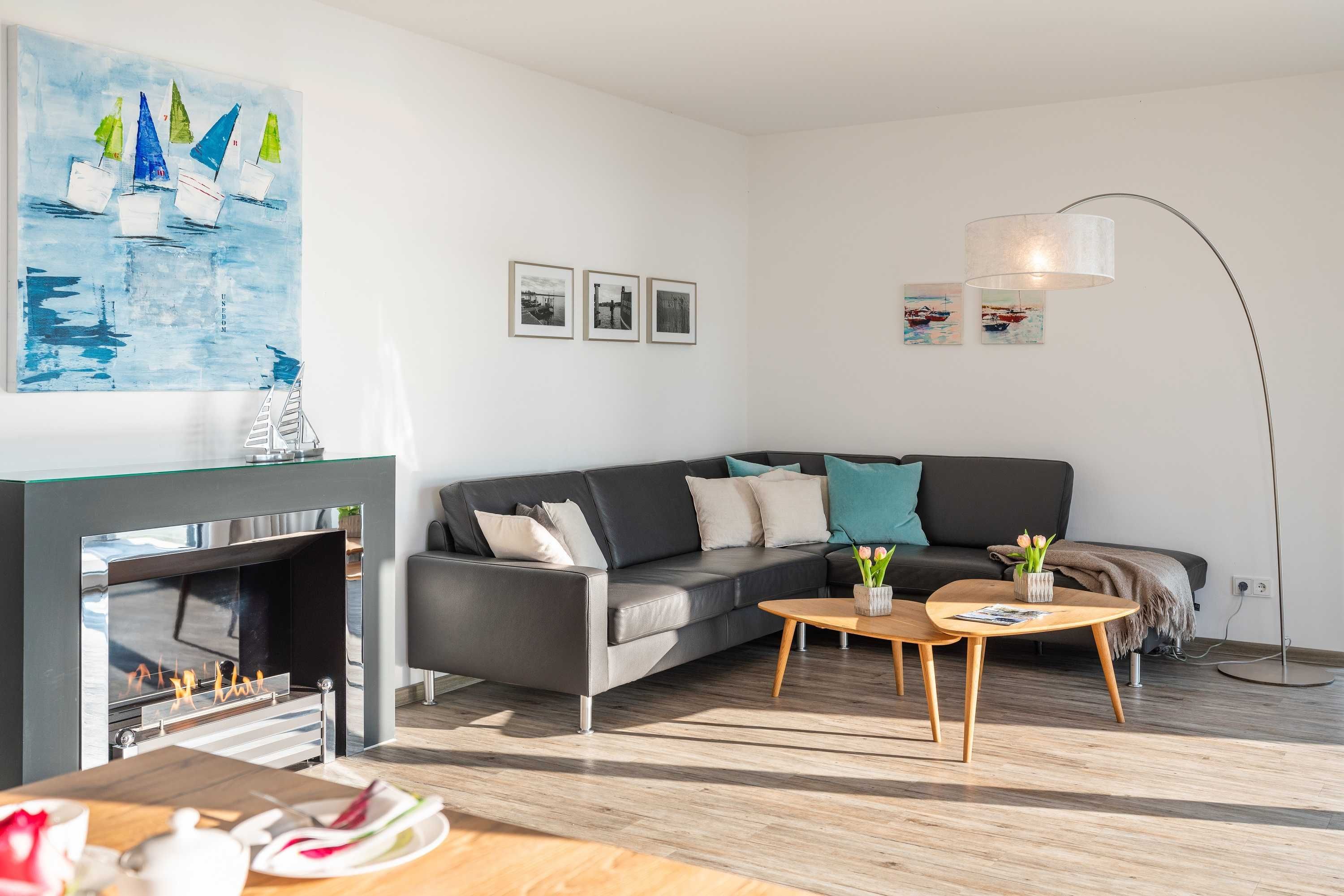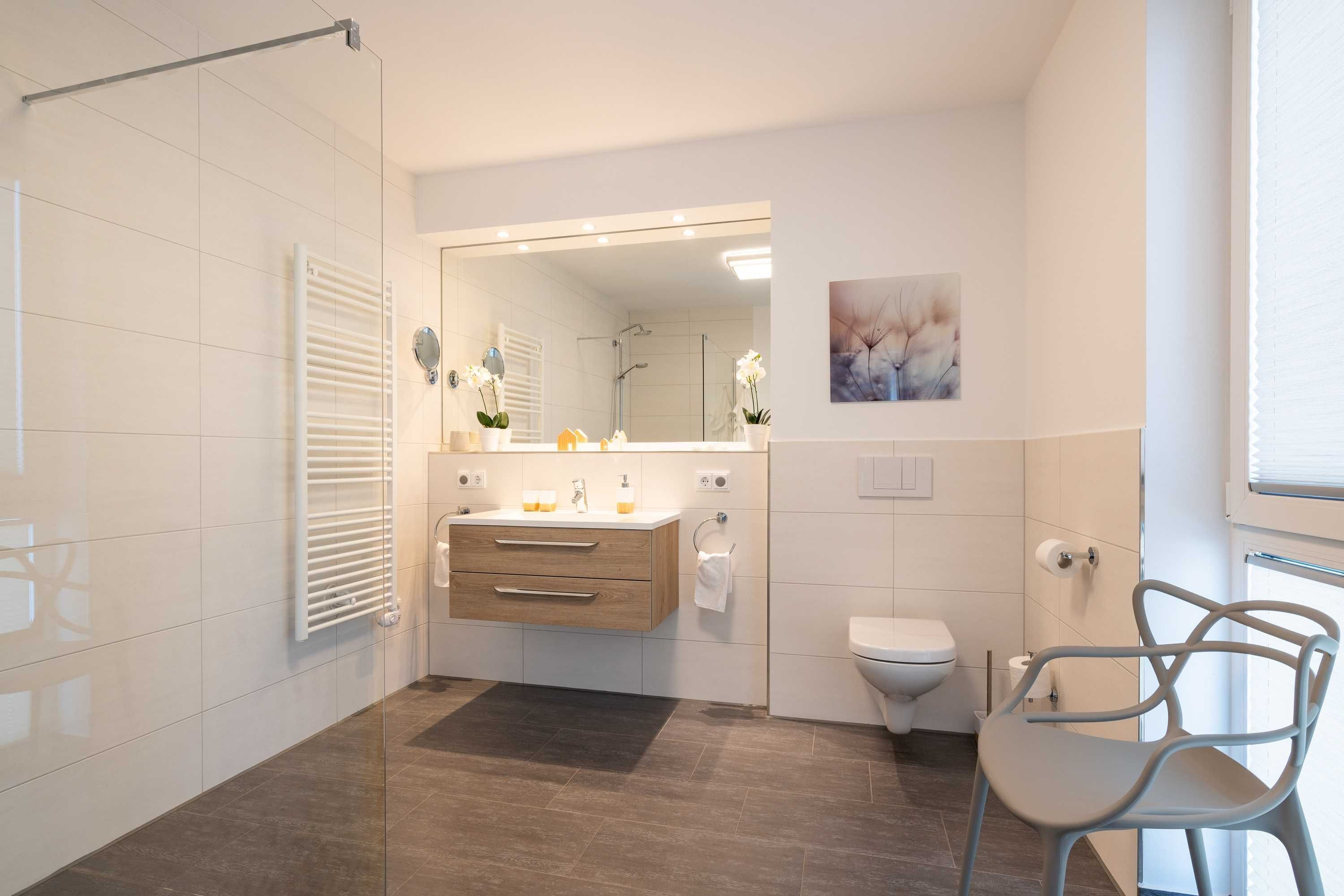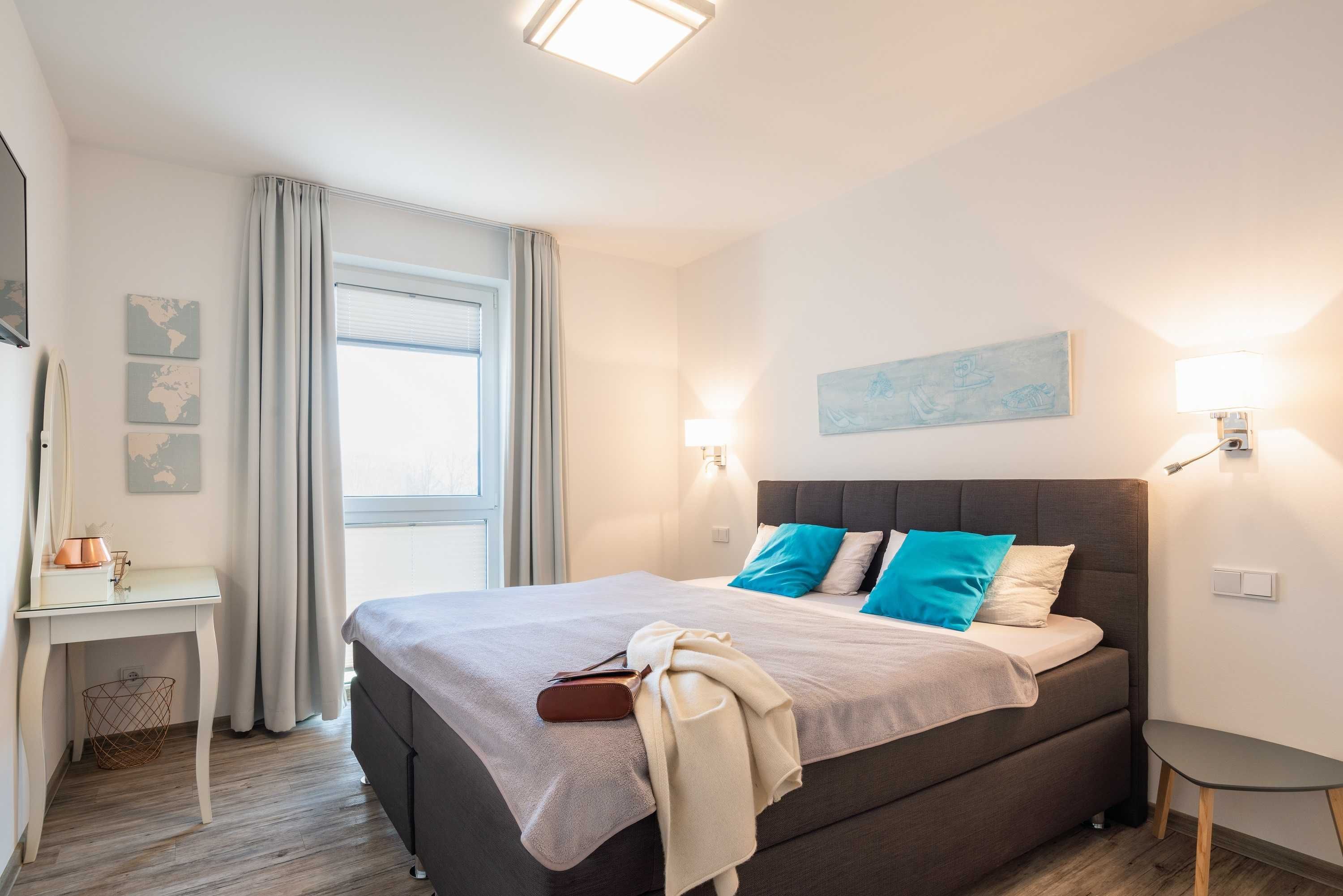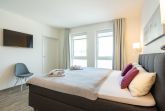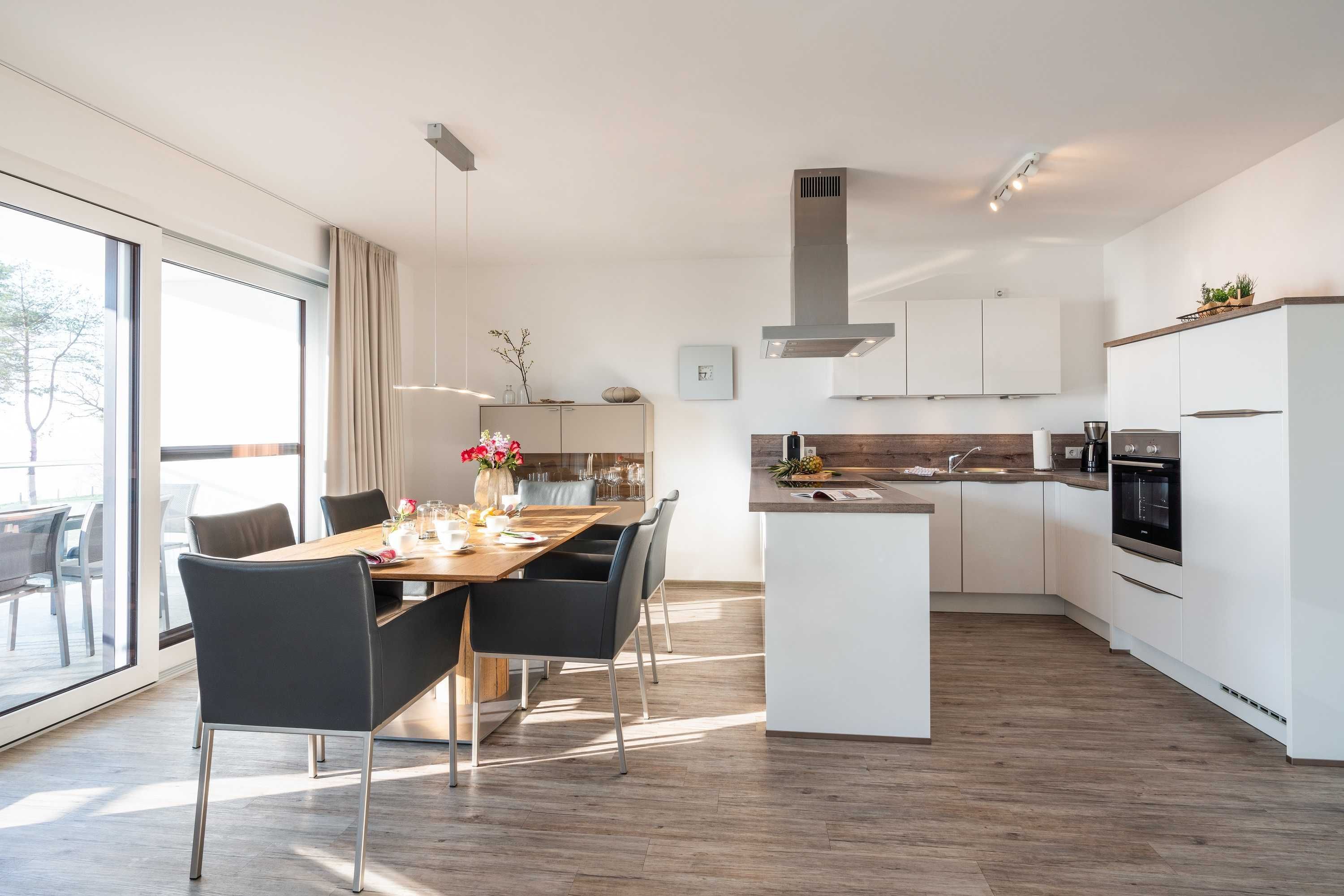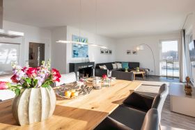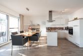 Diese luxuriöse 4-Zimmer-Wohnung im ersten Obergeschoss von Haus 2 (Aufzug vorhanden) mit Platz für maximal 6 Personen sowie einem Kleinkind bis 2 Jahre im Babybett verfügt über eine Wohnfläche von 119 m² und hat 3 Schlafzimmer sowie 2 voll ausgestattete Duschbäder. Die große Sonnenterrasse mit 17 m² liegt in idealer Süd-Ausrichtung. Die Wohnung ist modern eingerichtet mit offenem Wohn-Essbereich, großem Esstisch, Ledersofa sowie Flat-TV (inkl. Sky-Abo). Die hochwertig ausgestattete Küche, offen zum Wohnbereich, lässt keine Wünsche offen. Erholsamer Schlaf in den beiden Schlafzimmern mit Boxspringbetten und Smart-TV ist garantiert. Im dritten Schlafzimmer befindet sich ein bequemes Schlafsofa (Liegefläche: 1,80 x 2,00 m) und ein Flat-TV. Das Badezimmer en Suite ist mit einer begehbaren Dusche ausgestattet. Auf dem großen, überdachten Sonnenbalkon mit Essgruppe und zwei Relax-Sesseln, Fußhockern sowie einem Sonnenschirm können Sie die Seele baumeln lassen.