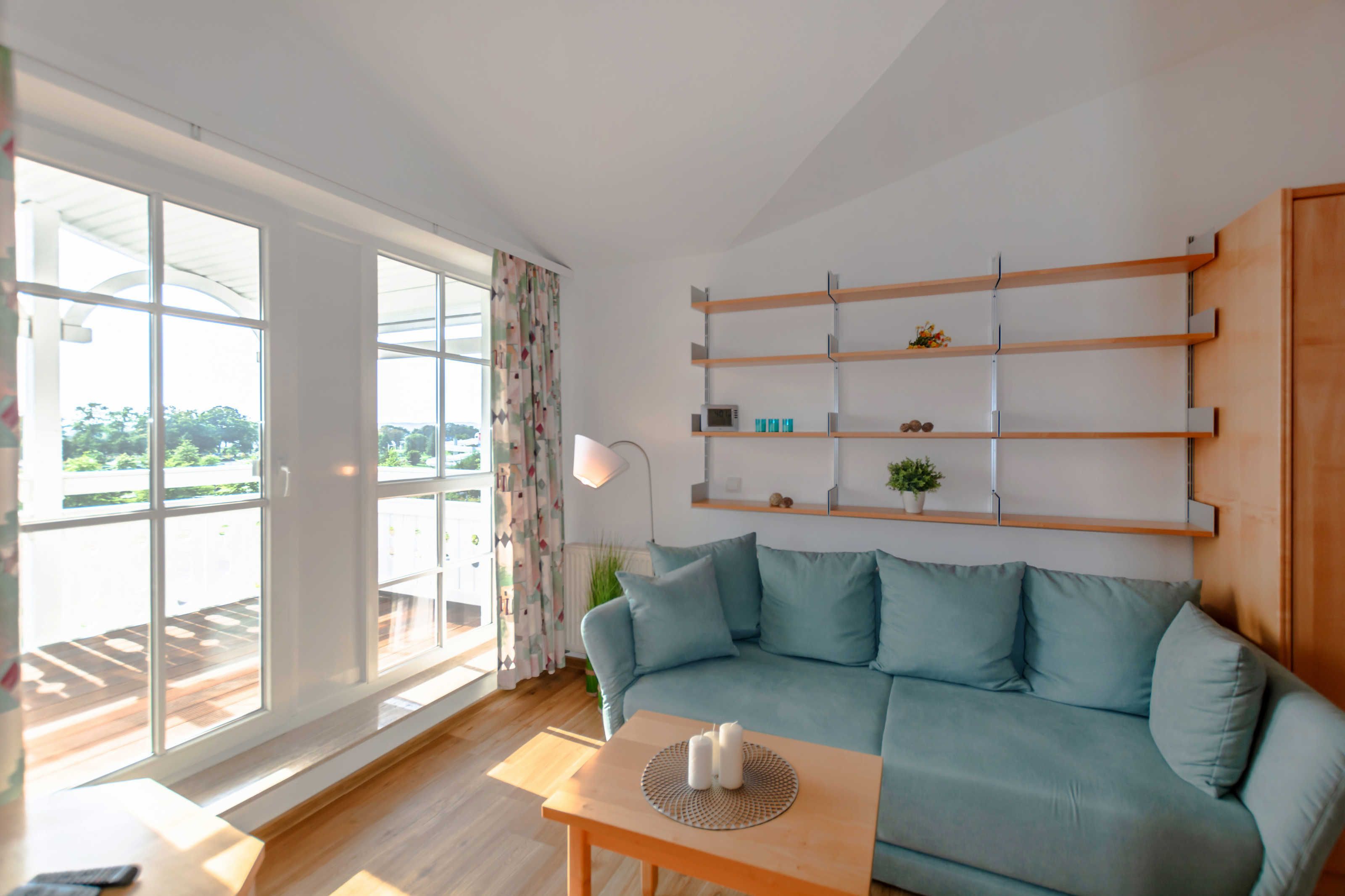 Helles Ferienappartement im Ostseebad Sellin auf Rügen mit 4 Schlafplätzen . ein Schlafzimmer mit Doppelbett und eine Schlafcouch als Aufbettung
