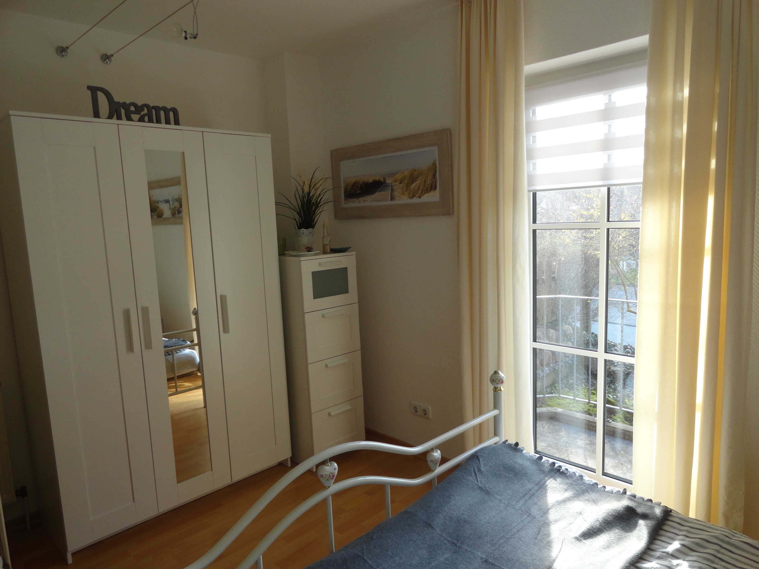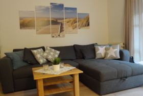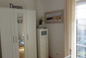Die 2-Zimmer-Ferienwohnung Strandglück hat ca.46qm Wohnfläche für max. 3 Personen und besteht aus: Wohnzimmer mit Couchgarnitur (Schlafcouch für 1 Person) und Essbereich; Schlafzimmer mit Doppelbett (2x90x200 cm) und Kleiderschrank; Küchenzeile im Flurbereich mit 4-Kochzonen-Ceranfeld, Minibackofen und Geschirrspüler; Bad mit Wanne (Duschmöglichkeit) und WC; möblierte Terrasse zur Süd-Ostseite und Balkon zur Westseite; PKW-Stellplatz; abschließbare Fahrradunterstellmöglichkeit, kostenfreies WLAN in der Wohnung.