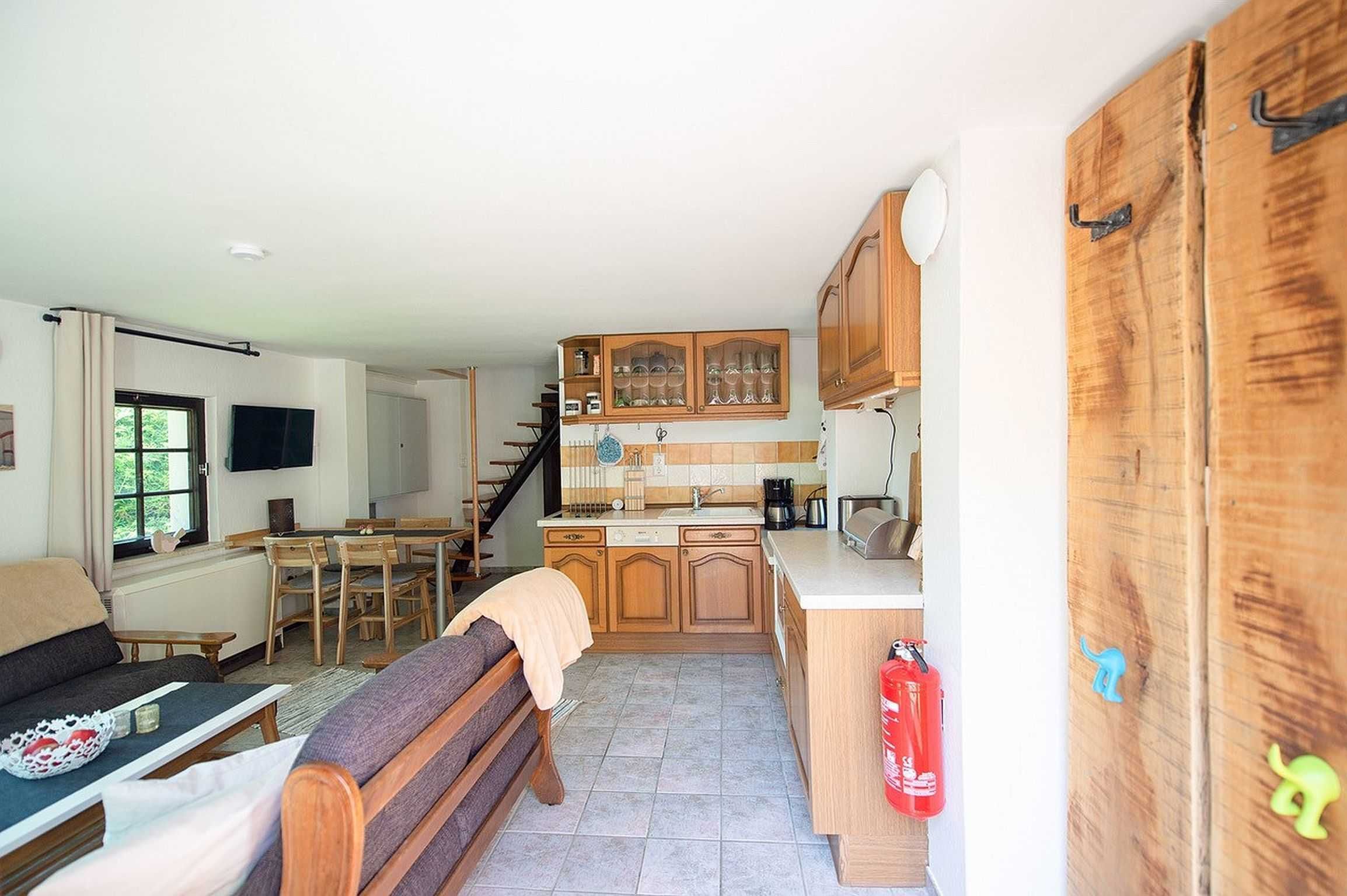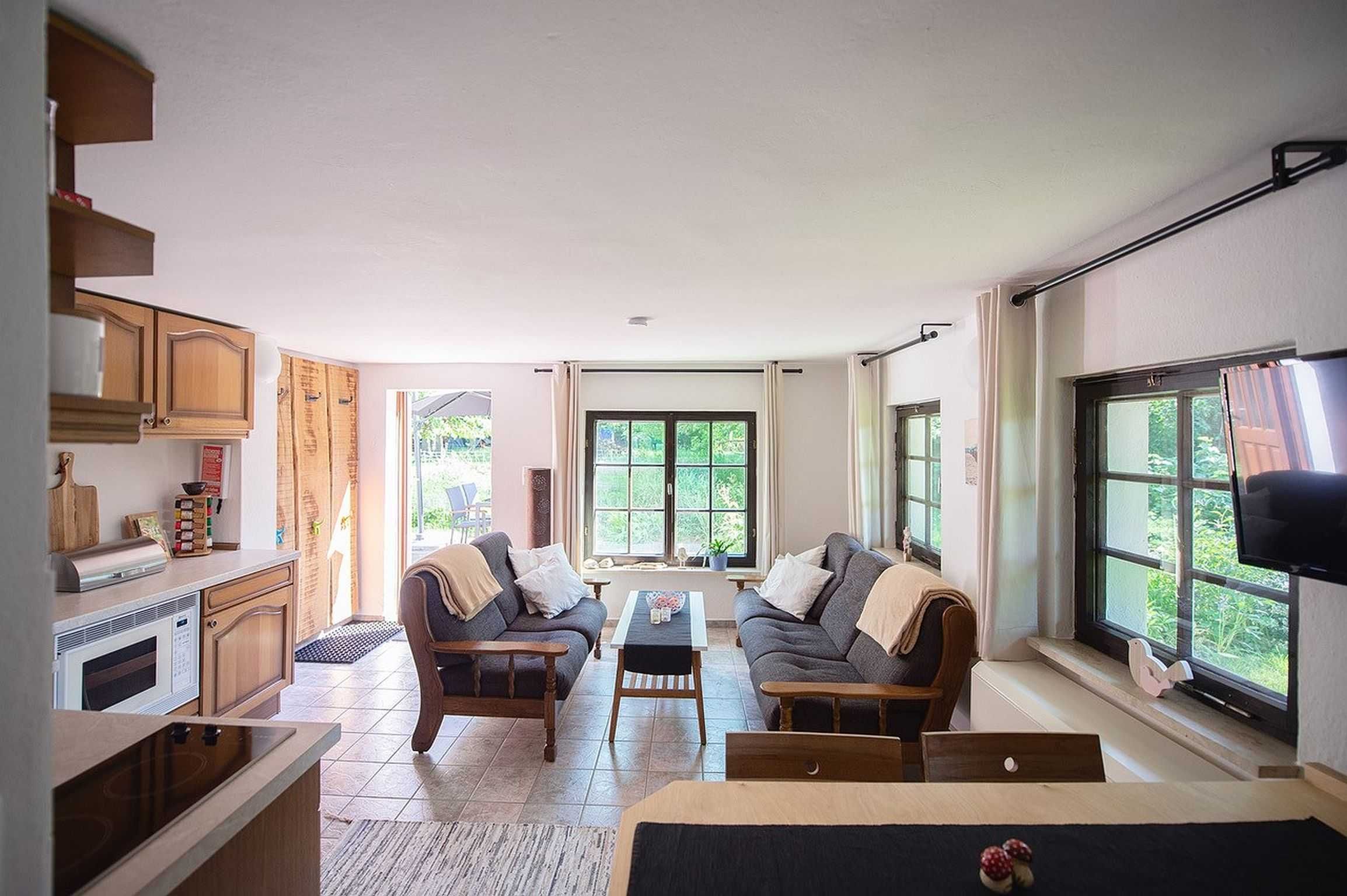 Rustikales Ferienhaus mit Terrasse und Garten auf separatem und eingezäuntem Grundstück. Mit 2 Schlafräumen, Duschbad/WC, Wohnküche mit direktem Terrassenzugang. Möblierte Sonnenterrasse und Grillkamin. PKW-Stellplatz und Fahrradabstellplatz am Haus. Vom separaten und eingezäunten Gartengrundstück freier Blick auf den gepflegten Kleinbauernhof mit Schafen, Hühnern und Enten, Hund und Katze der Gastgeberfamilie.