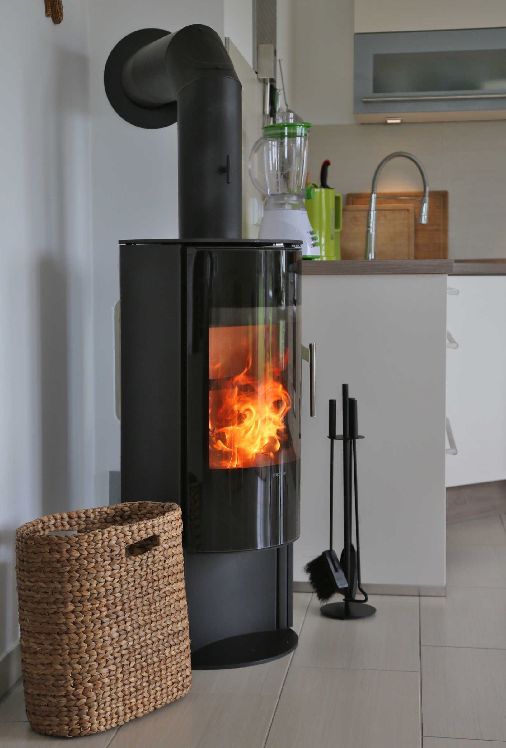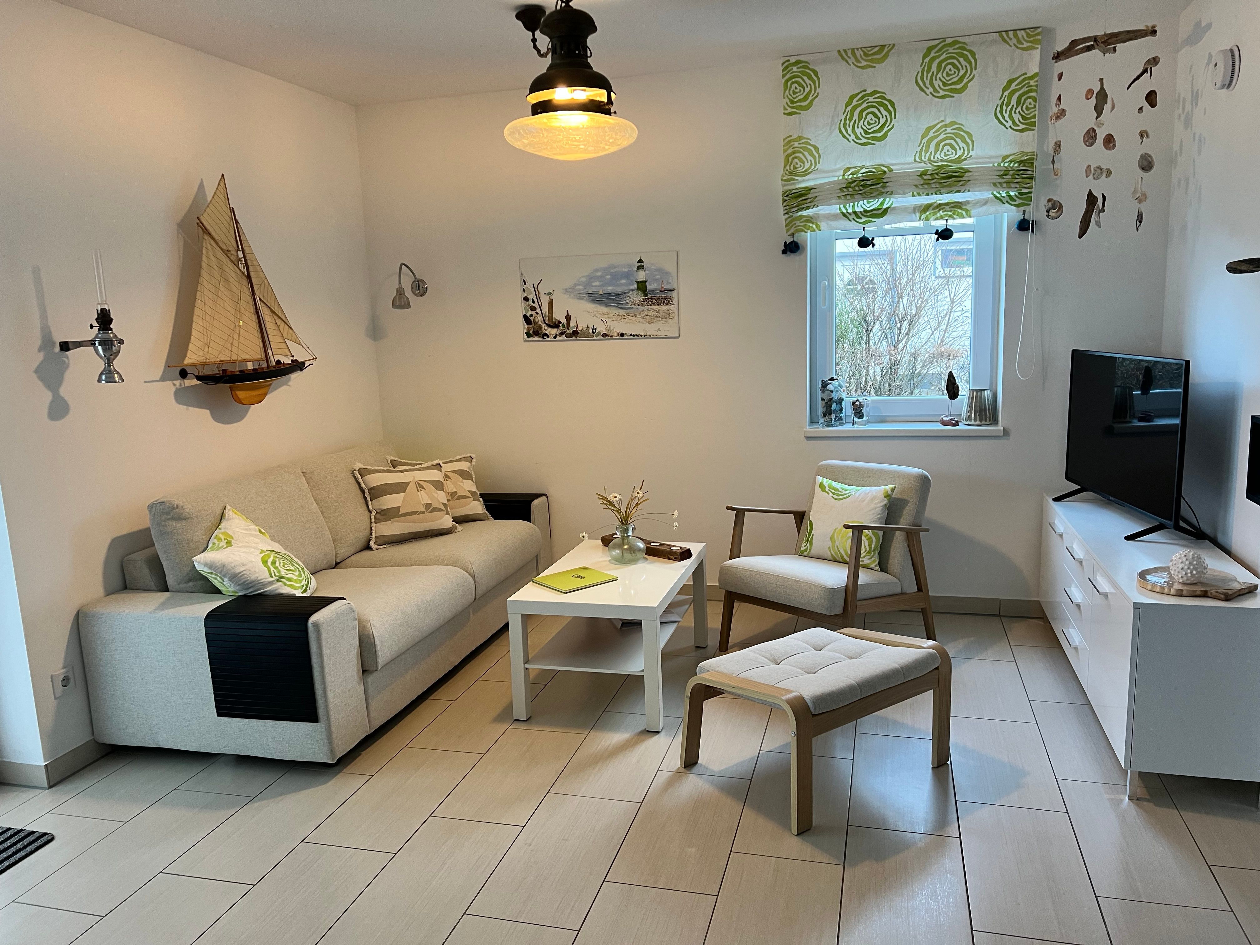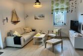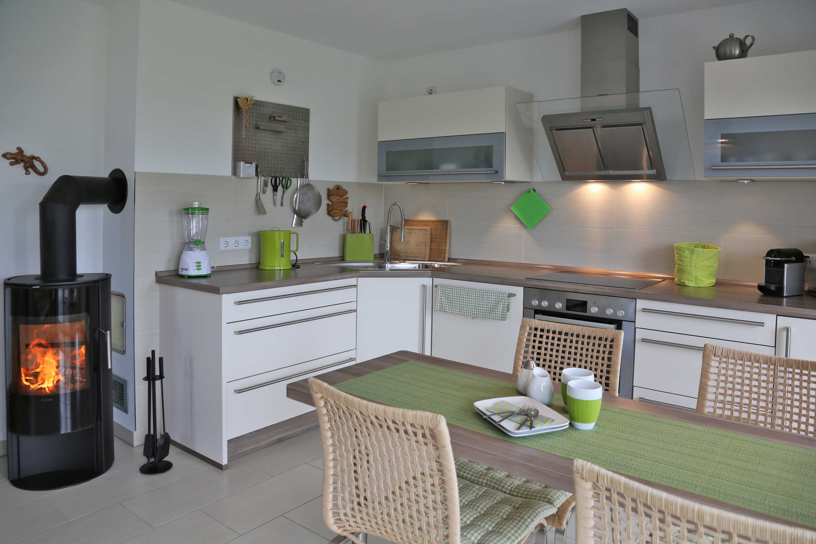 Freundlich und hell präsentiert sich der offene Wohn- und Essbereich mit Ecksofa, TV inkl. Radio, DVD-Player und als Highlight einem Kaminofen mit Glasfenster für romantische Abende. Von hier aus geht es zur Terrasse, die zur Westseite ausgerichtet ist. Genießen Sie den Sonnenuntergang mit Blick auf den Kurpark, z.B. bei einer Flasche Wein. Im Frühjahr und Herbst können Sie von hier aus die Zugvögel beobachten. Moderne Gartenstühle und ein Gartentisch komplettieren unsere Ausstattung. Die Küche ist mit hochwertigen Küchengeräten, Induktionsherd, Backofen, Spülmaschine, Mikrowelle, Wasserkocher, Toaster, einer „normalen“ Kaffeemaschine, Kühlschrank