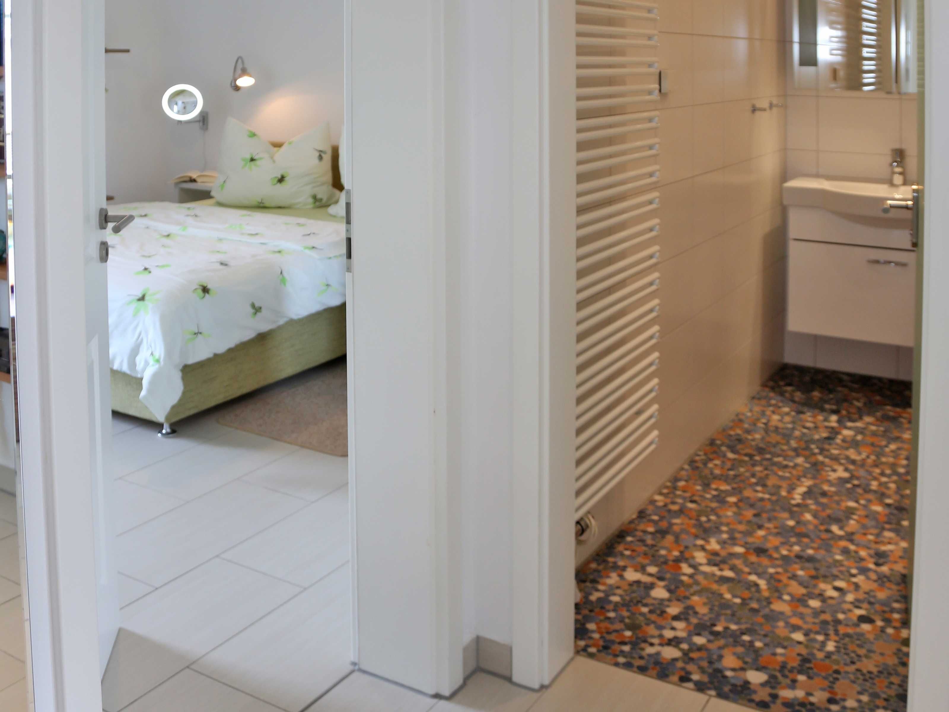 mit Gefrierfach sowie ausreichendem Eß- und Kochgeschirr ausgestattet. Das Badezimmer hat eine ebenerdige geräumige Dusche, Handtuchhalterung mit Sommerheizung, Fön, Waschbecken und Spiegelschrank.