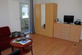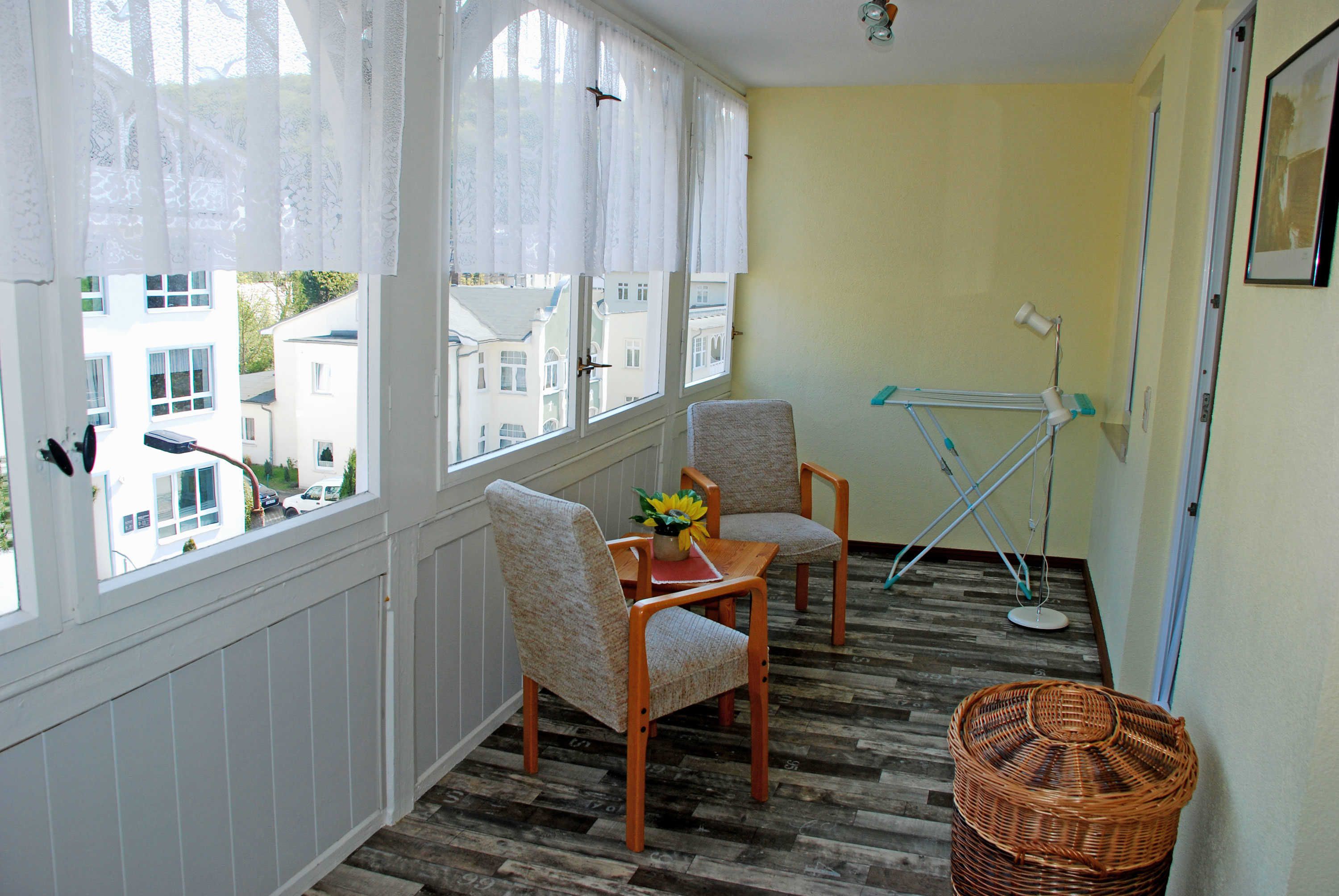 Das Schlafzimmer ist mit einem bequemen Doppelbett mit Nachttischen und Leselampen sowie einem Kleiderschrank ausgestattet. Bei Ihrer Anreise sind die Betten bereits mit Bettwäsche bezogen und es liegen für Sie frische Handtücher bereit. Zur dieser Wohneinheit gehört auch eine sehr große verglaste Veranda (Loggia) mit einem zusätzlichem Essbereich und schönem Ausblick. Diesen können Sie entweder aus dem Wohnbereich bzw. Schlafbereich betreten. Hier können Sie Ihr Frühstück einnehmen oder den Abend bei einem Glas Wein entspannt ausklingen lassen.