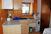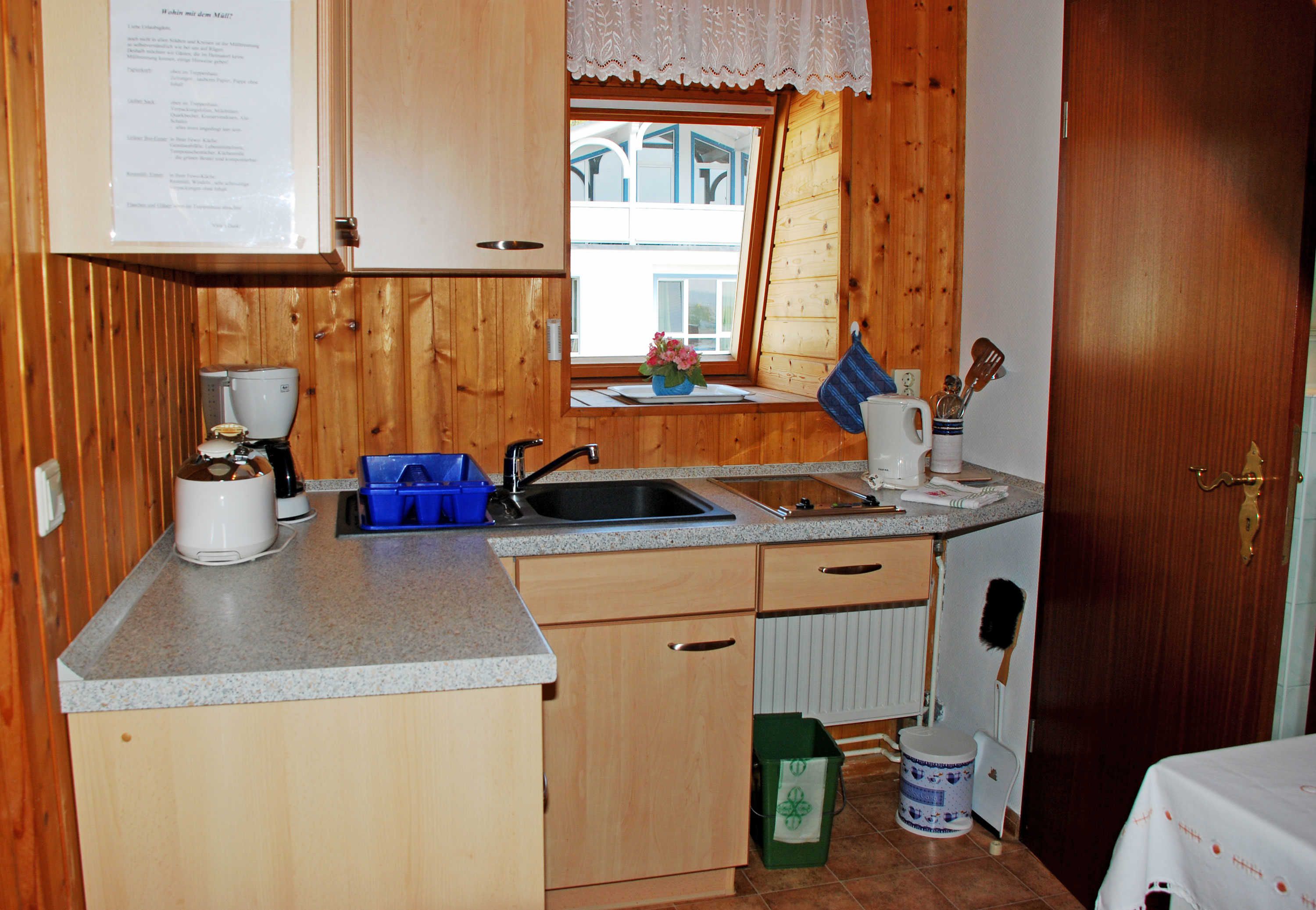 Die offene Küche ist mit einem Herd, Wasserkocher, Kaffeemaschine, Toaster und Kühlschrank komplett ausgestattet. Hier steht in einer Nische eine Liege, die auf Wunsch auch für ein Kind bis 12 Jahre zusätzlich aufgebettet werden kann.