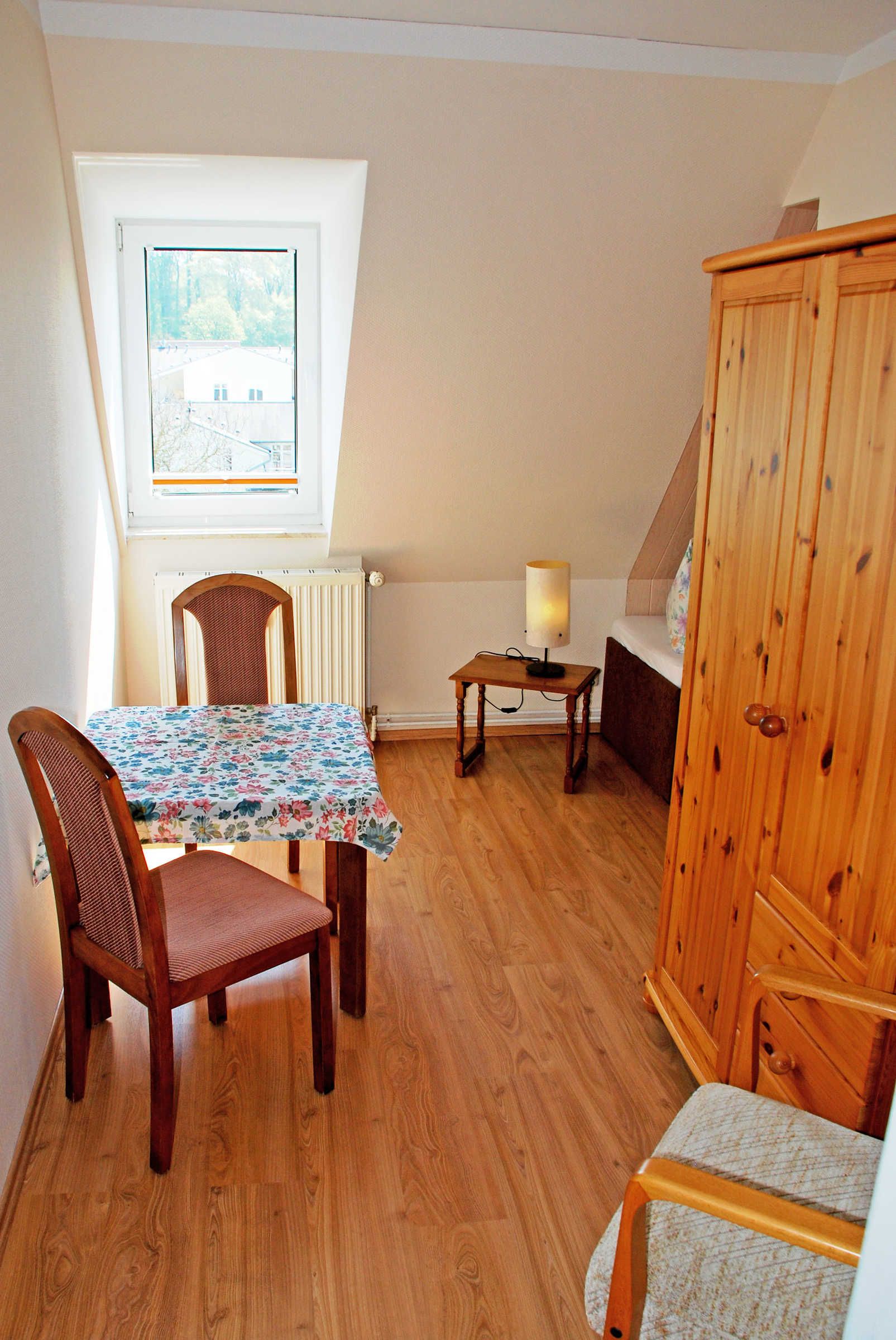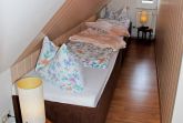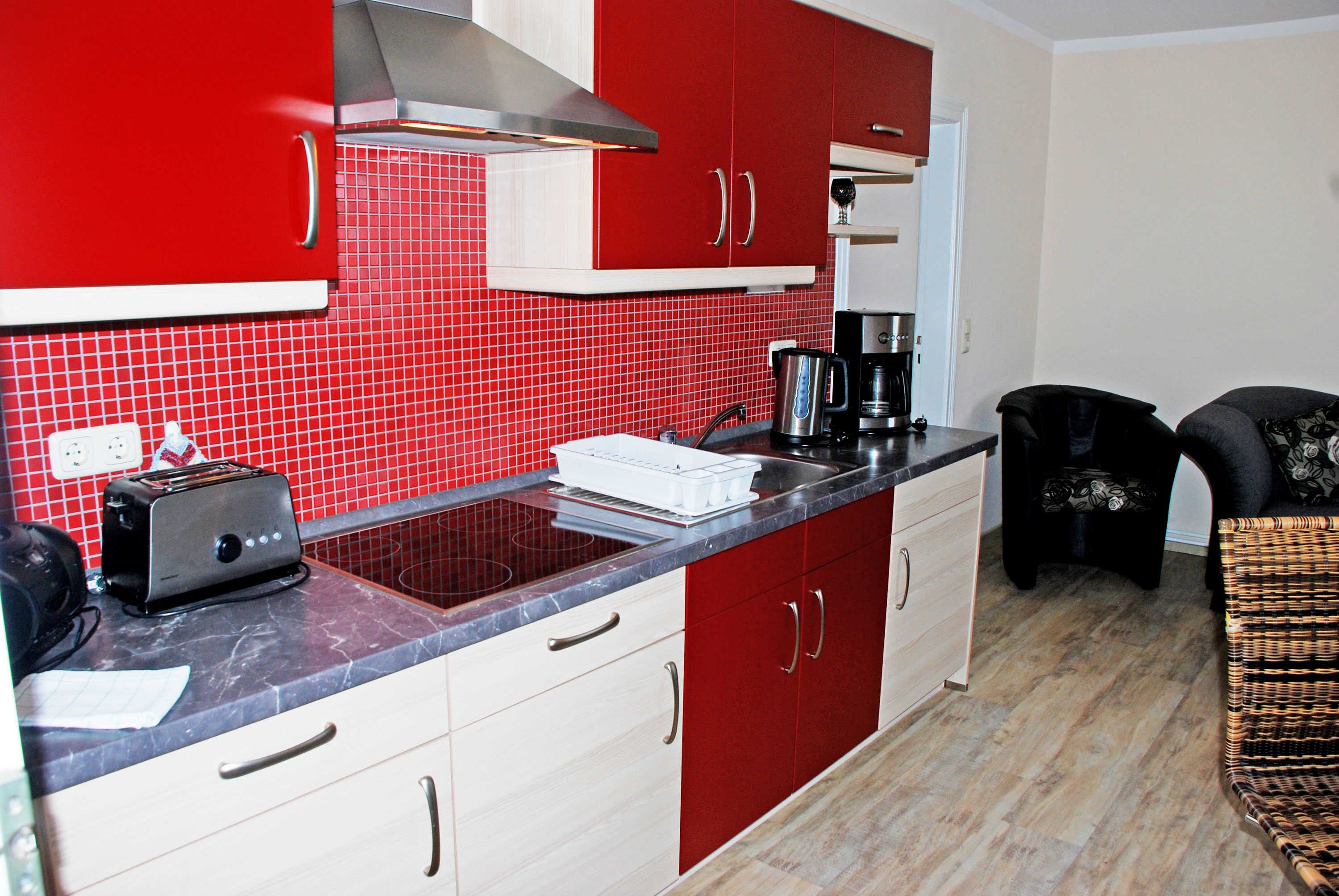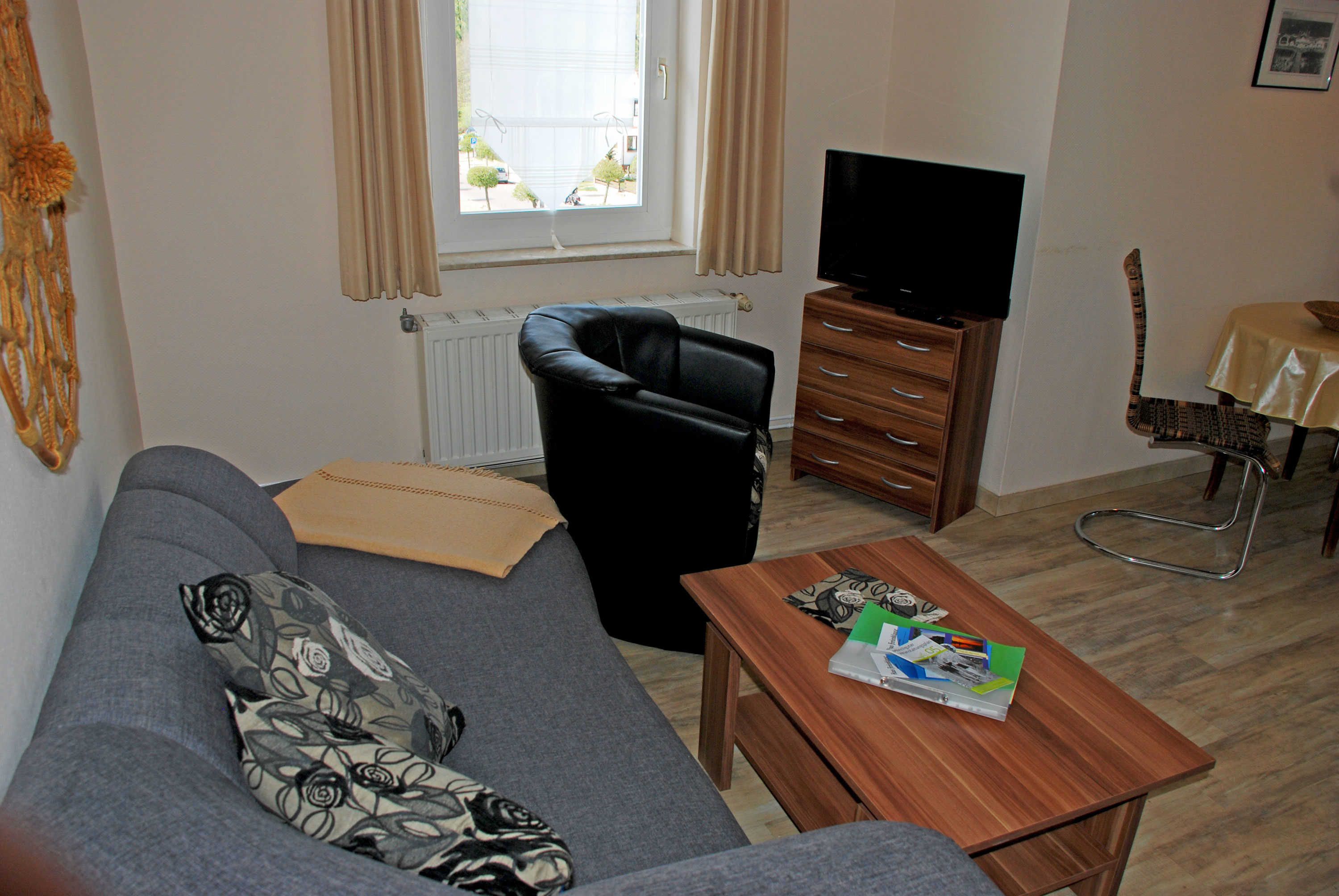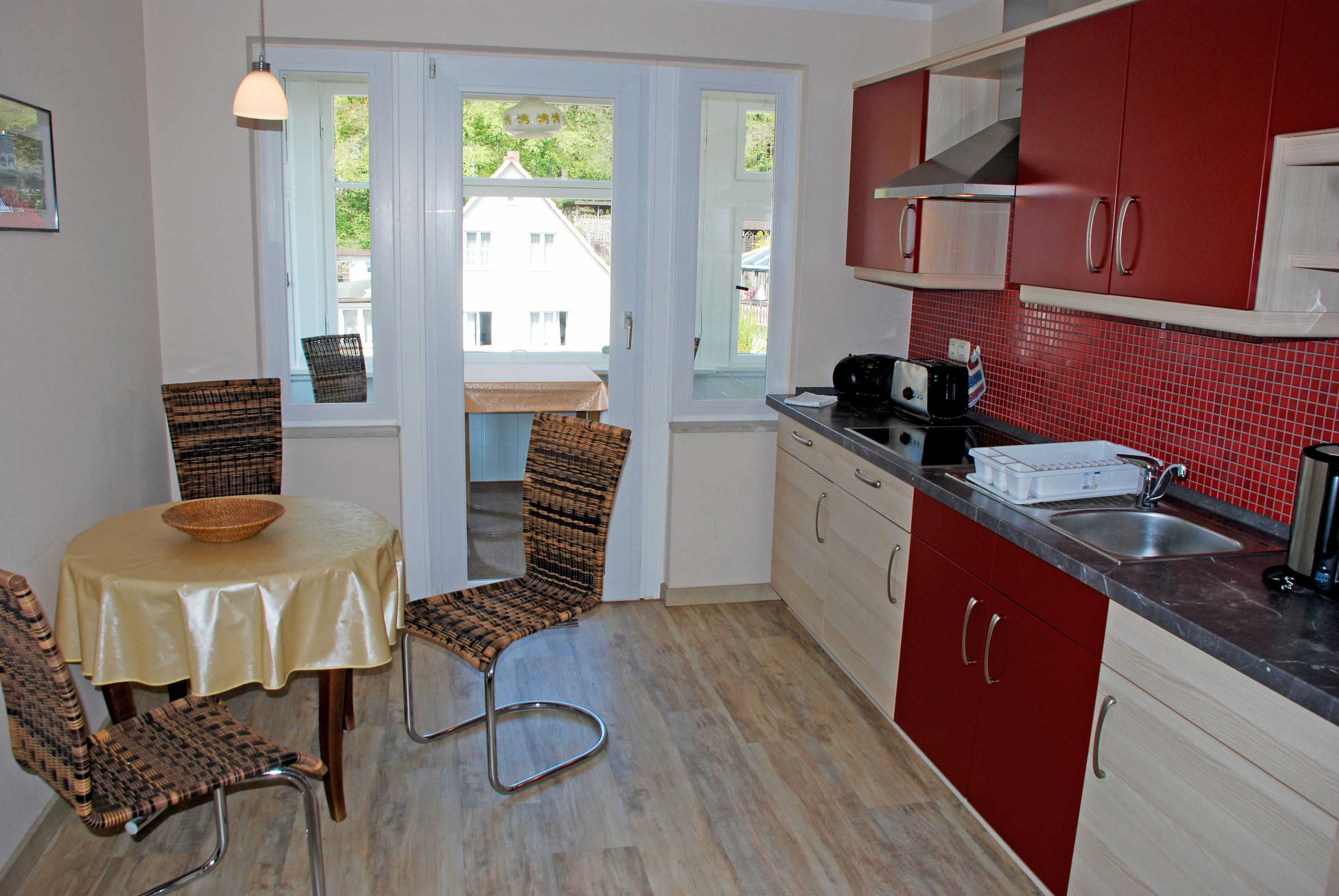Unsere Ferienwohnung Mönchgut befindet sich im 2. Obergeschoss, verfügt über einen separaten Eingangsbereich mit Flur und Garderobe und WLAN-Internet. Diese Wohneinheit ist ca. 55 qm groß. Sie bietet Platz für maximal 4 Gäste, wurde modern und liebevoll eingerichtet. Im Wohnraum befinden sich eine bequeme Sitzcouch mit Tisch; zwei Ledersesseln und ein Flachbild-TV-Gerät. Die Küchenzeile ist mit einem 4-Zonen-Ceranfeld-Herd, Abzugshaube, Wasserkocher, Kaffeemaschine, Toaster und Kühlschrank mit Gefrierfach komplett ausgestattet. Hier befindet sich auch ein Esstisch mit Sitzgelegenheiten.