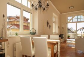 Die charmante Appartementanlage in der Strandstraße 14 wurde 1998 im Stil der Bäderarchitektur mit vielen interessanten Holzkonstruktionen erbaut. Die stilvoll gestalteten 2- 3-Zimmerwohnungen sind 45 m² bis 75 m² groß, teilweise in zwei Ebenen mit ausgebautem Dachgeschoss und sind für zwei bis fünf Personen geeignet. Die Wohnungen verfügen über ein Schlafzimmer mit Doppelbett, teilweise mit Kinderzimmer/ Gästezimmer, Wohnzimmer mit offener Küchenzeile, Kabel-TV und Stereoanlage, Duschbad/ WC sowie Terrassen/ Balkone/ Loggias. Unseren Gästen stehen eine Waschmaschine und ein Wäschetrockner gegen Gebühr zur Verfügung.