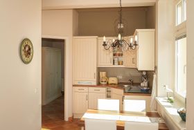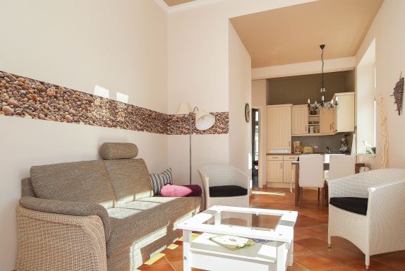 Sie wohnen in einer 48m² großen 2-Raum-Ferienwohnung, die sich im 2. Obergeschoss befindet. Sie betreten die Wohnung über eine Terrasse, auf die Sie über die Rückseite des Hauses per Außentreppe gelangen. Es begrüßt Sie ein heller freundlicher Wohnraum mit gemütlicher Schlafcouch, Flachbild-TV und Stereoanlage sowie einem Esstisch. Dem Wohnraum schließt sich die offene Küchenzeile an, welche ausgestattet ist mit Herd und Geschirrspüler, Kaffeemaschine und Wasserkocher sowie allen wichtigen Küchenutensilien. Vom Schlafraum mit Doppelbett betreten Sie den Balkon in Richtung Osten. Diese Wohnung wurde 2010 komfortabel renoviert.