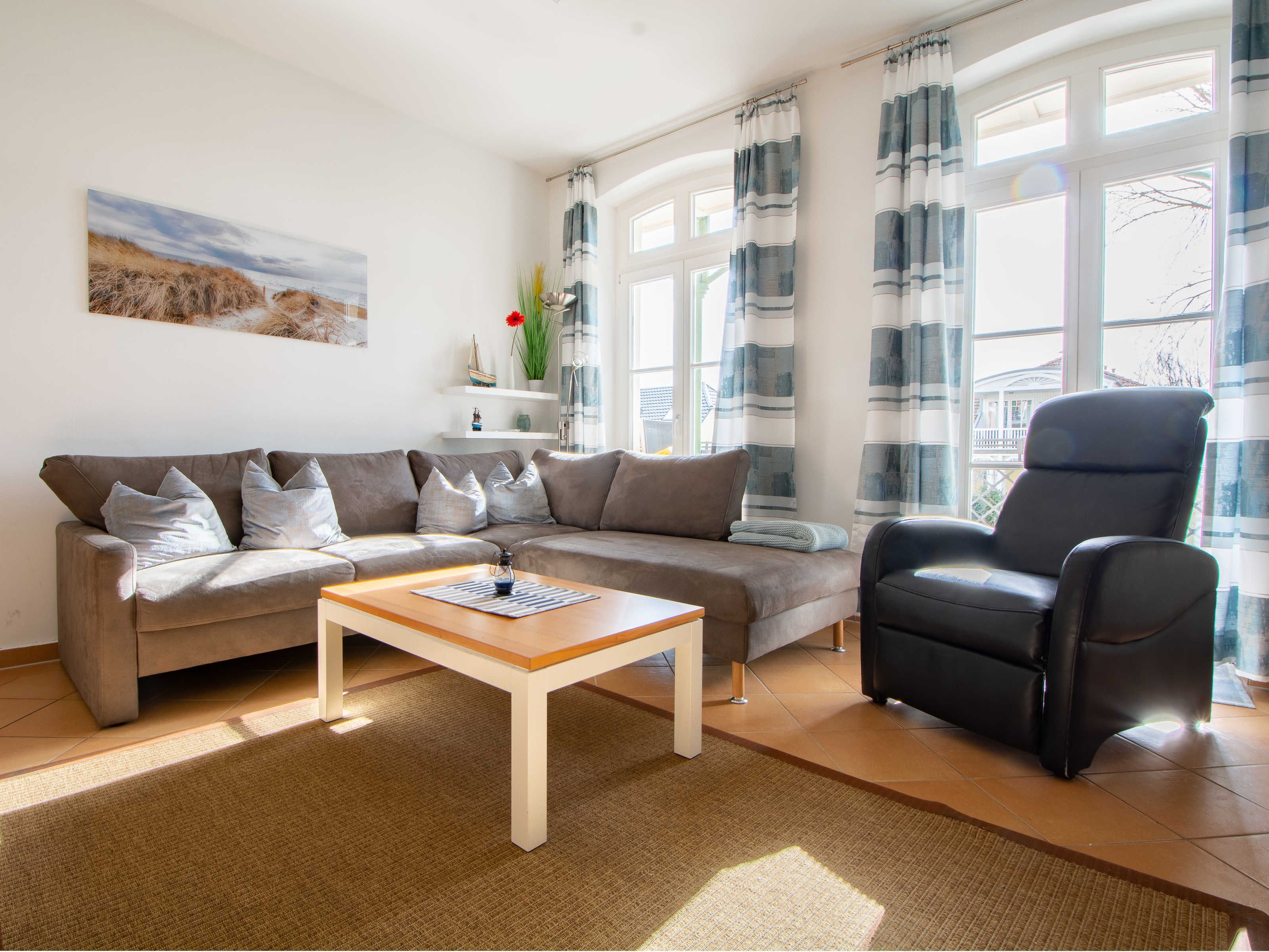 Herzlich willkommen in der Wohnung Nr. 10 im Waldhaus! Sie wohnen in einer 53 m² großen 3-Raum-Ferienwohnung, die sich im 1. Obergeschoss befindet. Im hellen freundlichen Wohnraum befinden sich eine gemütliche Eckcouch, 43-Zoll-HD-TV mit Radio sowie der Essplatz. Von hier aus gelangen Sie auf einen möblierten Balkon, der nach Osten ausgerichtet ist.