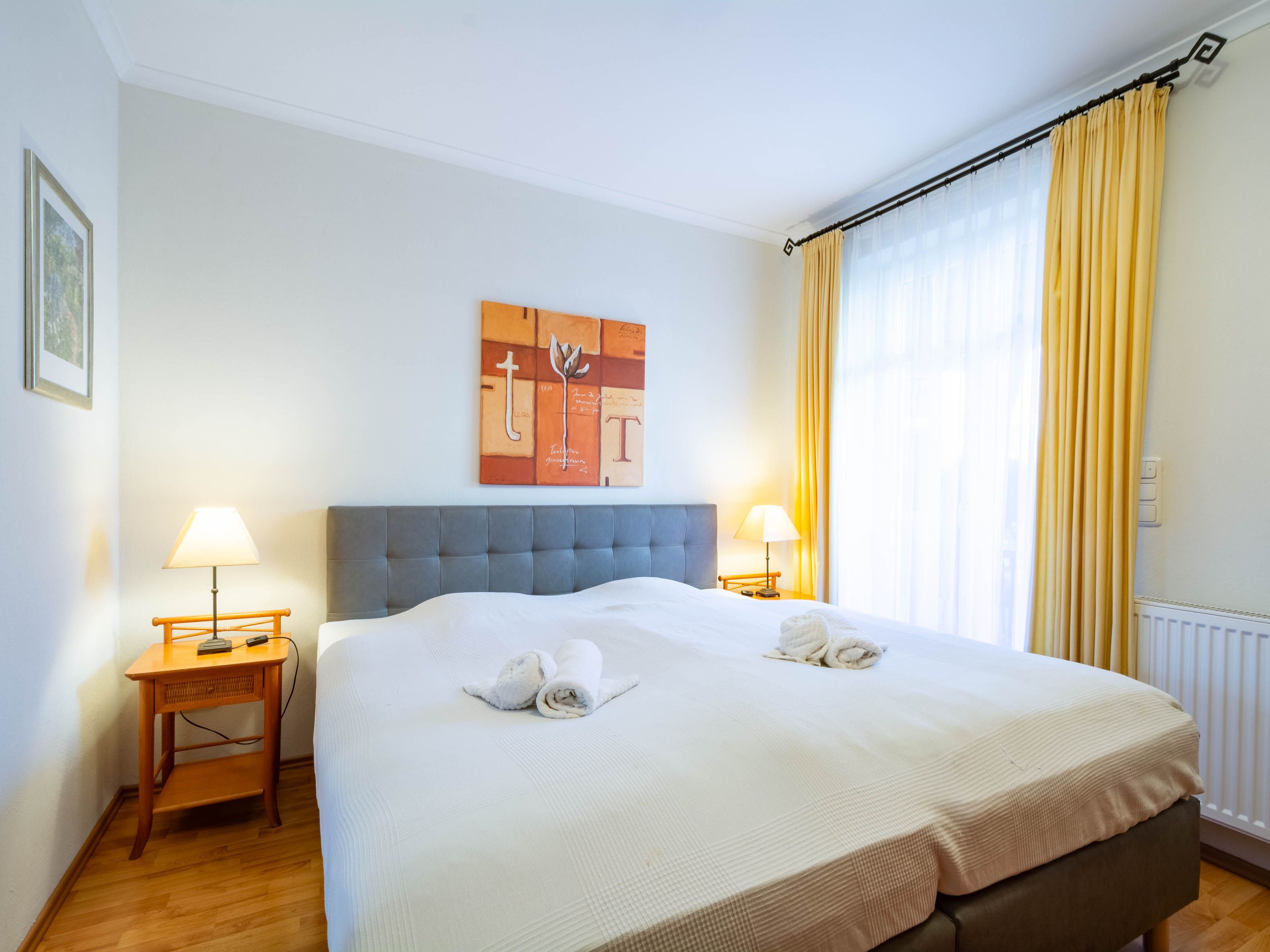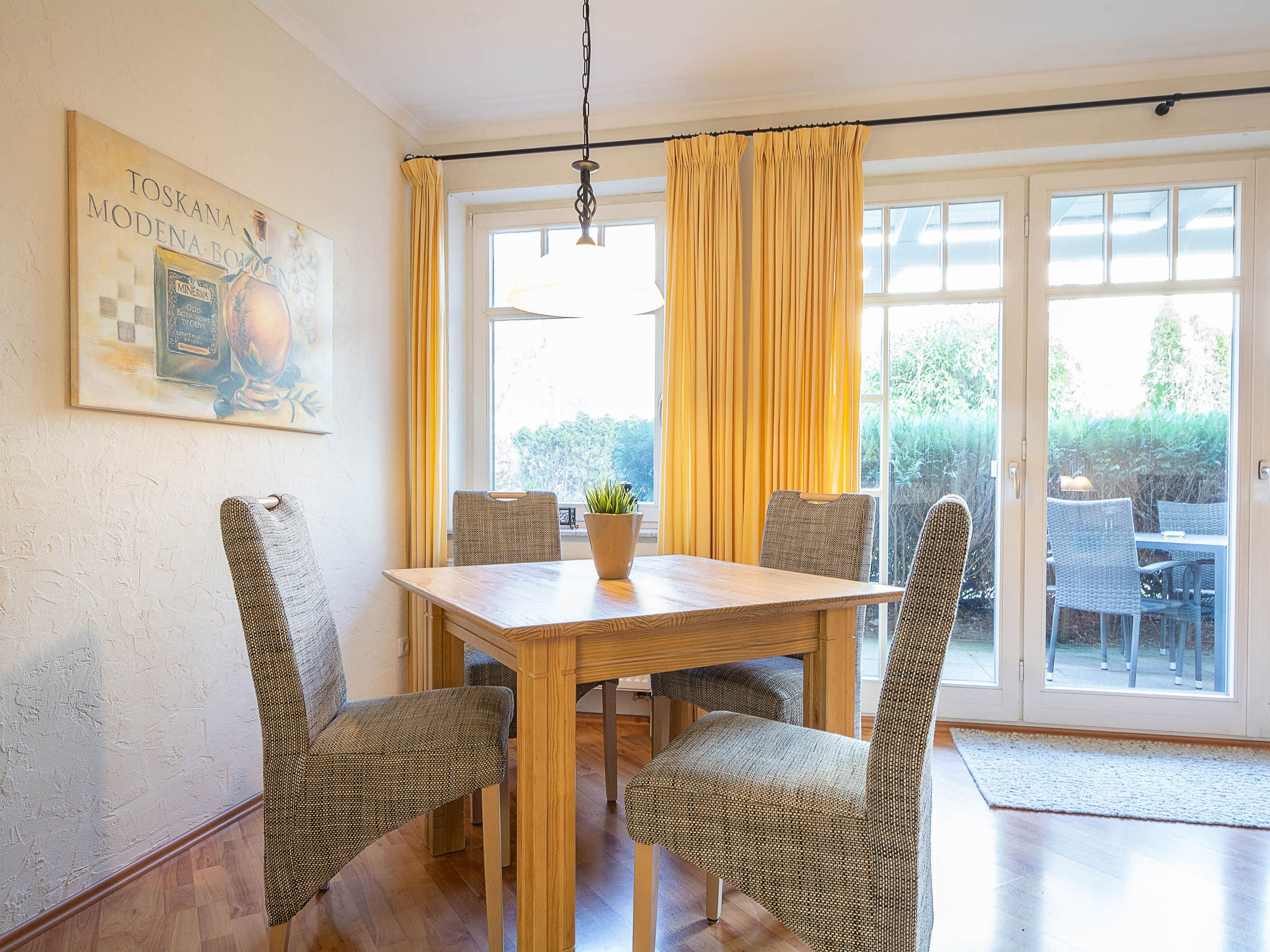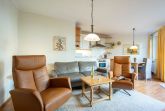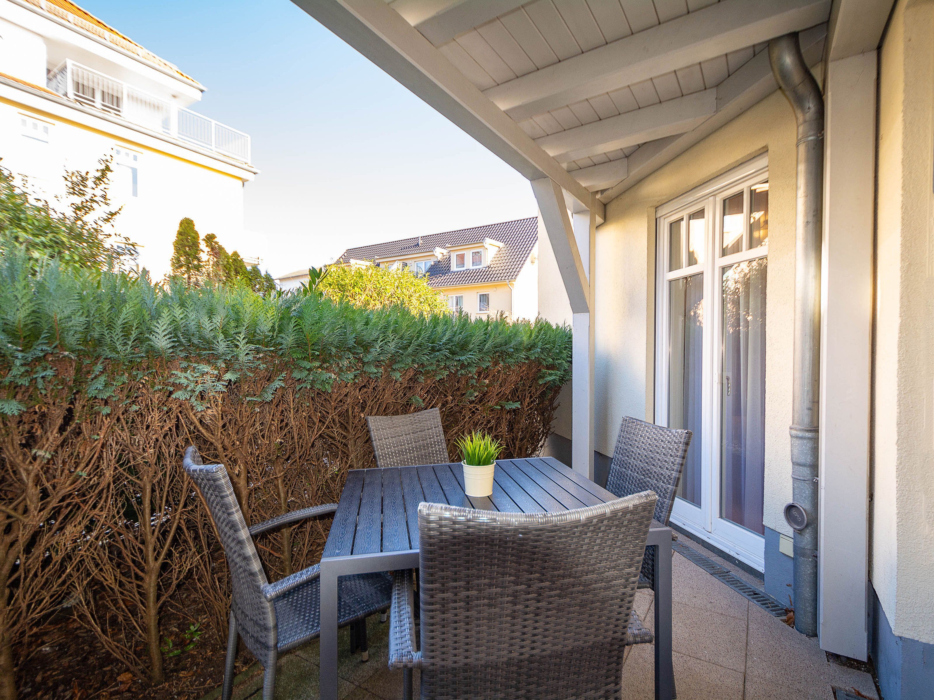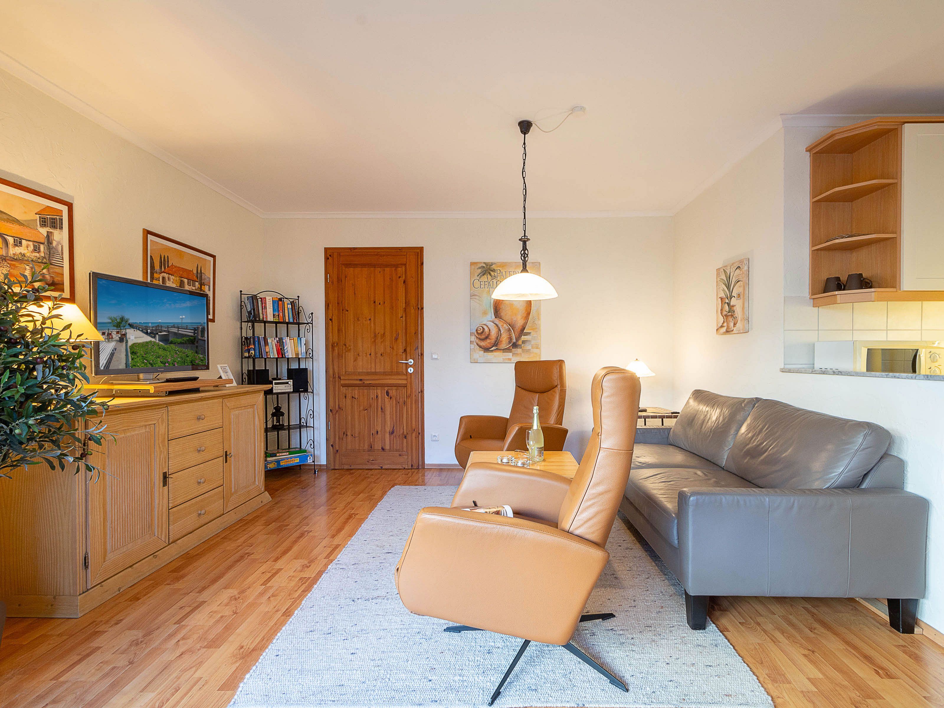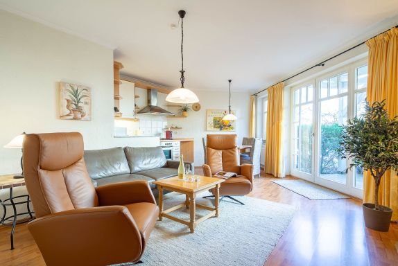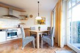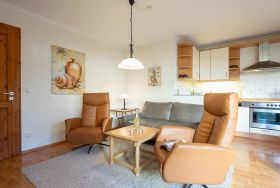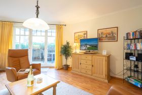 Sie wohnen in einer 62m² großen 3-Raum-Ferienwohnung, die sich im Erdgeschoss der Villa Barbarossa befindet. Der freundliche offene Wohnraum ist ausgestattet mit einer Couchgarnitur, einem Esstisch sowie einem 36-Zoll-Flachbild-TV und DVD-Player. Angrenzend befindet sich die voll ausgestattete Küchenzeile, die über alle wichtigen Küchengeräte und -utensilien verfügt. Ein 4-Zonen-Ceranfeld mit Backofen und Dunstabzug, ein Geschirrspüler, eine Mikrowelle sowie ein Kühlschrank mit Gefrierfach befinden sich in der Küche. Eine Kaffeemaschine, ein Wasserkocher, ein Toaster sowie ausreichend Geschirr vervollständigen die Kücheneinrichtung. Vom Wohnraum aus betreten Sie die möblierte nach Norden ausgerichtete Terrasse. Ein Schlafzimmer mit Doppelbett (180 cm x 200 cm), ein Schlafzimmer mit Einzelbett (90 cm x 200 cm) und weiterem Flachbild-TV (31 Zoll) sowie das Bad mit Dusche und WC vervollständigen das Gesamtbild dieser Wohnung.