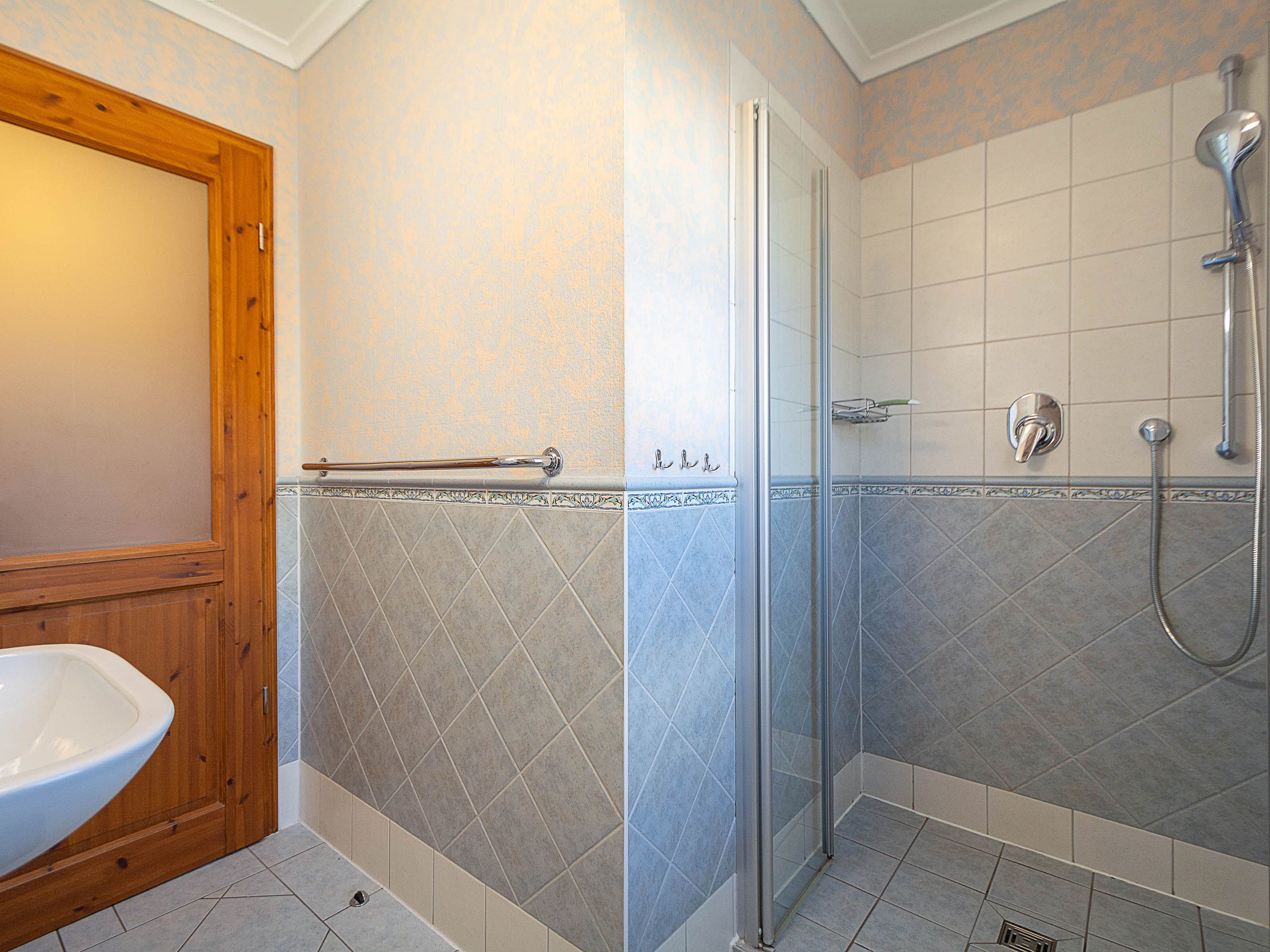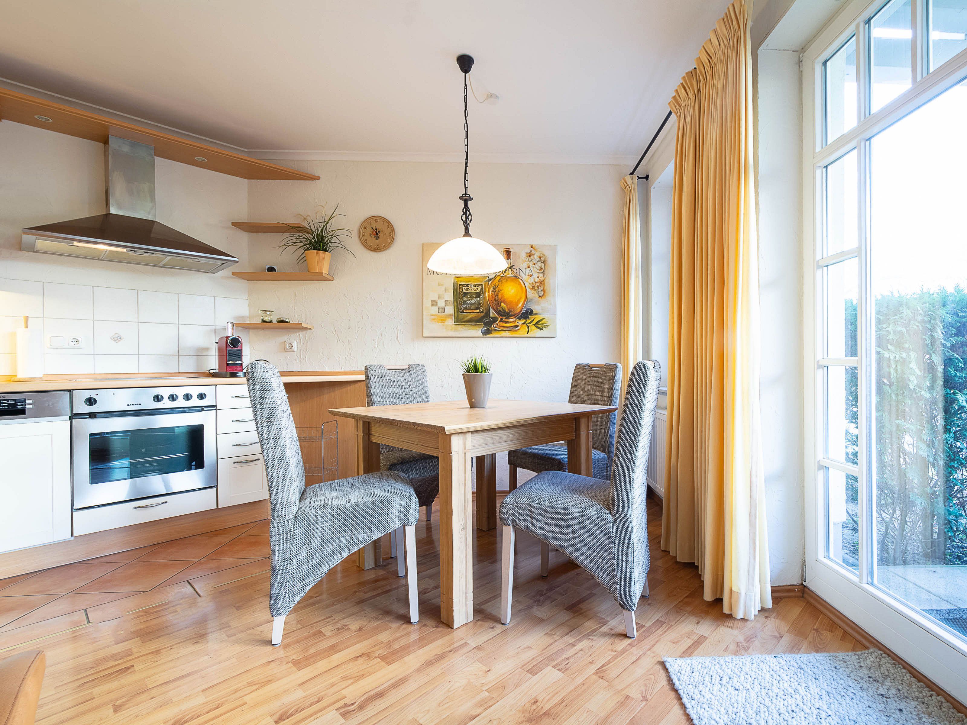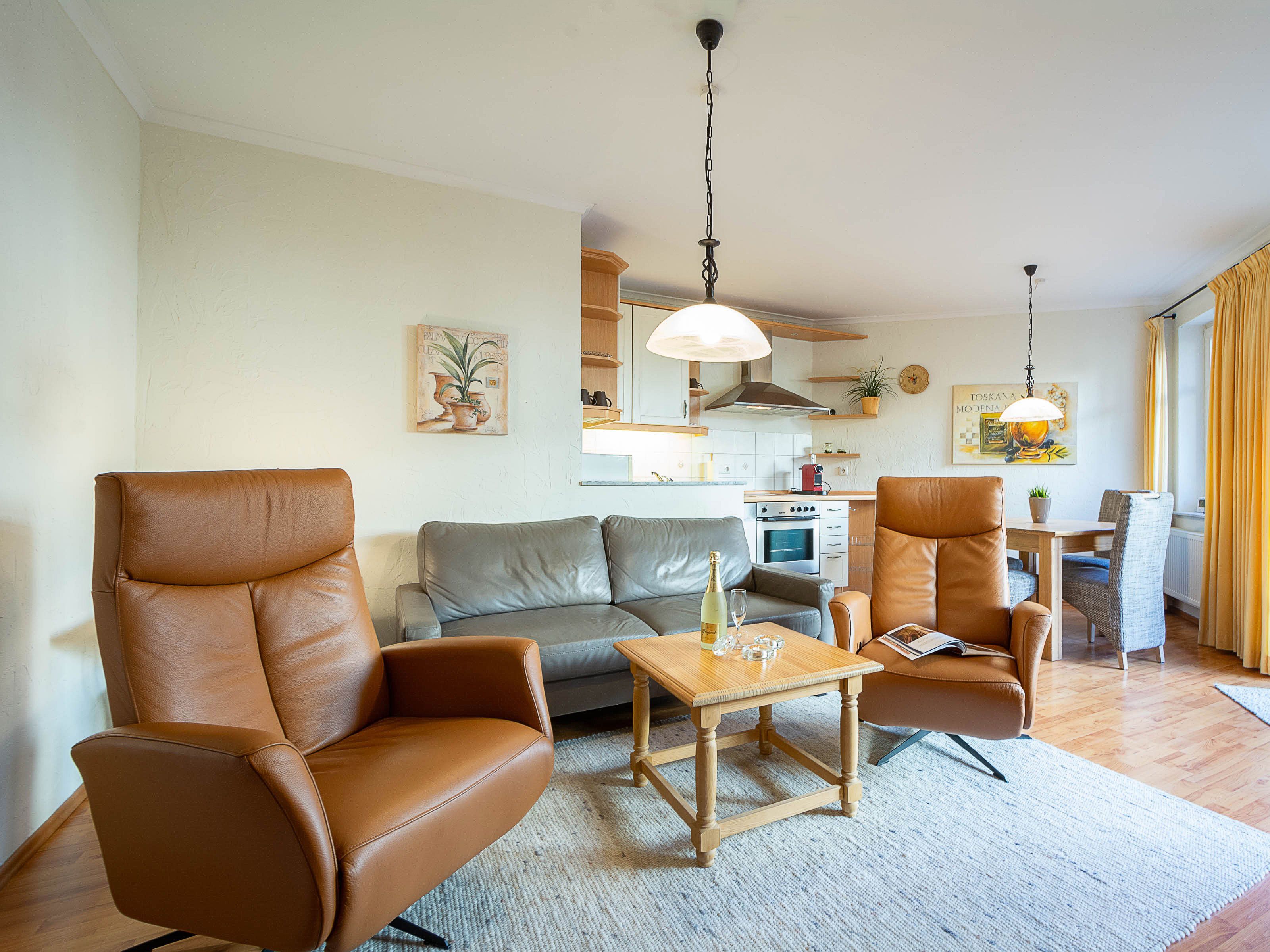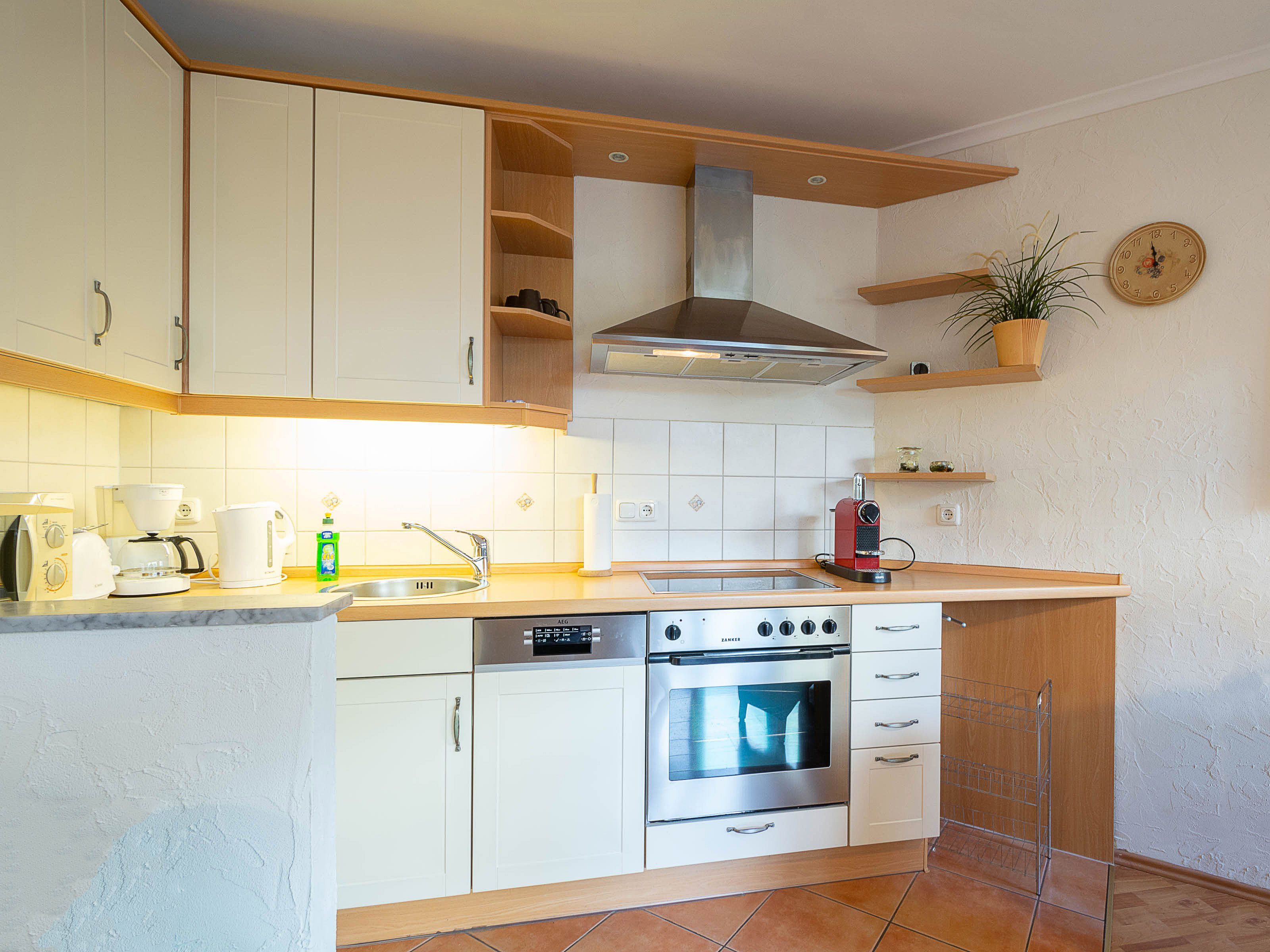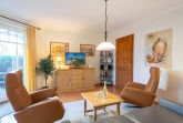 Sie wohnen in einer 62m² großen 3-Raum-Ferienwohnung, die sich im Erdgeschoss der Villa Barbarossa befindet. Der freundliche offene Wohnraum ist ausgestattet mit einer Couchgarnitur, einem Esstisch sowie einem 36-Zoll-Flachbild-TV und DVD-Player. Angrenzend befindet sich die voll ausgestattete Küchenzeile, die über alle wichtigen Küchengeräte und -utensilien verfügt. Ein 4-Zonen-Ceranfeld mit Backofen und Dunstabzug, ein Geschirrspüler, eine Mikrowelle sowie ein Kühlschrank mit Gefrierfach befinden sich in der Küche. Eine Kaffeemaschine, ein Wasserkocher, ein Toaster sowie ausreichend Geschirr vervollständigen die Kücheneinrichtung. Vom Wohnraum aus betreten Sie die möblierte nach Norden ausgerichtete Terrasse. Ein Schlafzimmer mit Doppelbett (180 cm x 200 cm), ein Schlafzimmer mit Einzelbett (90 cm x 200 cm) und weiterem Flachbild-TV (31 Zoll) sowie das Bad mit Dusche und WC vervollständigen das Gesamtbild dieser Wohnung.