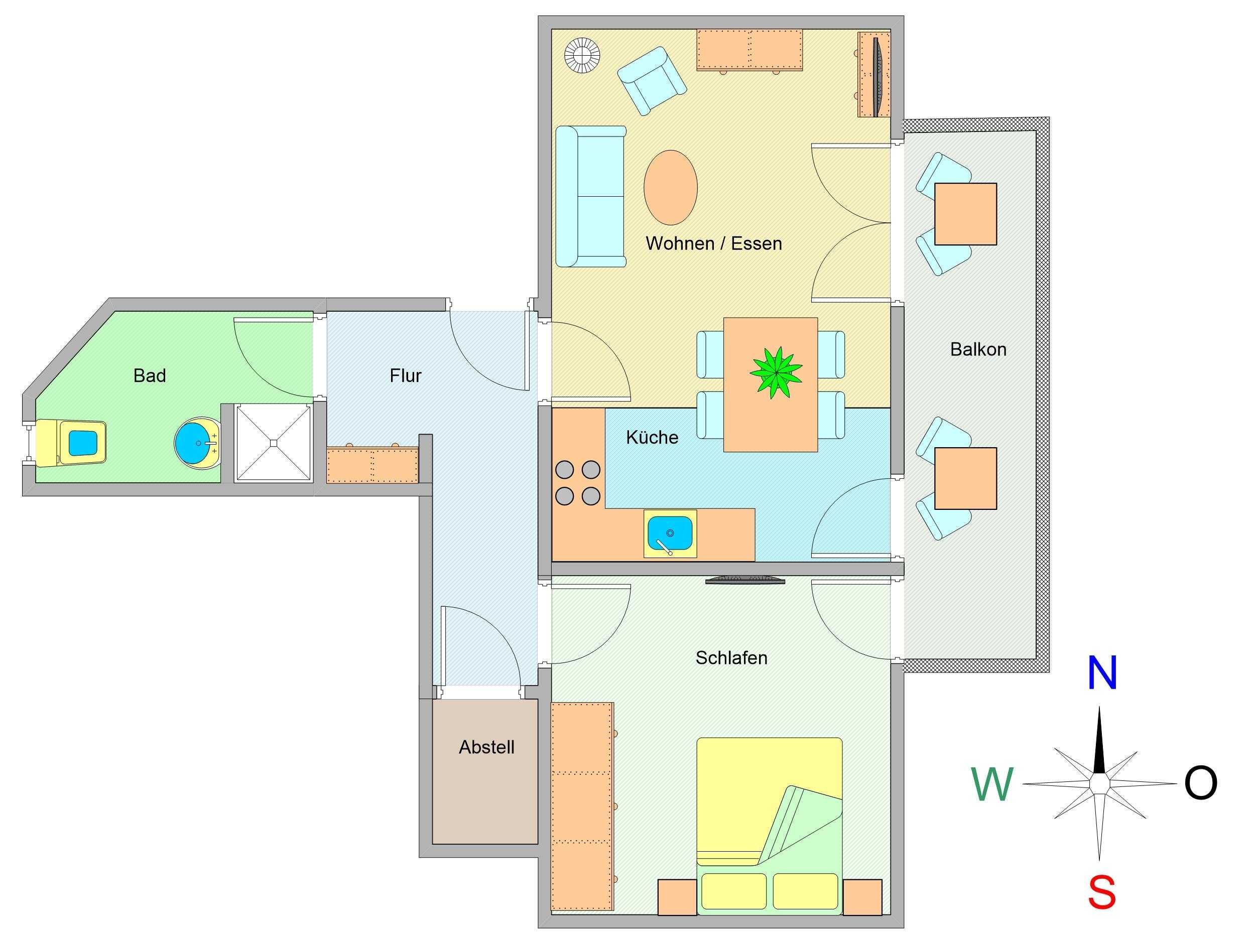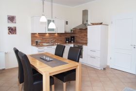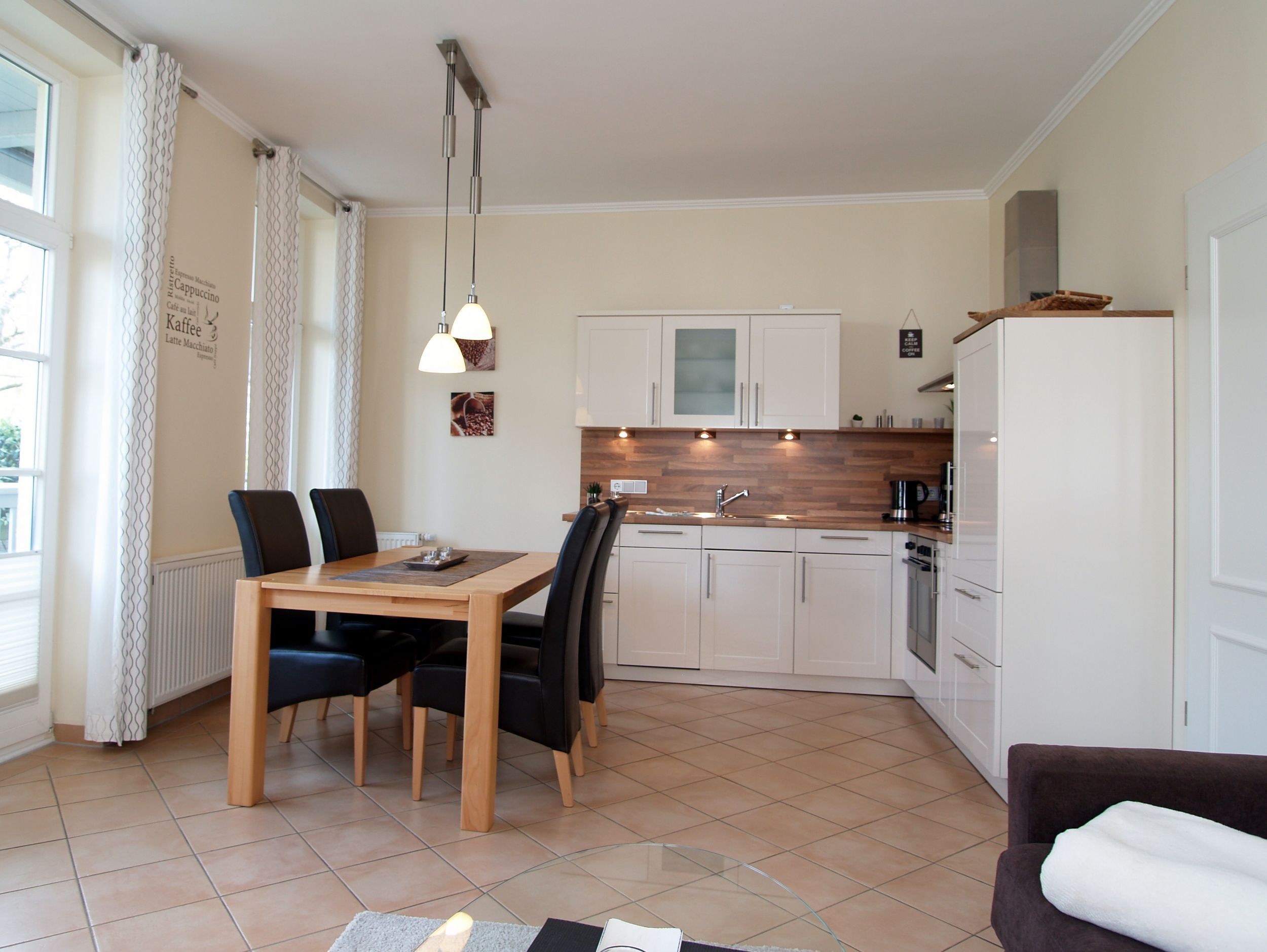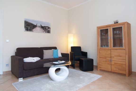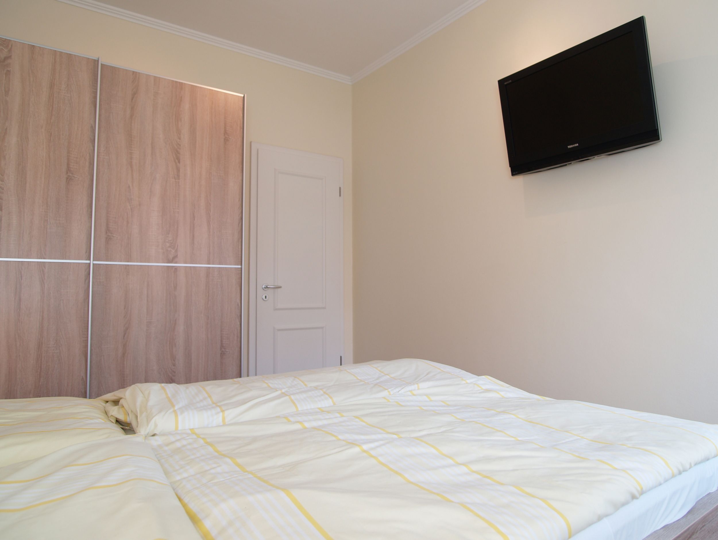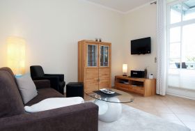 Sie wohnen in einer 56m² großen 2-Raum-Ferienwohnung, die sich im 1. Obergeschoss der Villa Barbarossa befindet. Der helle freundliche Wohnraum ist ausgestattet mit einer gemütlichen Couchgarnitur (Schlafcouch ausziehbar 160cm breit), einem Esstisch, 38-Zoll-Flachbild-TV und Radio sowie einer offenen Küchenzeile, die über alle wichtigen Küchengeräte und -utensilien verfügt (4-Zonen-Cerankochfeld mit Dunstabzug, Backofen, Geschirrspüler, Kühlschrank mit Gefrierfach, Kaffeemaschine, Wasserkocher u.v.m.). Sowohl vom Wohnraum als auch vom Schlafraum aus betreten Sie den nach Osten ausgerichteten Balkon. Der Schlafraum ist ausgestattet mit einem Doppelbett (160 cm x 200 cm), einem großem Kleiderschrank für Ihre Urlaubsgarderobe sowie einem 2. TV-Gerät (31 Zoll). Das geflieste Tageslichtbad mit Dusche und WC bietet genügend Ablagefläche für Ihre Badutensilien.