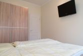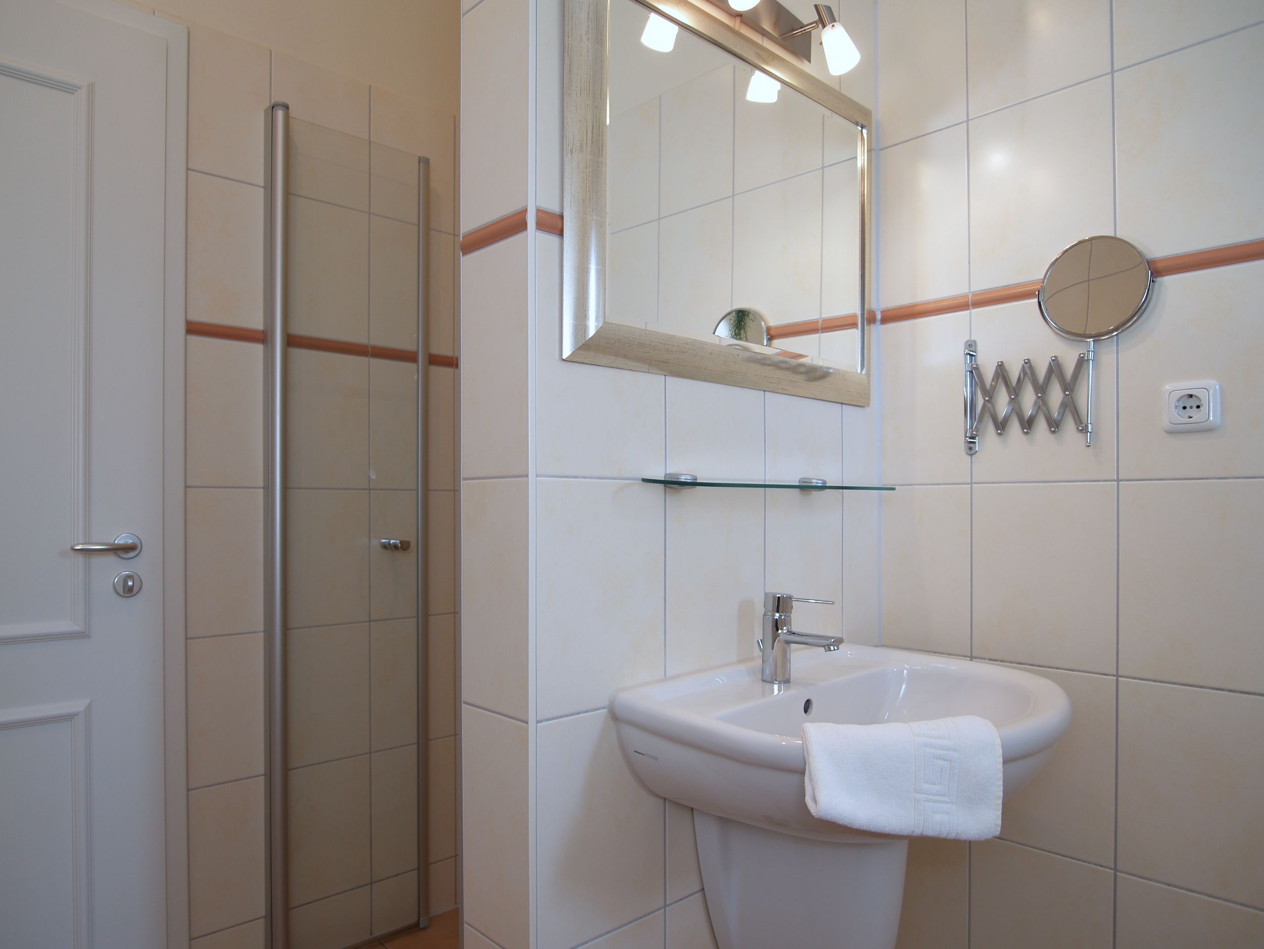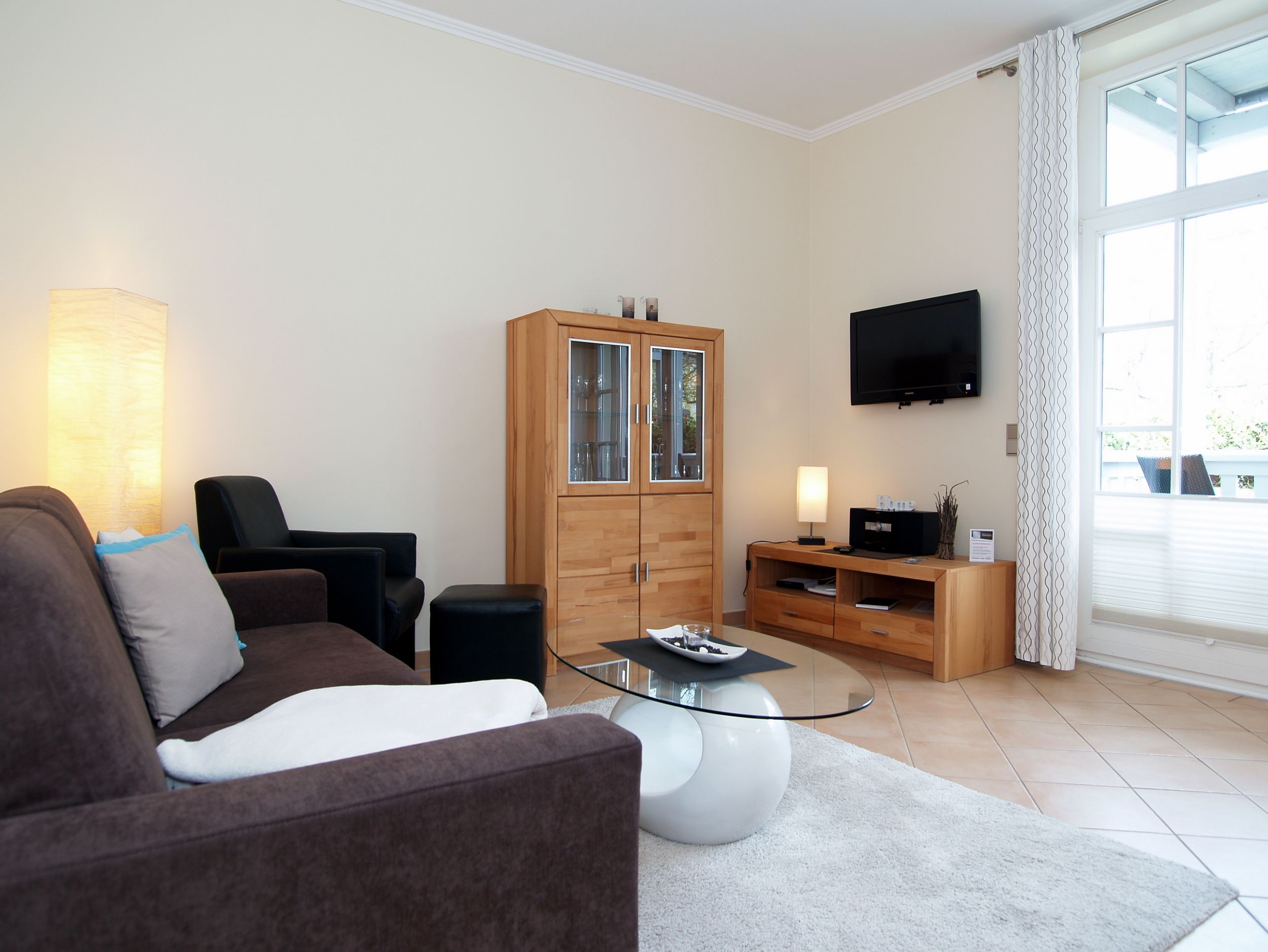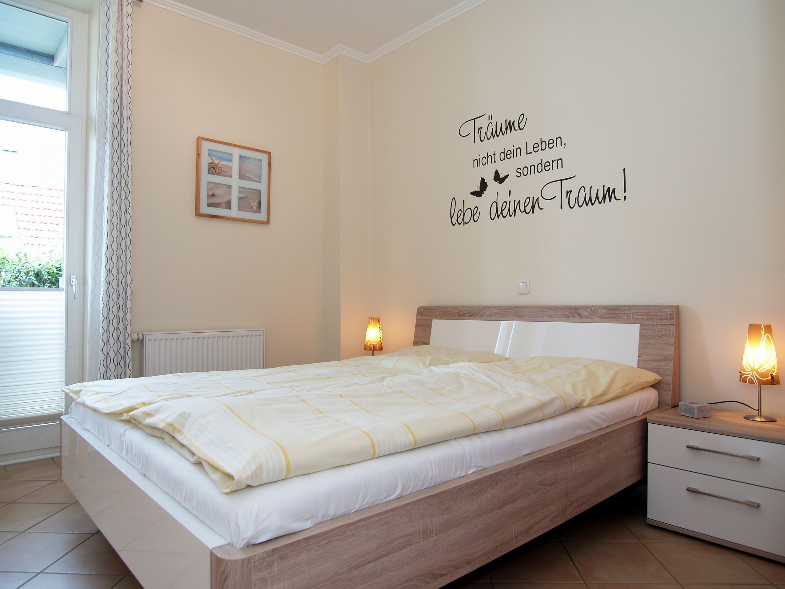 Sie wohnen in einer 56m² großen 2-Raum-Ferienwohnung, die sich im 1. Obergeschoss der Villa Barbarossa befindet. Der helle freundliche Wohnraum ist ausgestattet mit einer gemütlichen Couchgarnitur (Schlafcouch ausziehbar 160cm breit), einem Esstisch, 38-Zoll-Flachbild-TV und Radio sowie einer offenen Küchenzeile, die über alle wichtigen Küchengeräte und -utensilien verfügt (4-Zonen-Cerankochfeld mit Dunstabzug, Backofen, Geschirrspüler, Kühlschrank mit Gefrierfach, Kaffeemaschine, Wasserkocher u.v.m.). Sowohl vom Wohnraum als auch vom Schlafraum aus betreten Sie den nach Osten ausgerichteten Balkon. Der Schlafraum ist ausgestattet mit einem Doppelbett (160 cm x 200 cm), einem großem Kleiderschrank für Ihre Urlaubsgarderobe sowie einem 2. TV-Gerät (31 Zoll). Das geflieste Tageslichtbad mit Dusche und WC bietet genügend Ablagefläche für Ihre Badutensilien.
