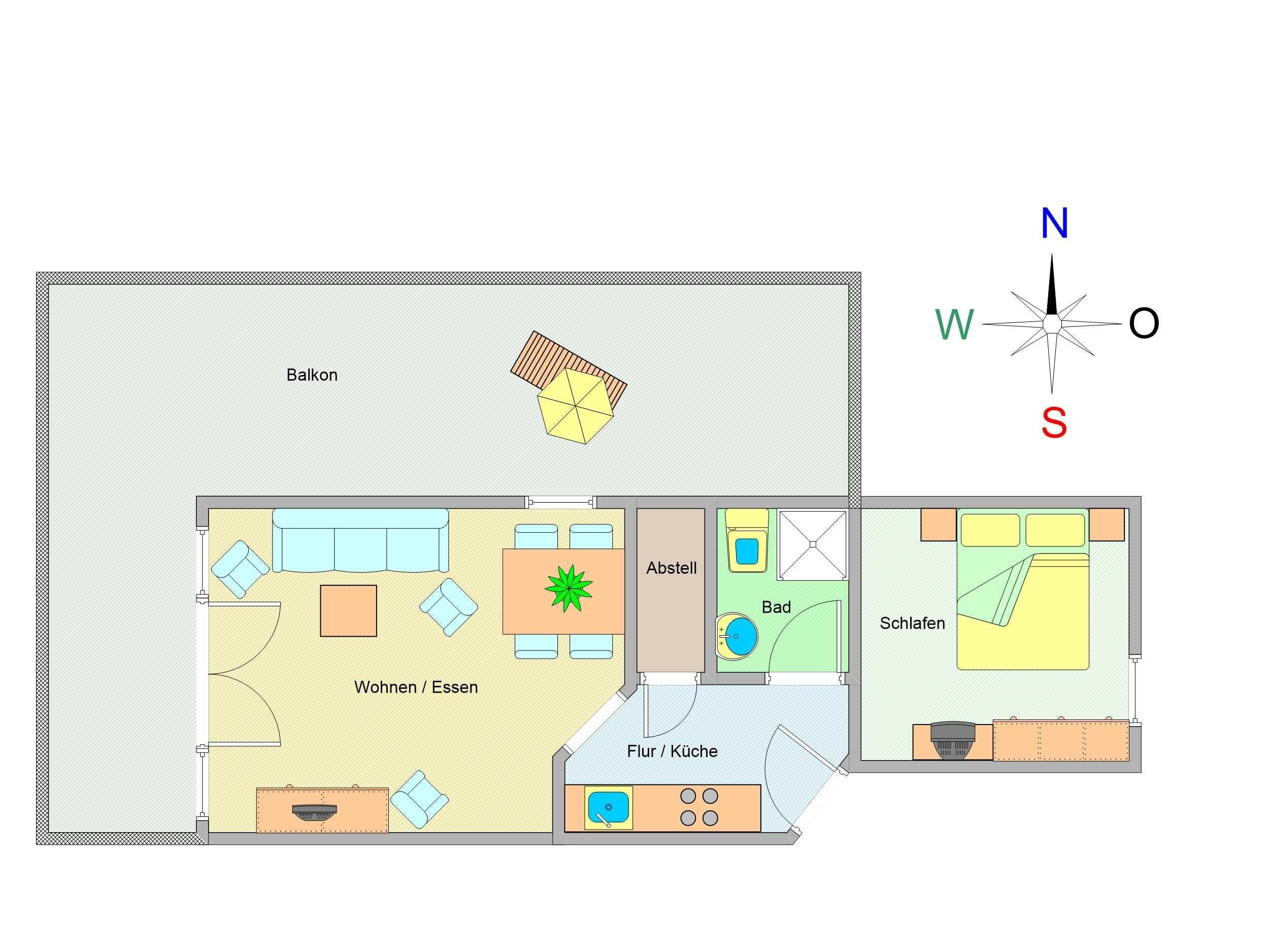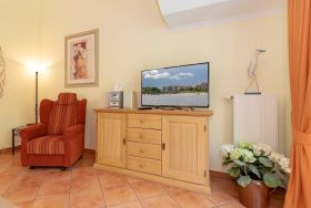 Die 62 qm große 2-Raum-Wohnung verfügt über einen hellen freundlichen Wohnraum mit einer einladenden Schlafcouch, einem gemütlichen Essplatz, einem Flachbild-TV und einer Stereoanlage. Die offene Küchenzeile im Flurbereich ist komplett ausgestattet mit einem Geschirrspüler, 4-Platten-Ceranfeld, Backofen mit Dunstabzug, eine Mikrowelle und Kühlschrank sowie genügend Geschirr und Kochutensilien für Ihr „perfektes Dinner“. Eine Kaffeemaschine, Wasserkocher und Toaster sind selbstverständlich auch in der Küche vorhanden. Vom Wohnraum aus gelangen Sie auf die großzügige Dachterrasse, die mit einem charmanten Tisch und 4 Stühlen ausgestattet ist.