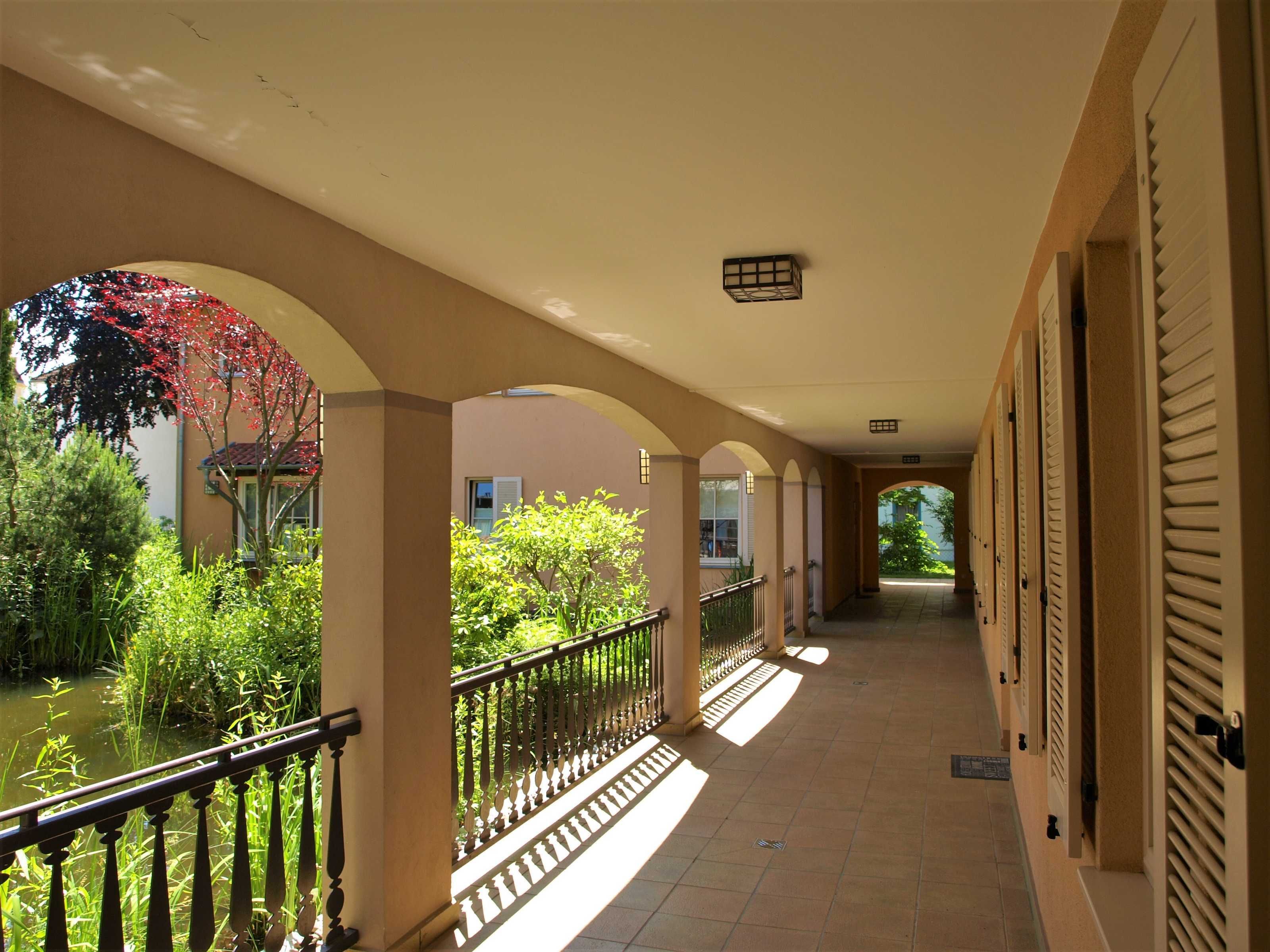 Das Schlafzimmer bietet ein komfortables Boxspringbett, einen großzügigen Kleiderschrank und einen kleinen TV. Das Tageslichtbad ist mediterran gefliest in warmen Terrakotta-Farben und verfügt über eine stufenlose Dusche, ein Waschbecken, einen großen Spiegel, einen Kosmetikspiegel, ein WC und einen Handtuchheizkörper. Die ruhige Lage im hinteren Gebäude sorgt für ein entspanntes mediterranes Lebensgefühl.