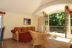 Die 62 Quadratmeter große 2-Zimmer-Ferienwohnung liegt im 2. Obergeschoss der Residenz Laguna und lässt sich bequem mit einem Lift erreichen. Im Wohnraum finden Gäste des Feriendomizils eine komfortable Schlafcouch, Unterhaltungselektronik und eine voll ausgestattete Küchenzeile, die mit allen wichtigen Kochutensilien ausgestattet ist (u.a. 4-Platten-Cerankochfeld, Backofen und Dunstabzugshaube, Mikrowelle, Kaffeemaschine, Wasserkocher etc.). Im Schlafraum mit Doppelbett finden Urlauber nach einem abwechslungsreichen Tag Ruhe und Erholung und wer zu den Frischluftfanatikern gehört, nutzt den geräumigen Balkon mit Westausrichtung. Von hier können Sie einen herrlichen Blick auf den Kühlungsborner Stadtwald genießen und Ihren Abend zu einem Glas Wein ausklingen lassen. Abgerundet wird der Wohnkomfort dieses Feriendomizils durch ein großzügiges Tageslichtbad mit WC und Dusche.