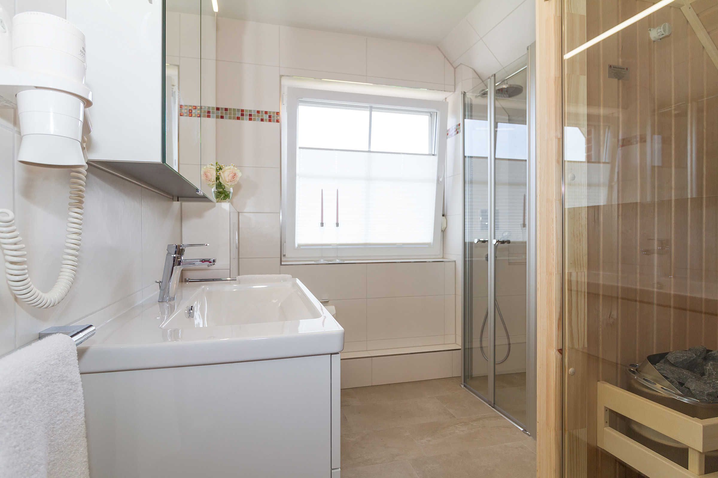 Einen Genuss für Seele und Sinne bietet die neu eingebaute Sauna, die sich in einem großzügigen Bad im OG befindet. Diese Sauna ist zusätzlich mit Infrarotstrahlern ausgestattet, so dass man sich nach einem Strandspaziergang an einem kühlen Wintertag rasch wieder aufwärmen kann.