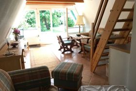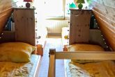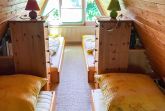 Im oberen Bereich, erreichbar über eine schmale Holztreppe befindet sich ein offener Schlafboden mit 4 Einzelbetten (90x210), welche sich gegenüber stehen. Bei Bedarf können zwei Betten zusammengeschoben werden.