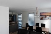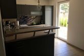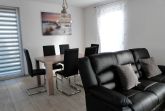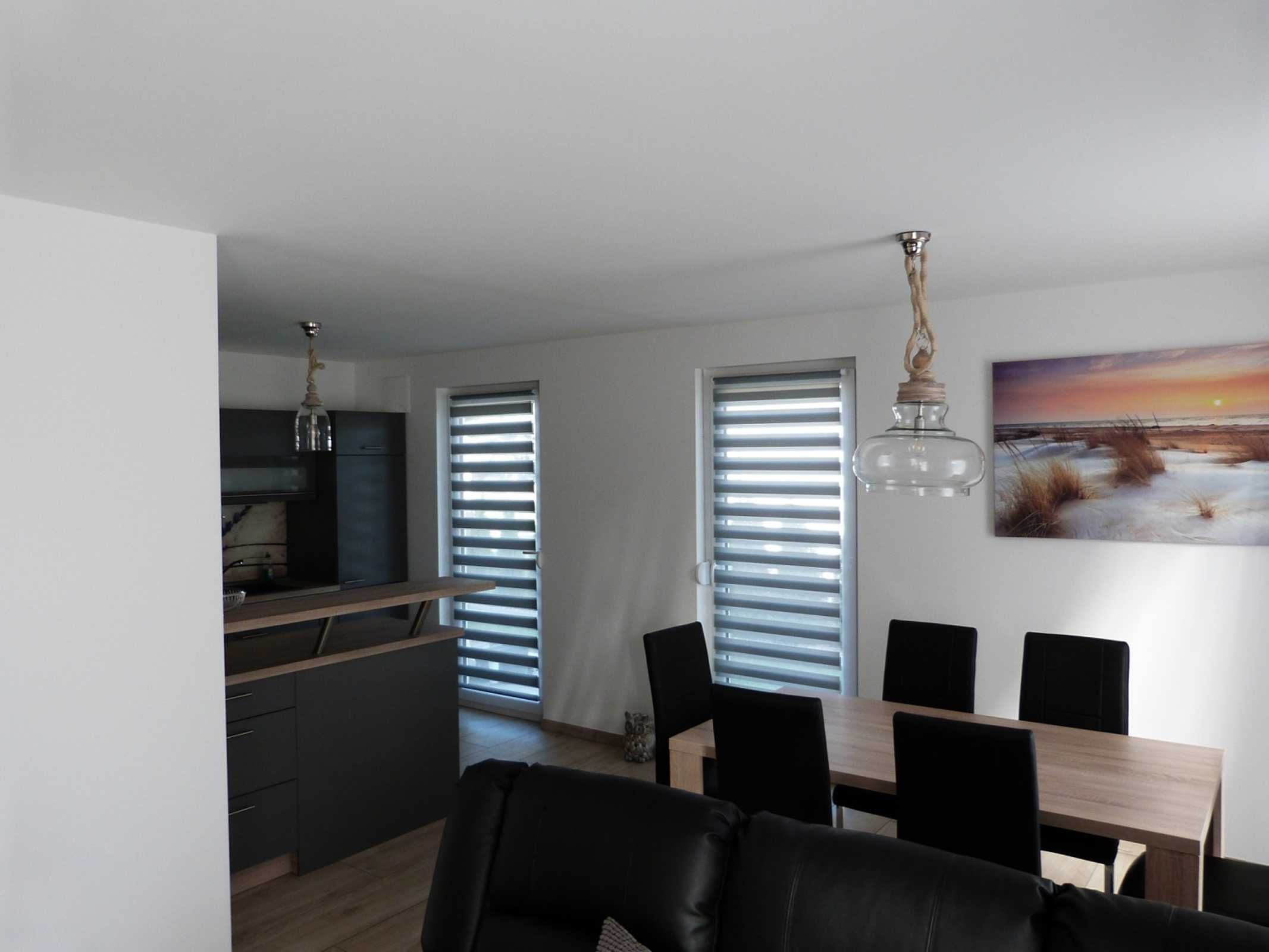Im Wohnzimmer gehen der Essbereich mit komplett ausgestatteter Küche fließend ineinander über.