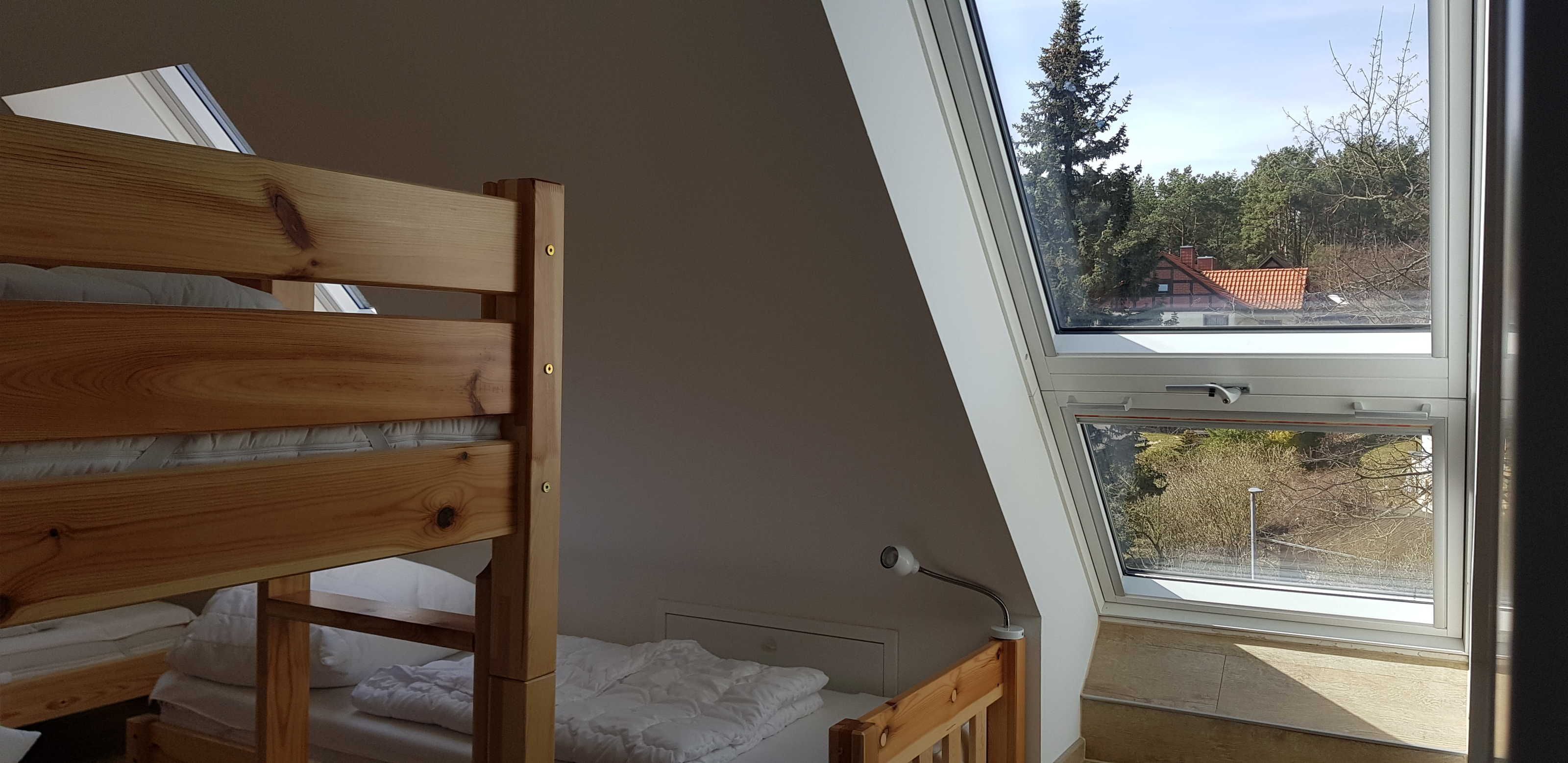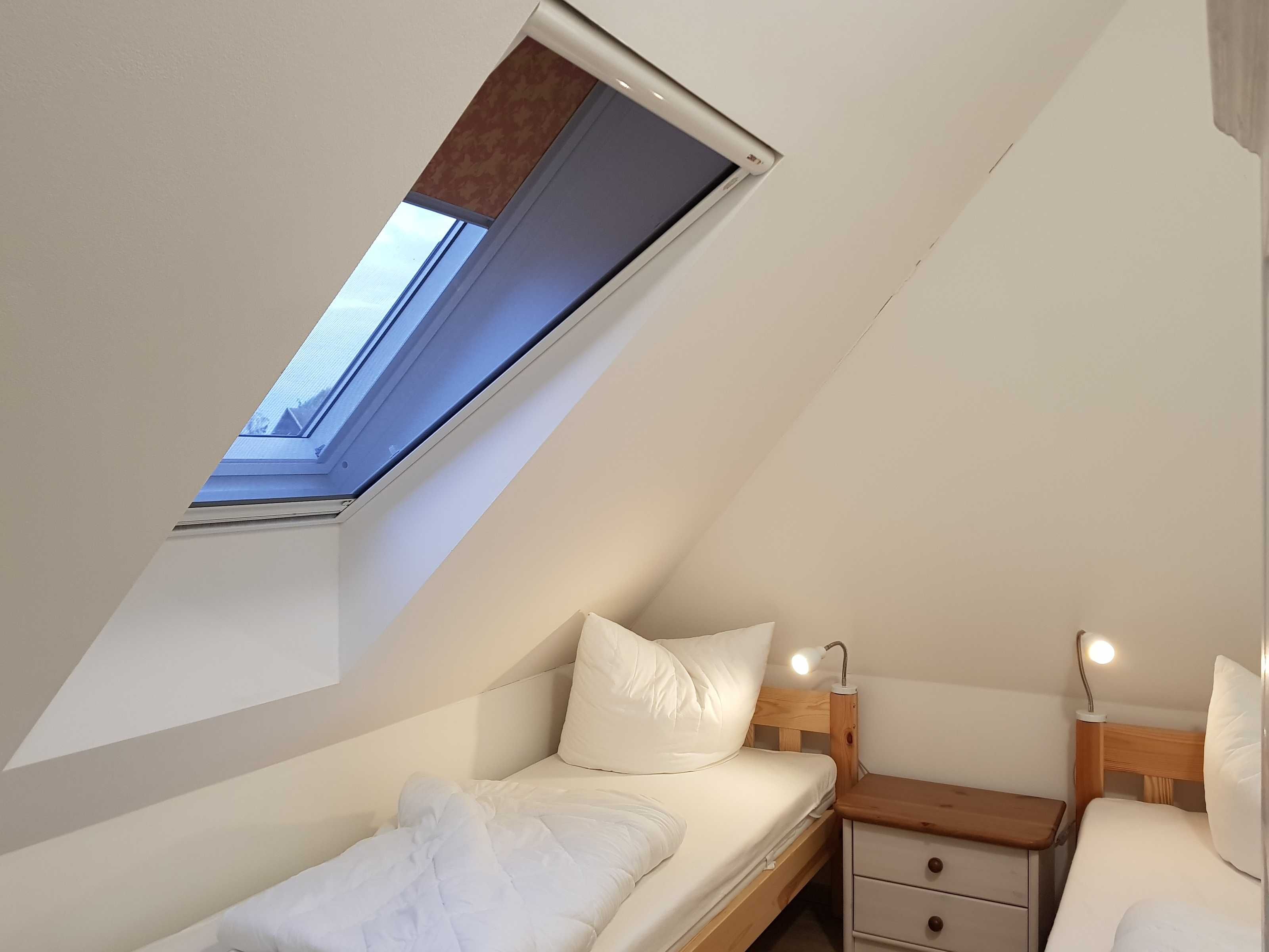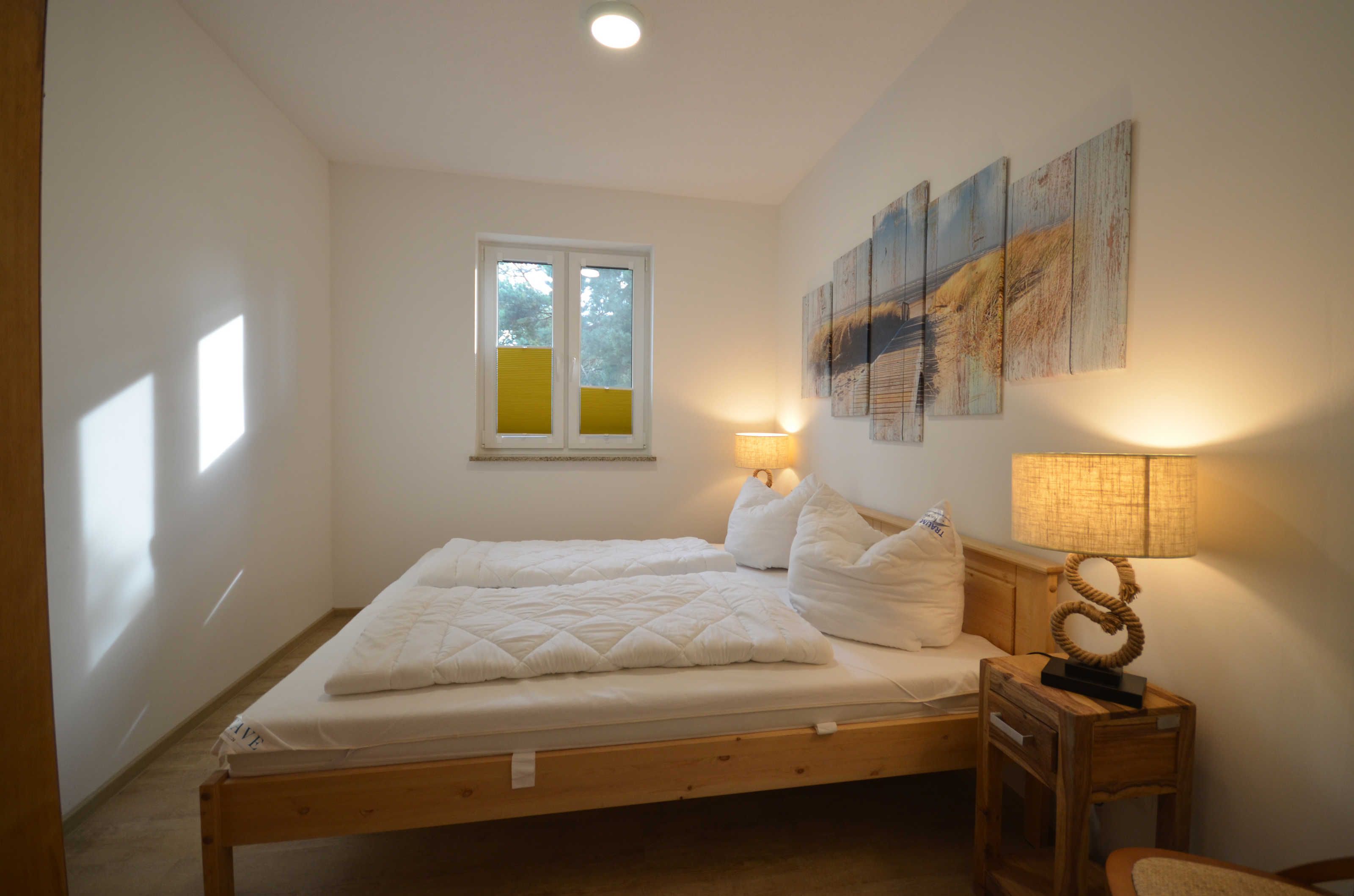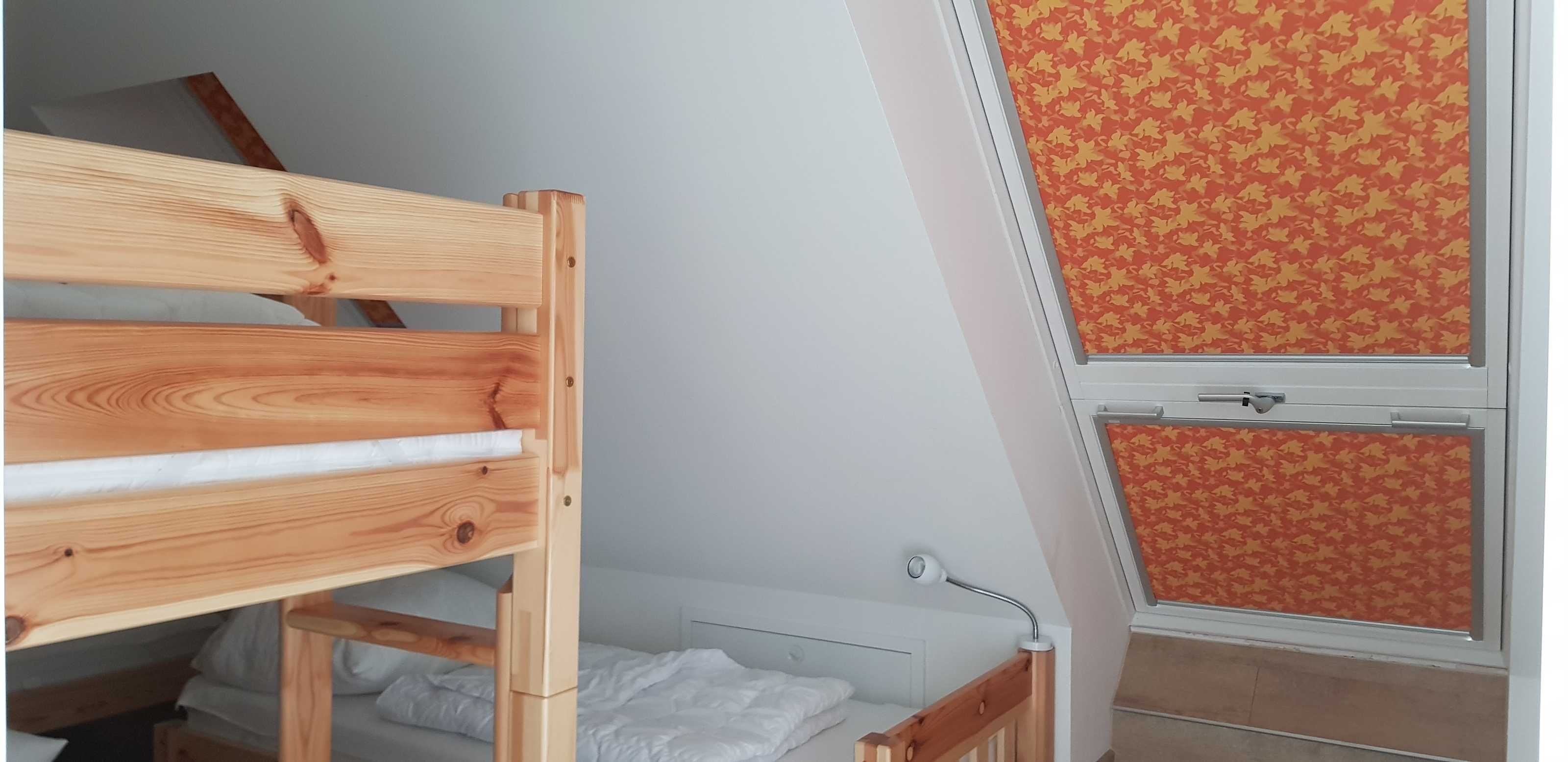 • Schlafzimmer 3 in der Fewo 3 ist mit einem Doppelbett und einem Einzelbett und in der Fewo 4 mit 3 Einzelbetten ausgestattet, wo jeweils 3 Personen Platz finden. Fliegengitter und Verdunkelungsrollo.