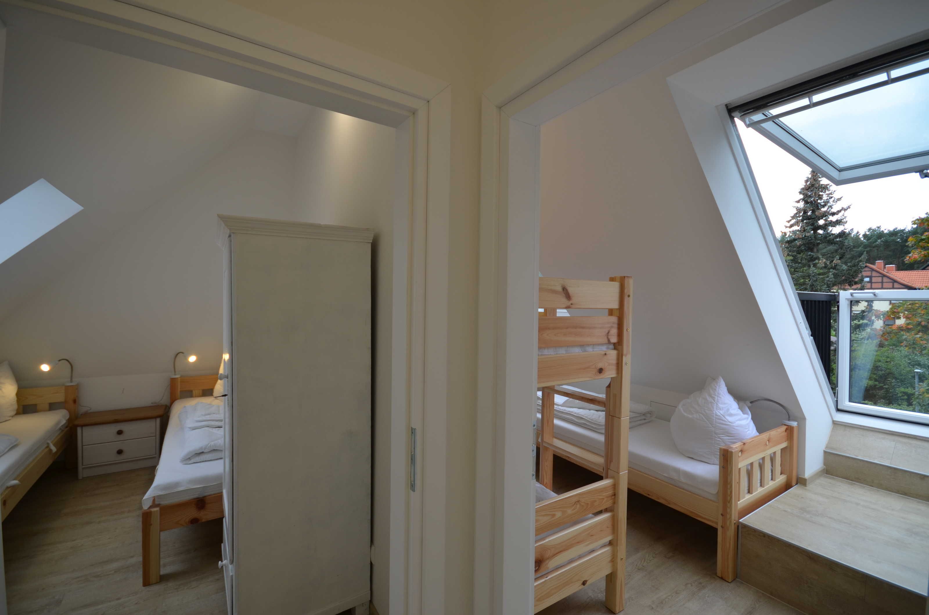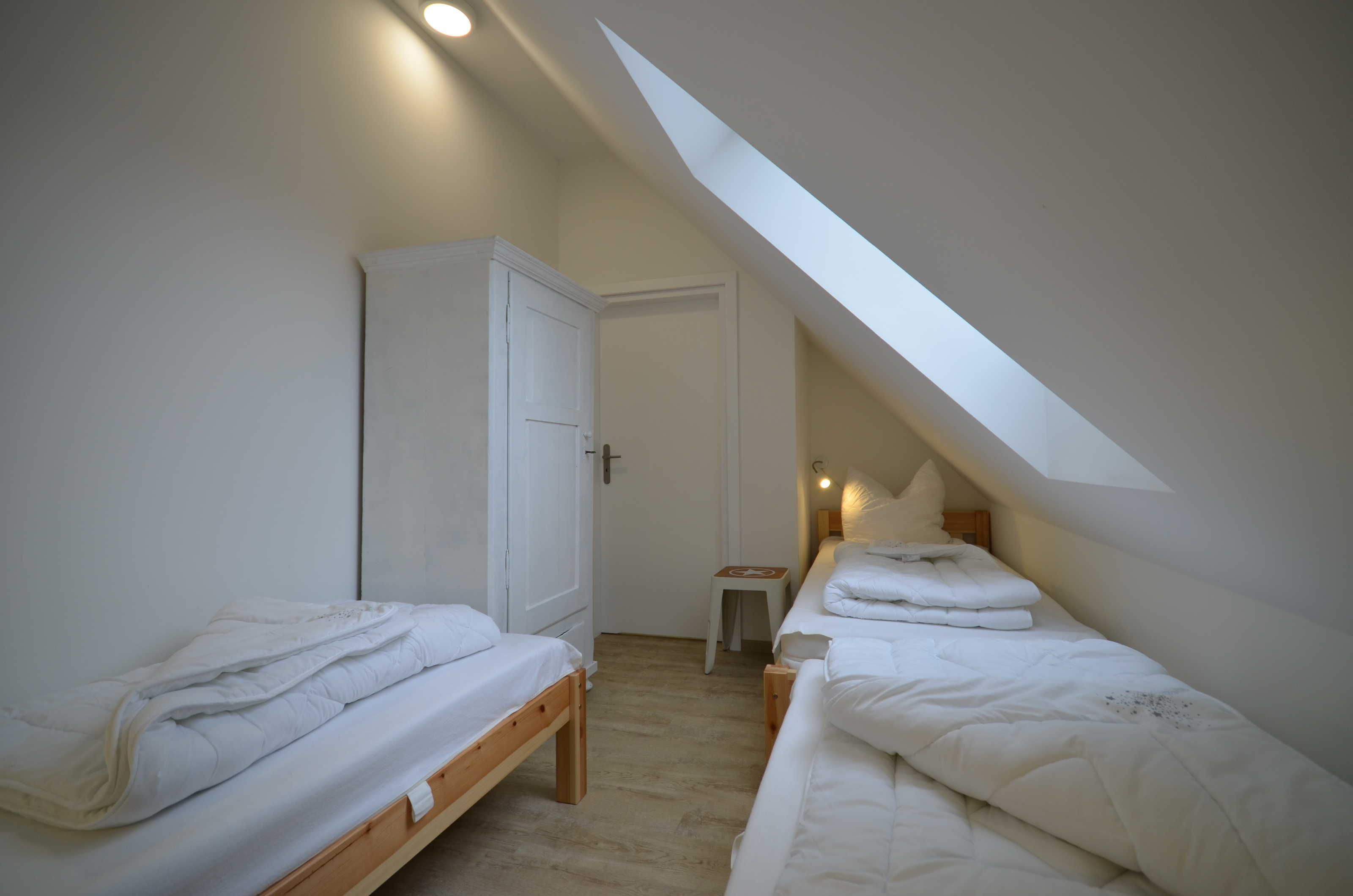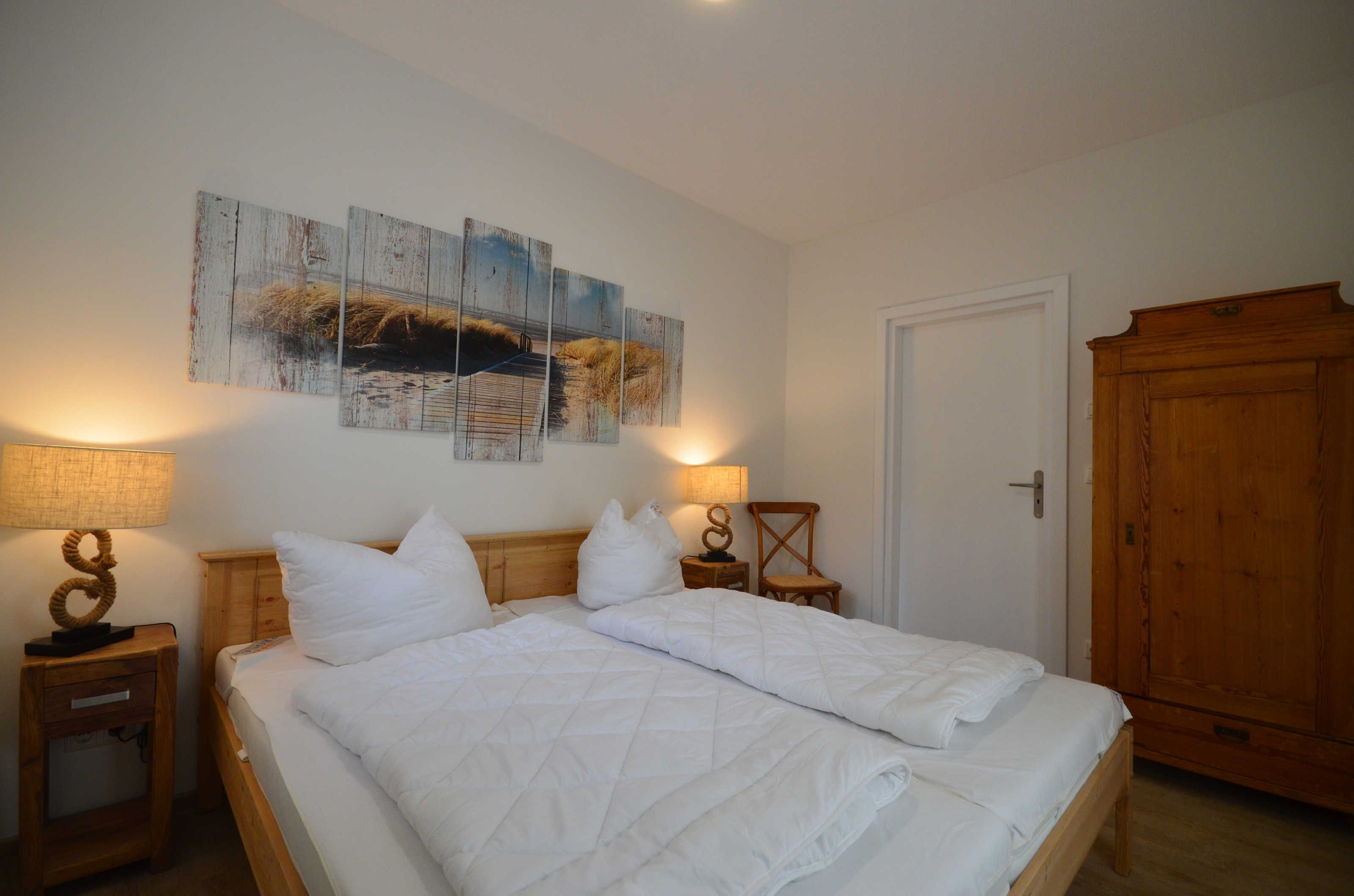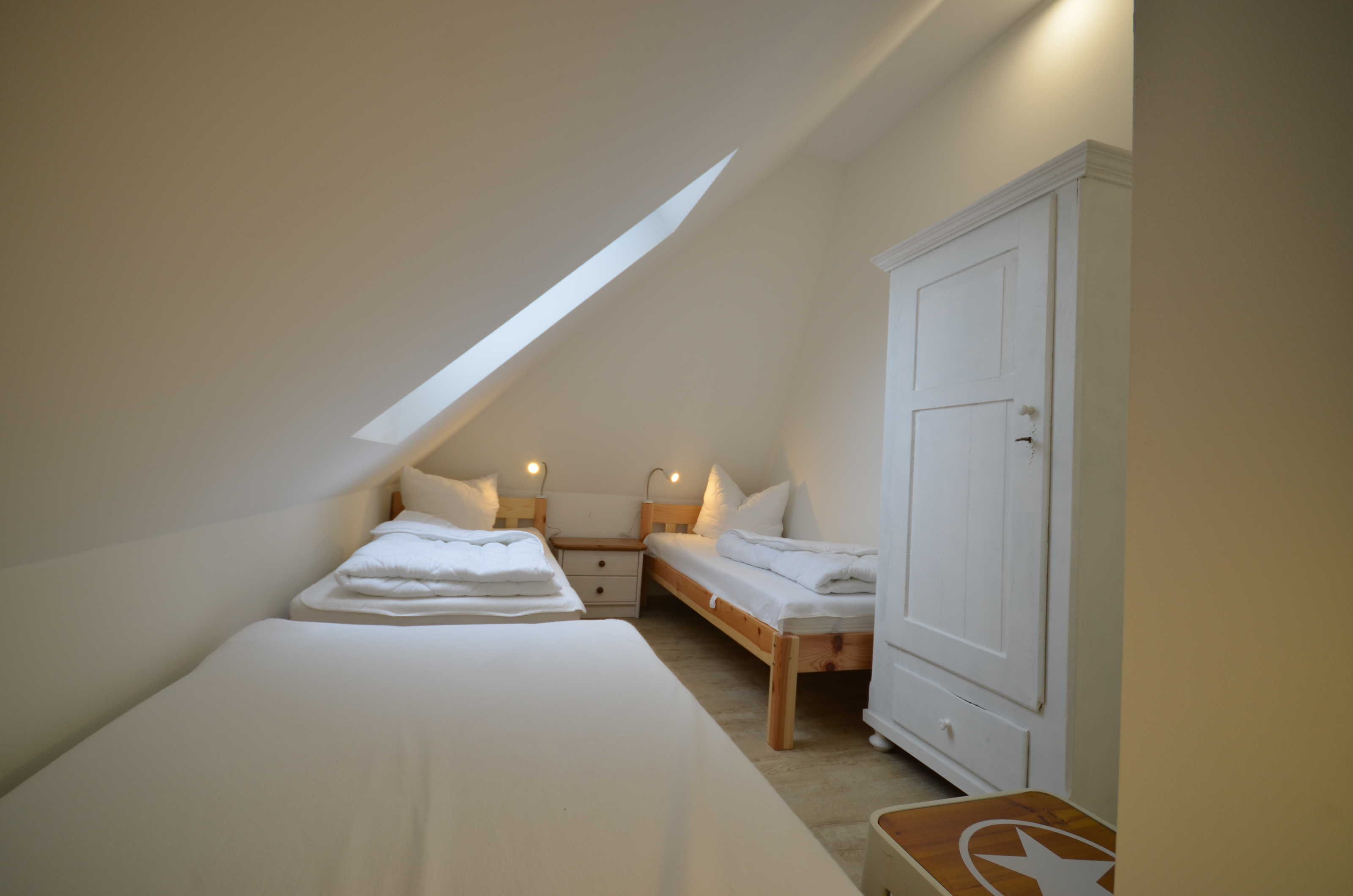 • Schlafzimmer 3 in der Fewo 3 ist mit einem Doppelbett und einem Einzelbett und in der Fewo 4 mit 3 Einzelbetten ausgestattet, wo jeweils 3 Personen Platz finden. Fliegengitter und Verdunkelungsrollo.