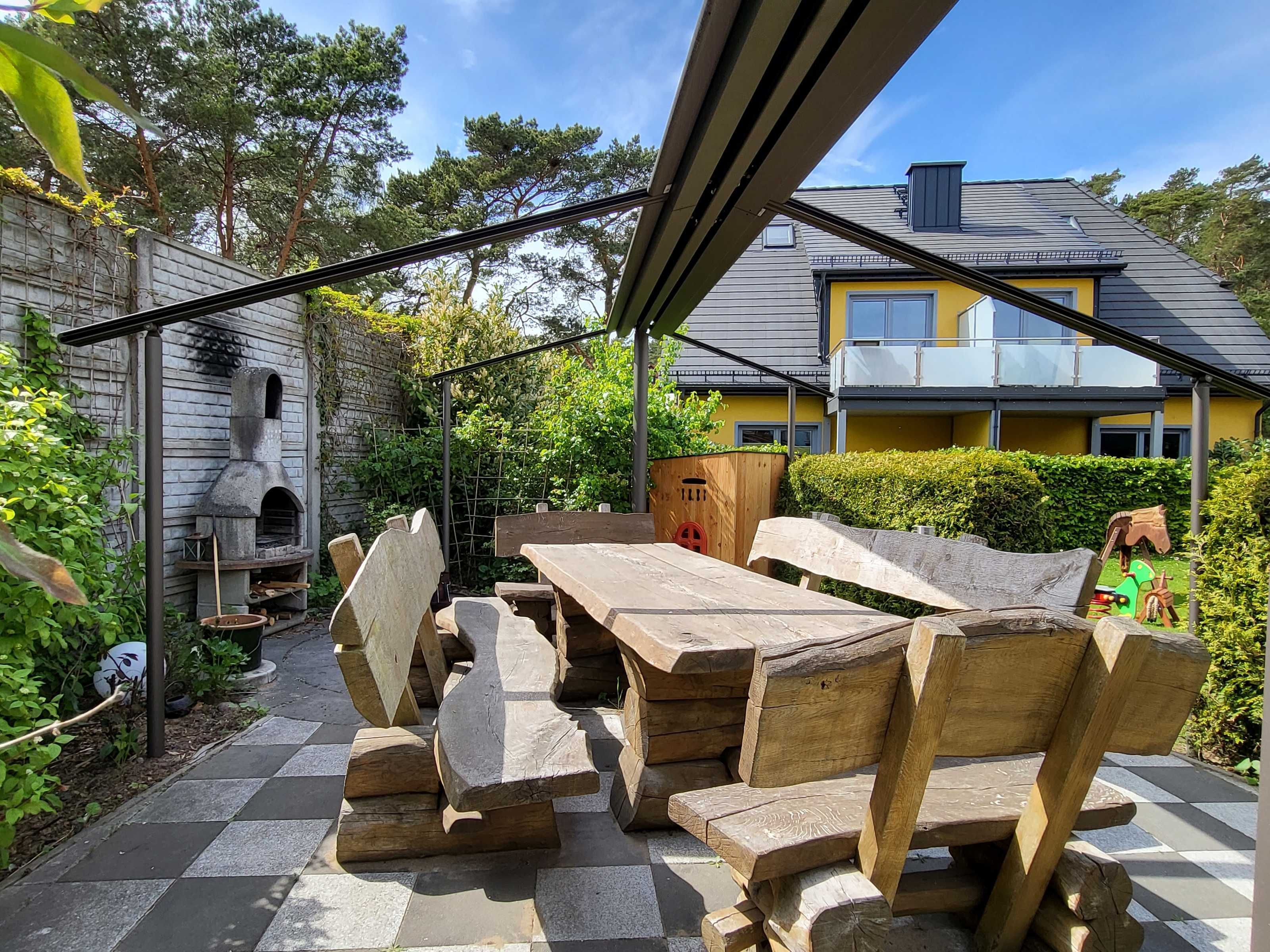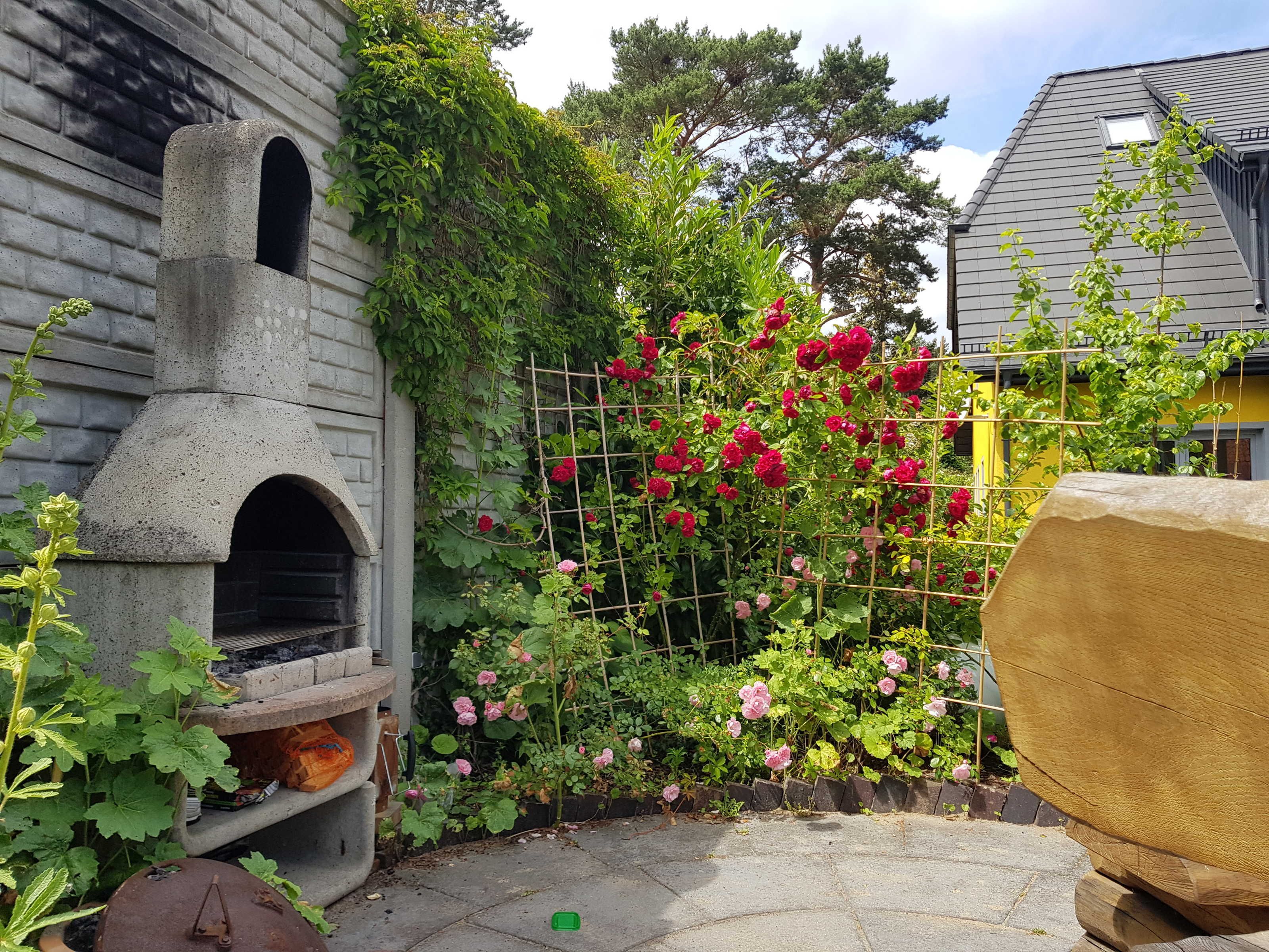 Alle Gäste sind eingeladen, den gesamten Gartenbereich (siehe Fotos) sowie den Grillplatz (großer Steingrill mit Kamin) zum Zusammensitzen, zum Frühstücken und Verweilen zu nutzen. Deshalb haben wir den Gartenbereich so gestaltet, dass die Tafel und der Grillplatz in der Mitte unserer beiden Ferienhäuser STERN USEDOM (Ferienhaus von der Strandstr. 29 und Ferienhaus vom Triftweg 10) liegen. Diesen Platz haben wir deutlich vergrößert, damit dort eine große Sitzgruppe aus deutscher Eiche (Der Tisch hat ein Gewicht von ca. 600 kg. Je eine lange Bank hat ein Gewicht von ca. 300 kg.) Platz findet. So können hier um die 16 Personen Platz finden. Hier haben wir einen Mittelpunkt geschaffen, wo sich Menschen kennenlernen und treffen können. Wer gerne für sich sein möchte, dem stehen die großzügigen Terrassen und Balkone der jeweiligen Wohnung zur Verfügung.