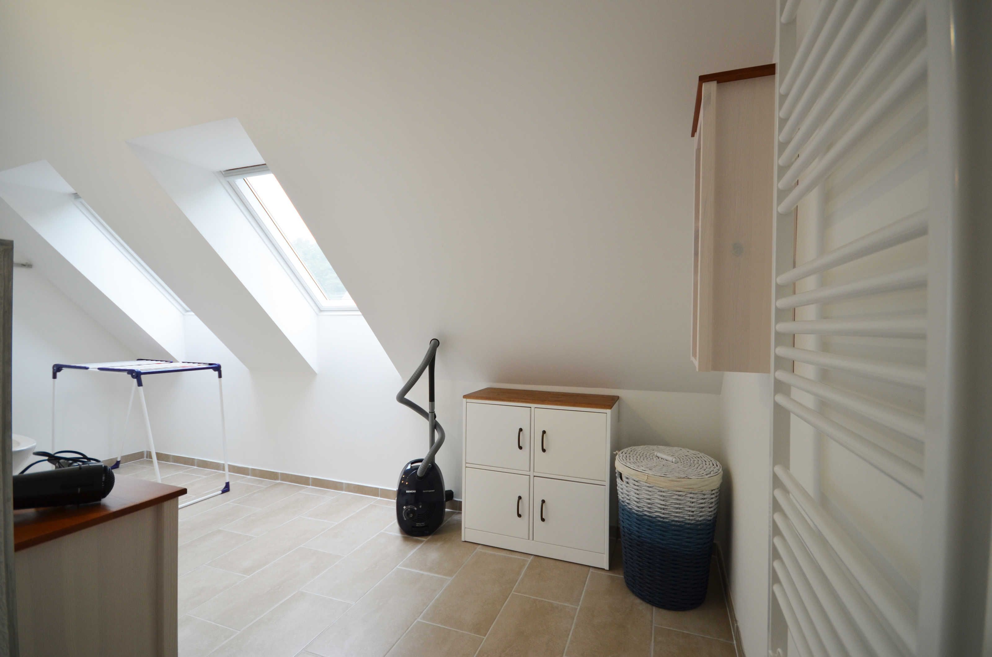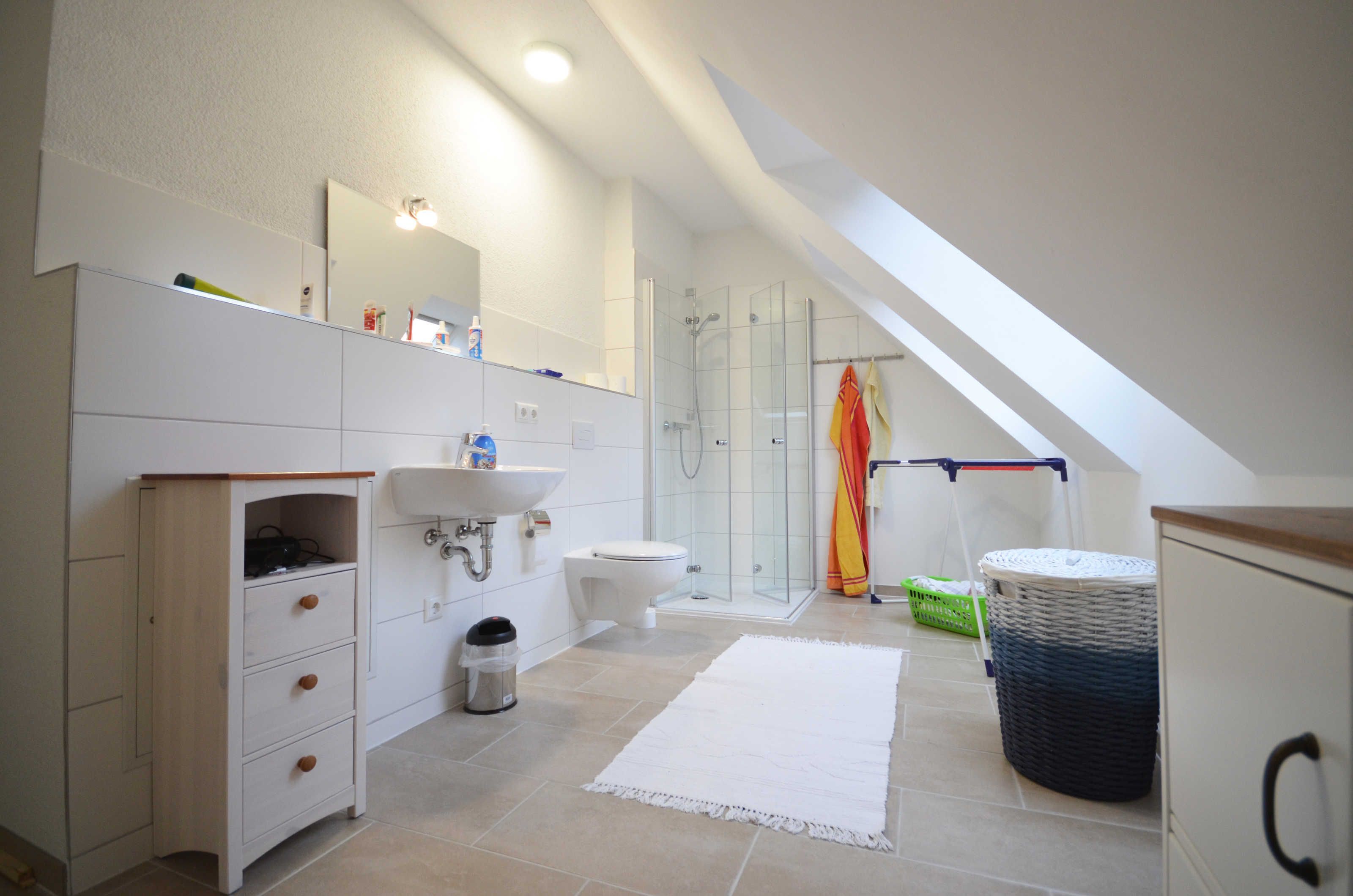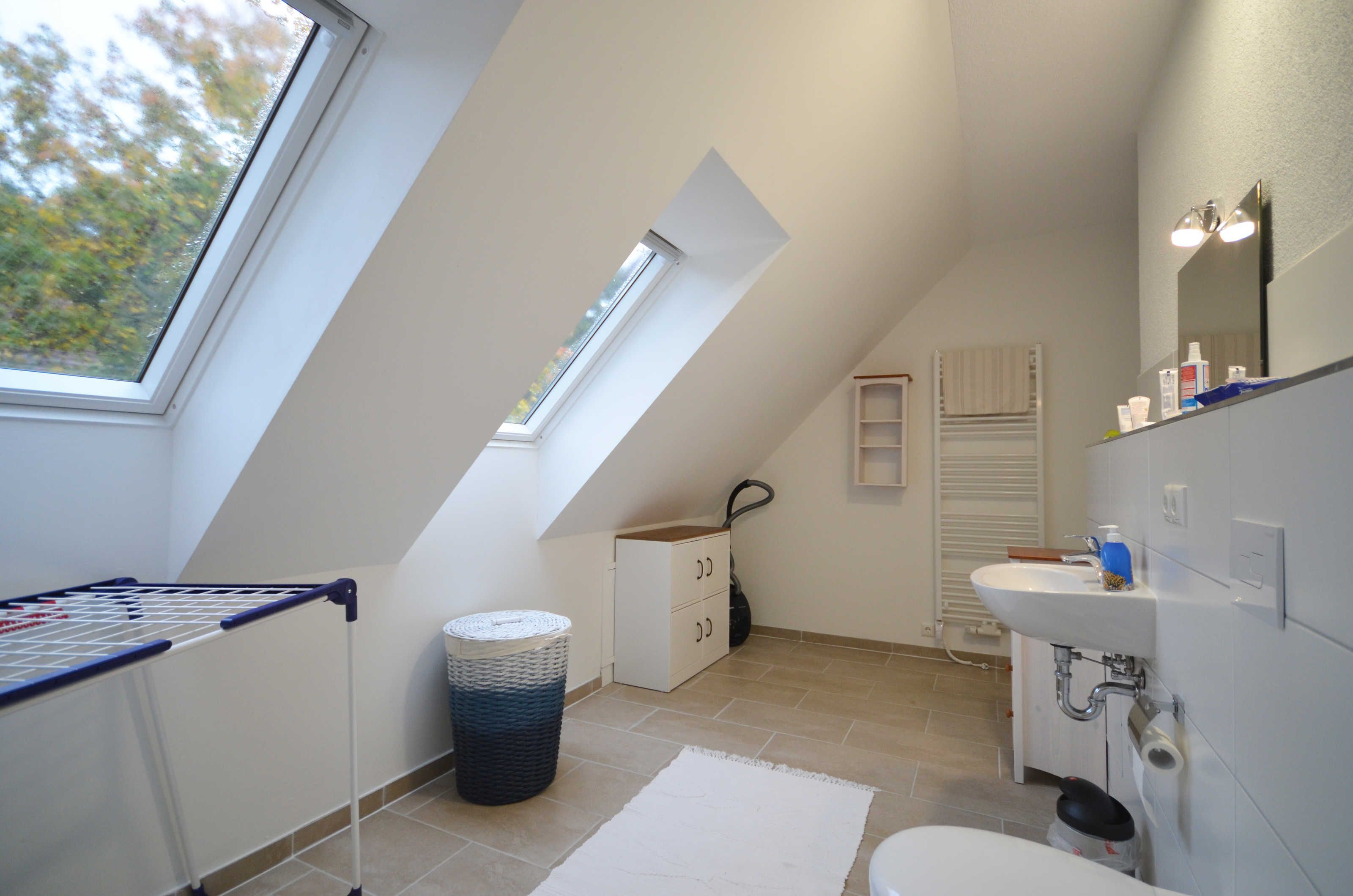 • Im Bad (1. Etage) befindet sich die Dusche, Waschbecken, Toilette und ein Handtuchheizkörper.