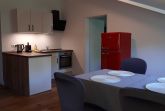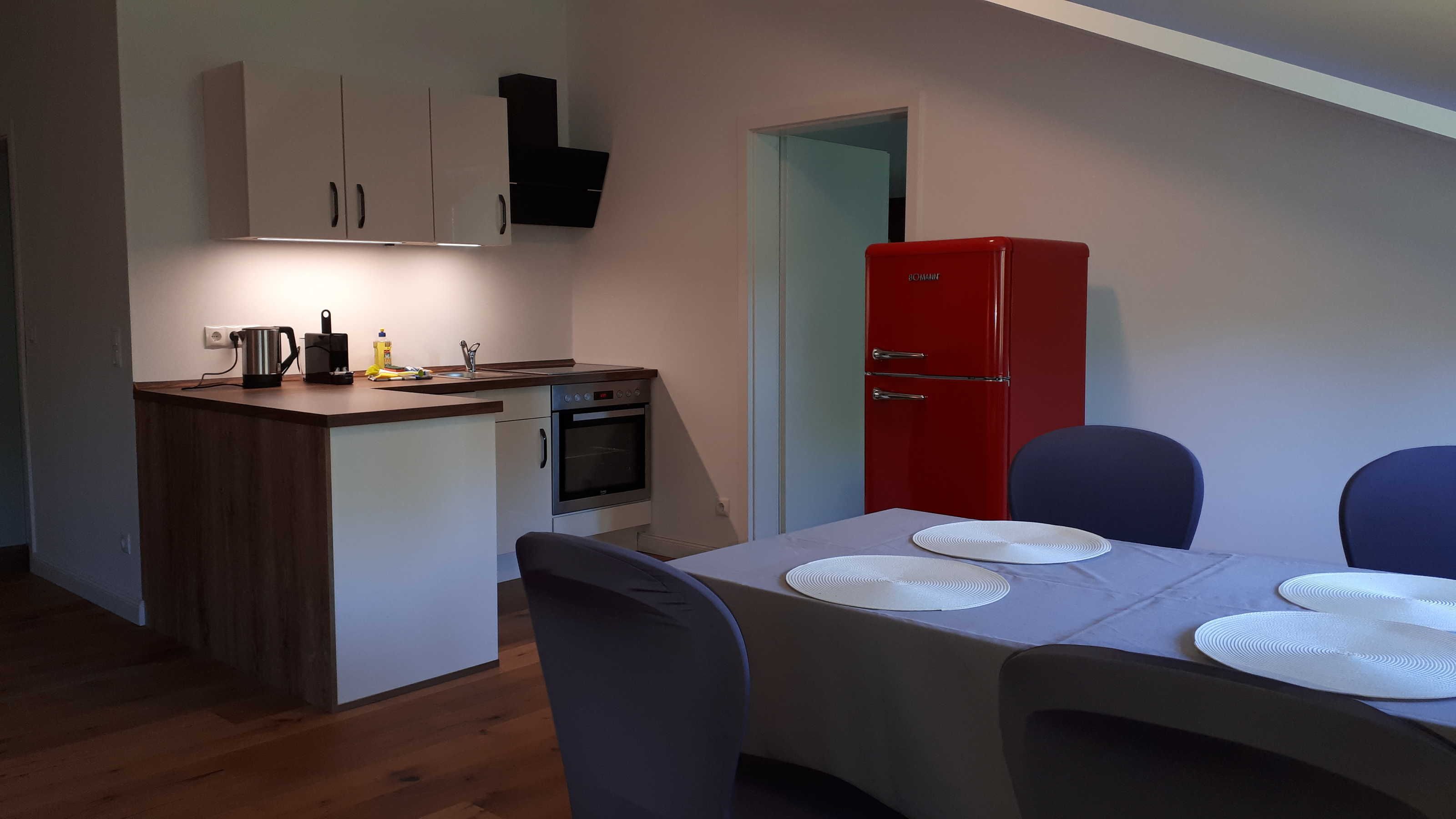 Alle Wohnungen sind ausgestattet mit einer modernen Küchenzeile, einem Kühlschrank und einer Backofen-/Mikrowellen-Kombination. In Anlehnung an das Gesamtkonzept der Kontraste ist das klassische Schloss innen hochmodern eingerichtet. So gibt es auch für Feriengäste sowohl modern, als auch klassisch ausgestattete Apartments.