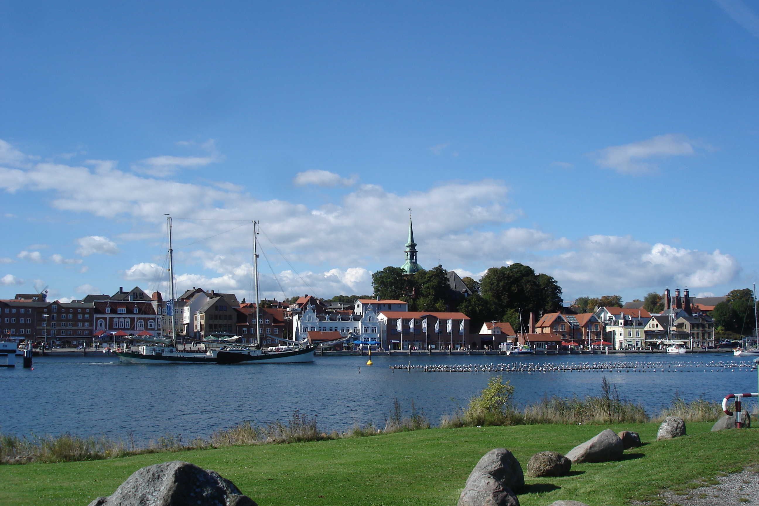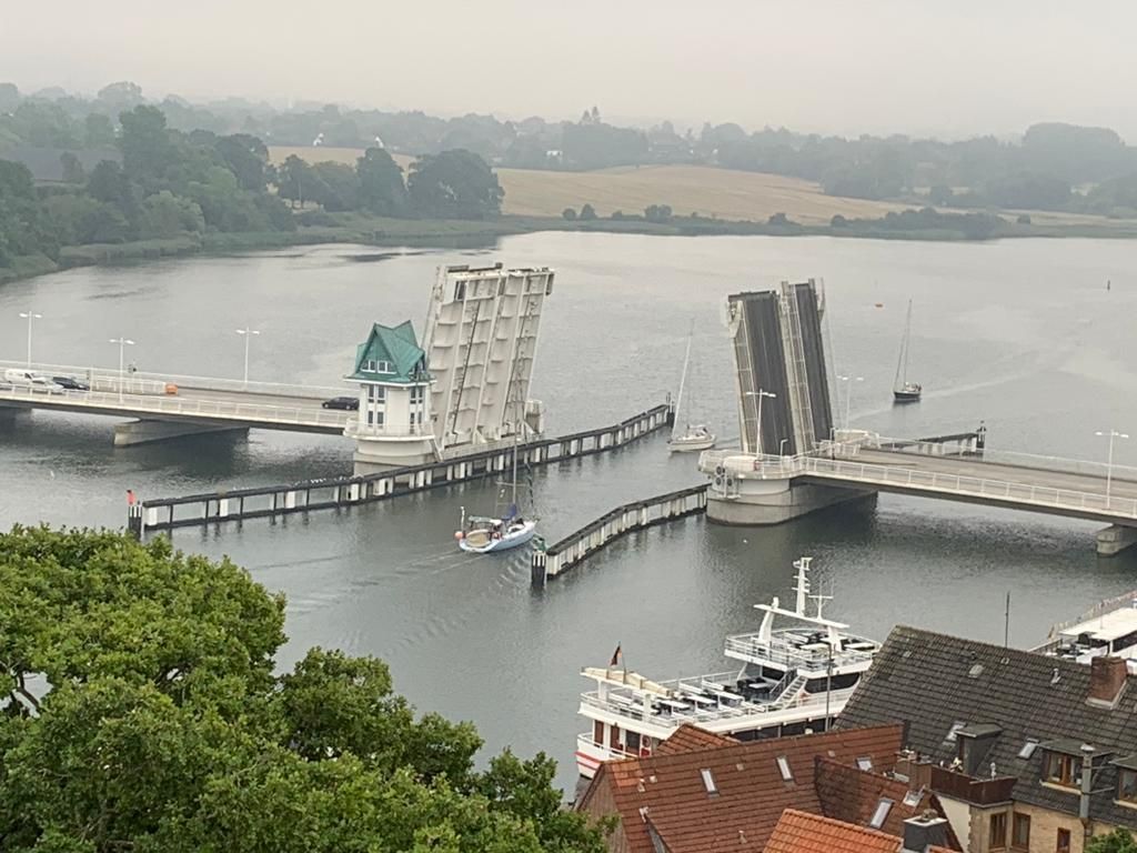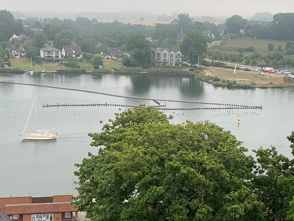 Der Balkon ist mit zwei Stühlen, Tisch, und Sonnenschirm ausgestattet mit einem wunderschönen Blick auf die Nicolai Kirche und auf die Schlei.