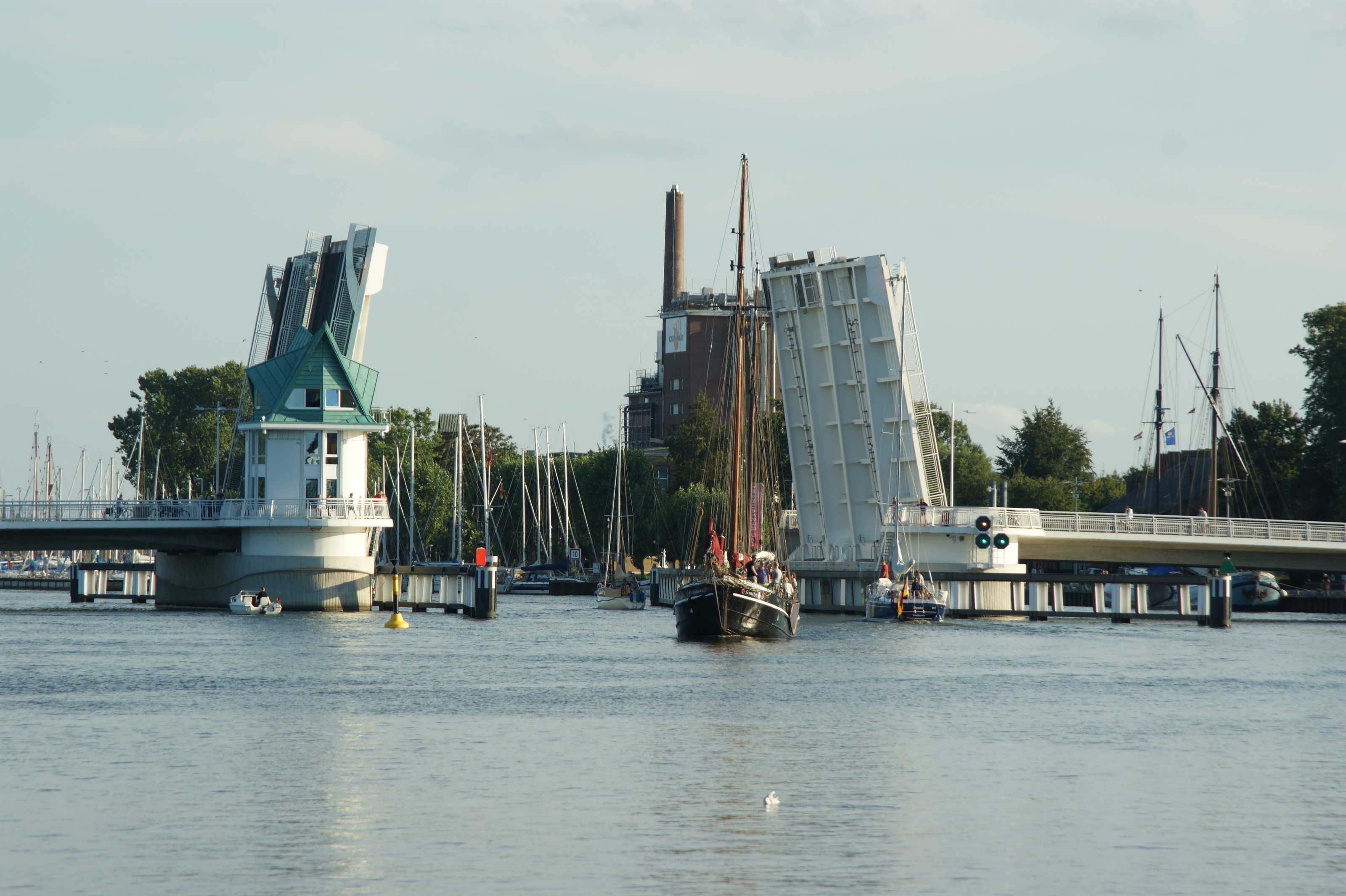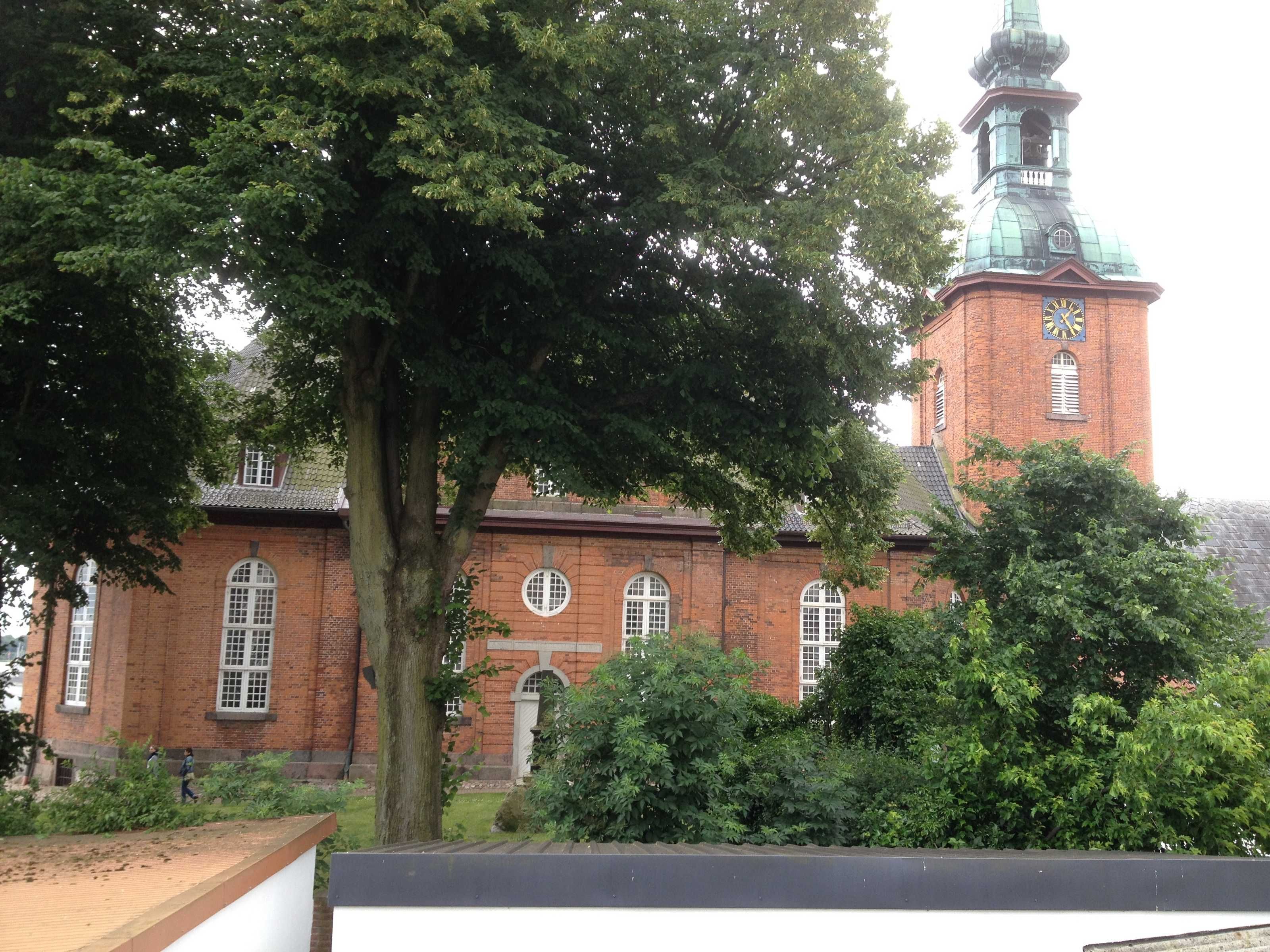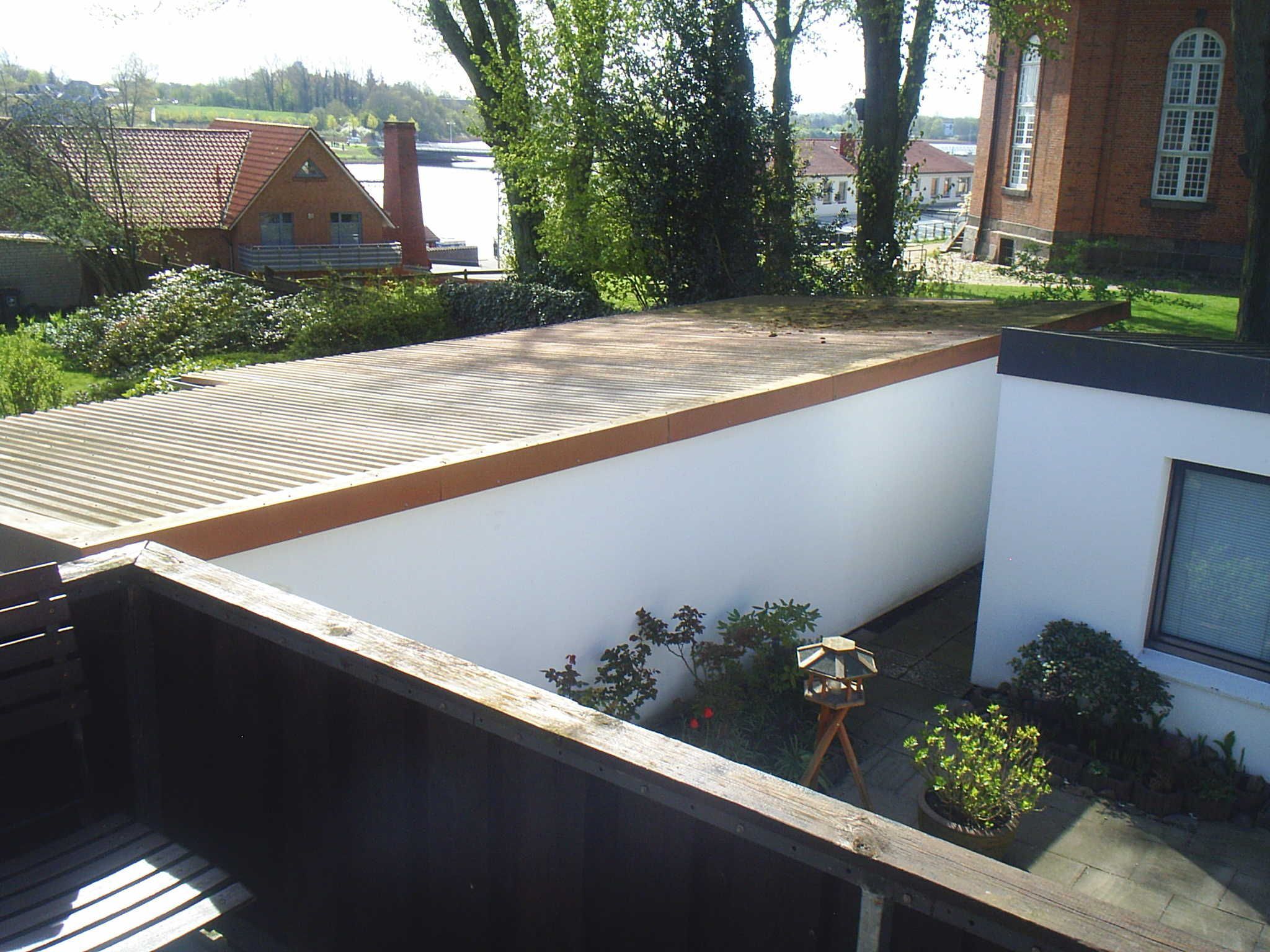 Der Balkon ist mit zwei Stühlen, Tisch, und Sonnenschirm ausgestattet mit einem wunderschönen Blick auf die Nicolai Kirche und auf die Schlei.