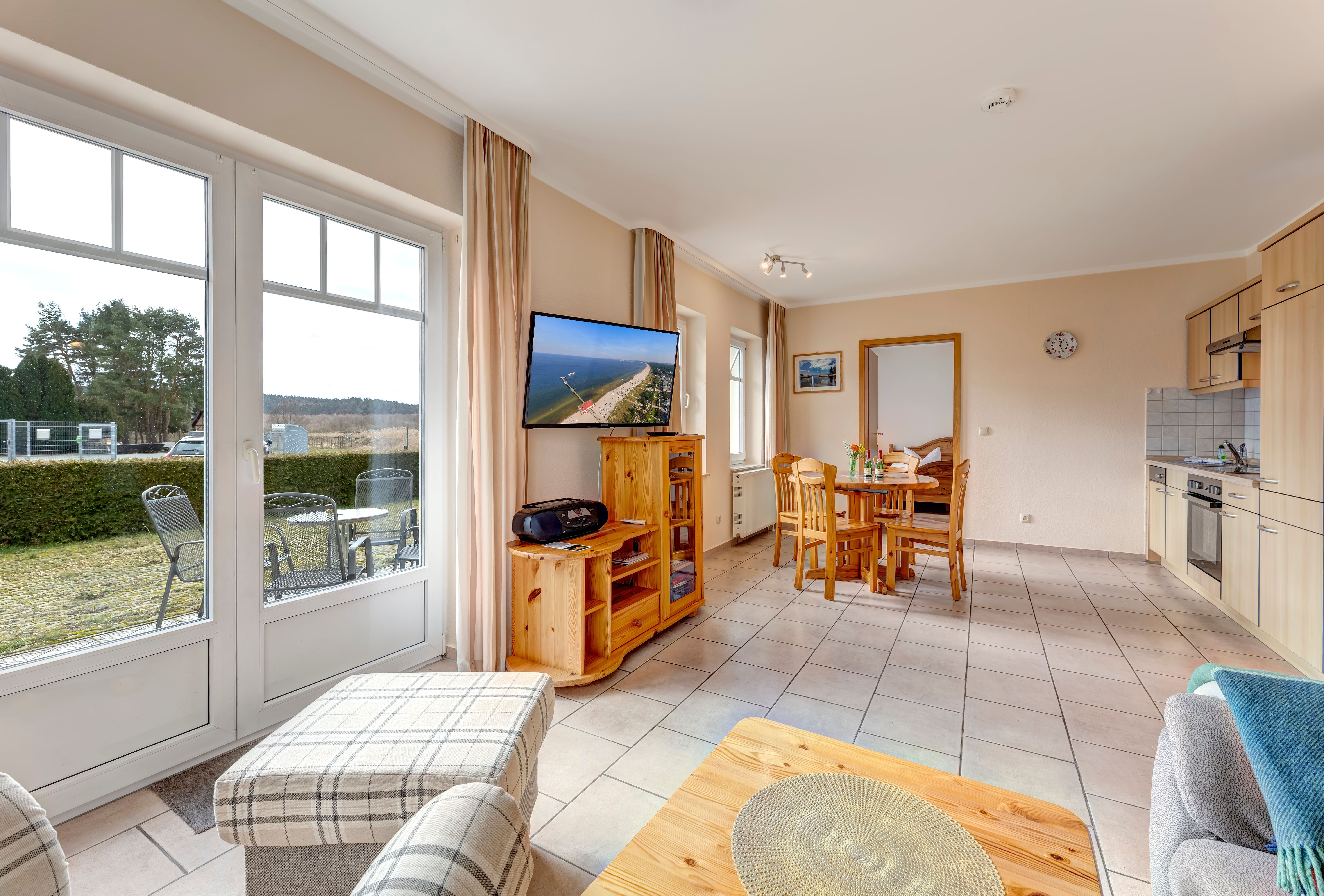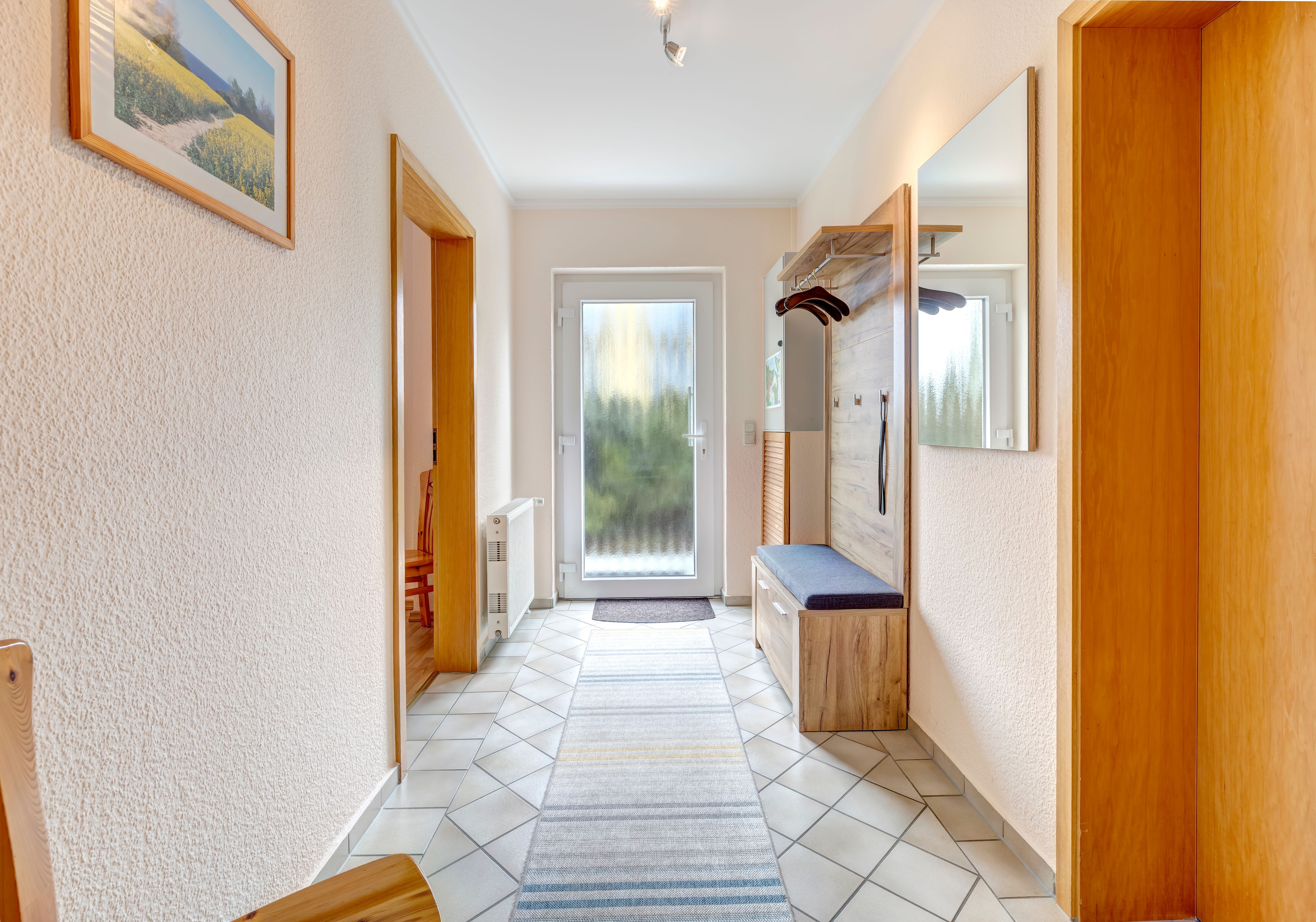 Die gemütliche und komfortable Nichtraucher-Ferienwohnung ist ca. 72m² groß und befindet sich aufgrund der Hangbauweise im Parterre und Tiefparterre. Das großzügige Wohnzimmer verfügt über eine gemütliche Couch, einen Fernseher, Radio und einer offenen und vollausgestatten Küchenzeile mit Spülmaschine, 4-Platten-Ceranherd/Backofen, Kühlschrank/Gefrierfach, Mikrowelle, Kaffeemaschine, Toaster, Wasser- und Eierkocher. Die beiden Schlafzimmer sind mit je einem Doppelbett ausgestattet, eines davon mit einer zusätzlichen Einzelschlafliege. Das Badezimmer verfügt über eine Dusche und über einen beleuchteten Kosmetikspiegel. Kinderbett und ein Hochstuhl können bereitgestellt werden. Nutzen Sie auch den schönen Außenbereich im Grünen mit Gartenmöbeln und Grill. Die Erstausstattung Bettwäsche und Handtücher sind bereits im Preis enthalten. Die Ferienwohnung verfügt über Internetzugang via W-LAN ist kostenfrei nutzbar. Zu der Wohnung gehören 2 Terrassen, sowie zwei Parkplätze direkt an einer der beiden Terrassen. Zusätzlich ist ein Safe für Ihre Wertsachen in der Wohnung vorhanden. Die Wohnung erreichen Sie barrierefrei vom Parkplatz aus über eine Rampe von der Terrasse.
