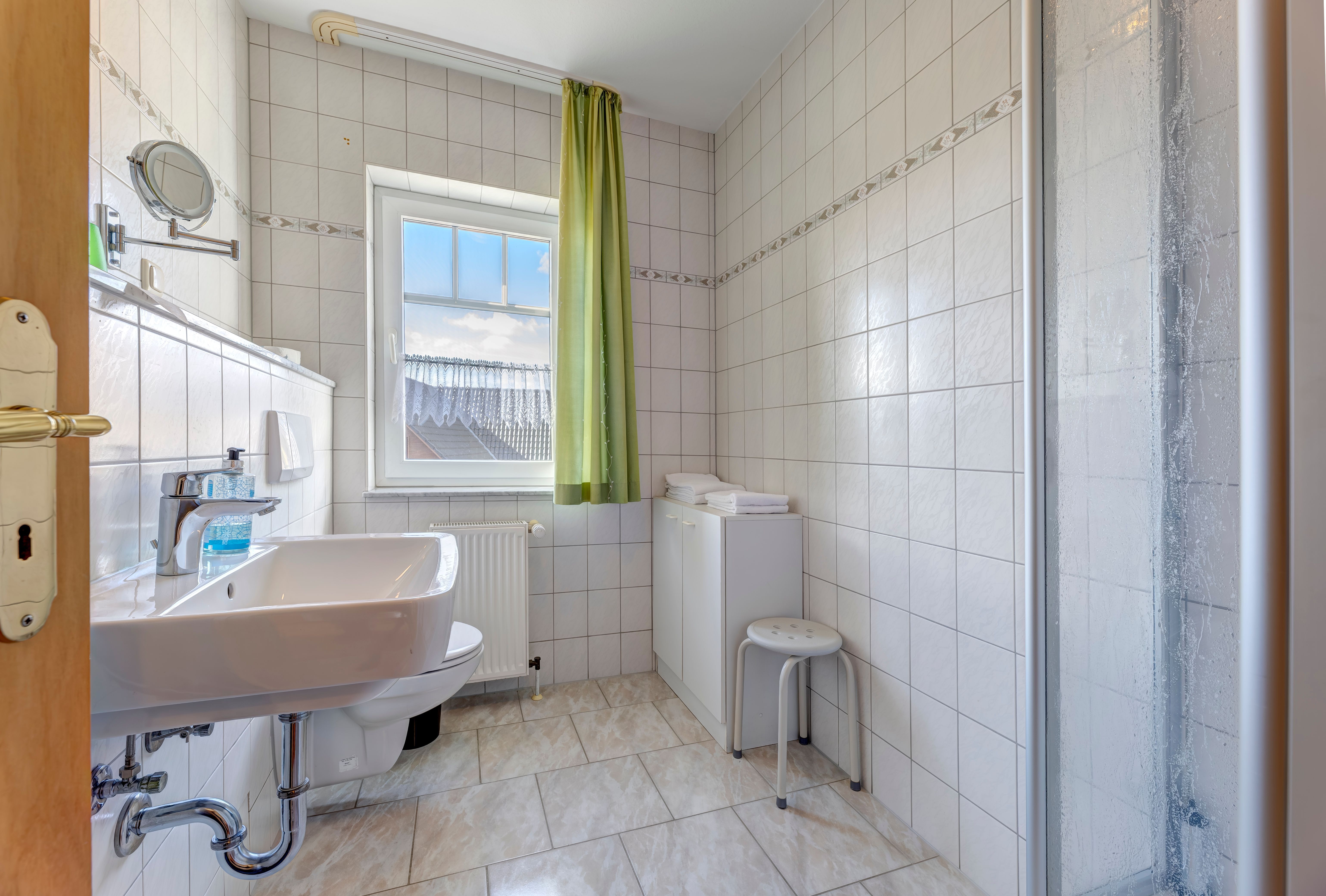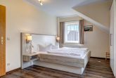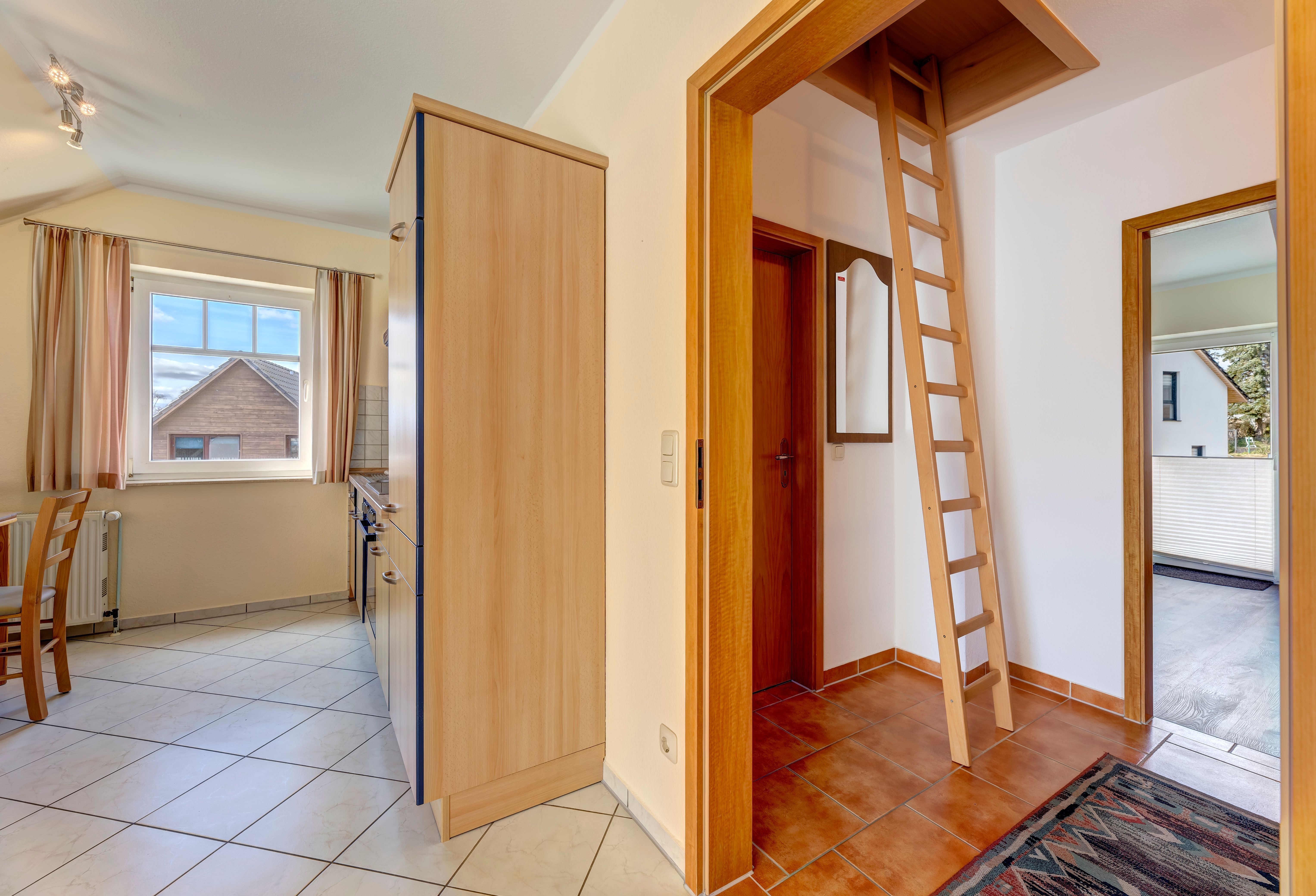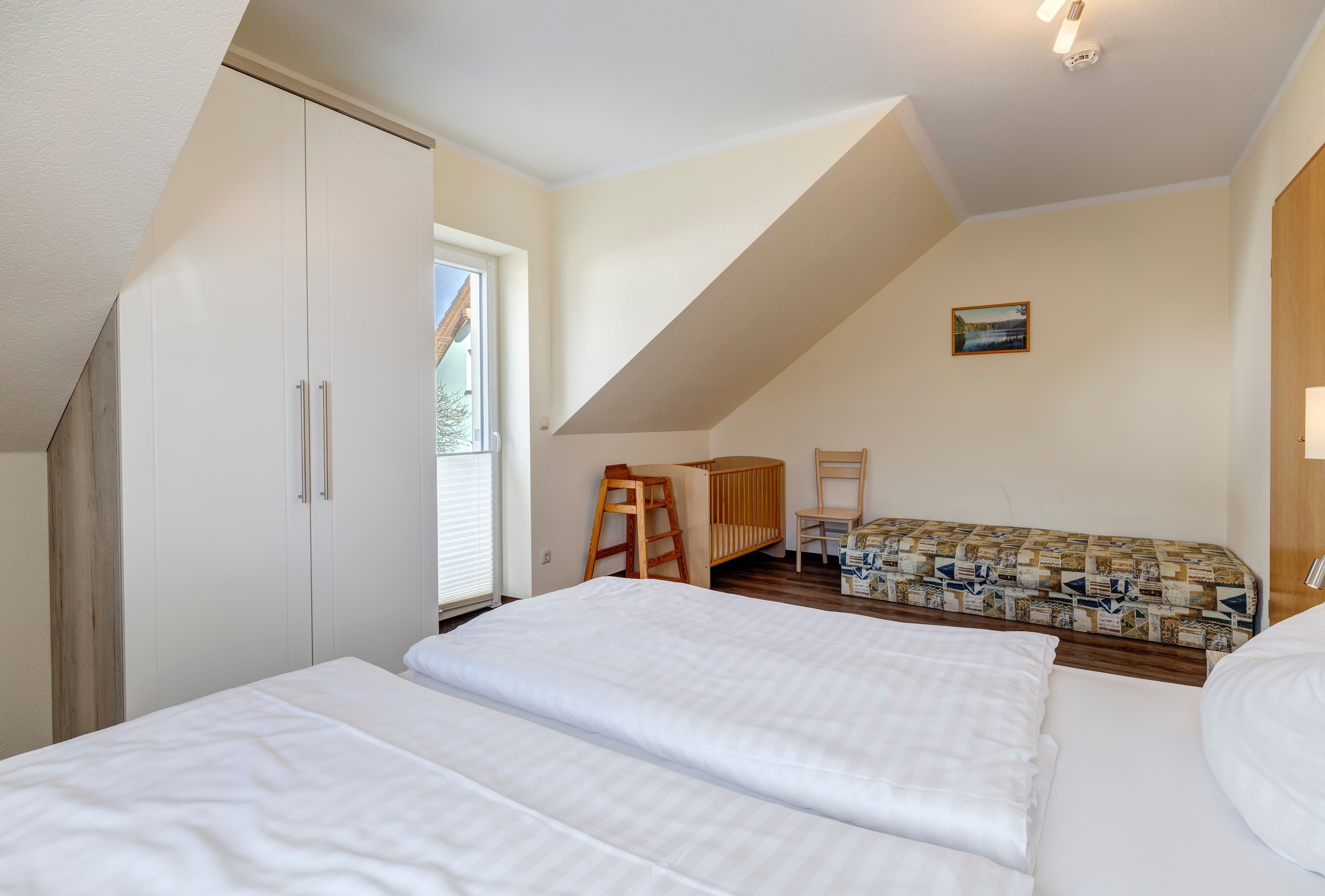 Die komfortable Nichtraucher-Ferienwohnung mit Balkon ist ca. 50m² und befindet sich in der 1. Etage des Hauses. Das gemütliche Wohnzimmer ist mit einer Couch, einem Fernseher und einem Radio mit CD-Player ausgestattet. Die Kochzeile, die sich ebenfalls im Wohnzimmer befindet ist mit allen notwendigen Utensilien, sowie Wasserkocher, Toaster, Eierkocher, Mikrowelle und Kaffeemaschine ausgestattet. Das Schlafzimmer verfügt über ein Doppelbett. Das Badezimmer ist mit einer Dusche, einem Kosmetikspiegel und mit einem Fön ausgestattet. Über eine Leiter vom Flur sind die beiden Schlafplätze im kuscheligen, verschließbaren Spitzboden (mit Dachfenster) der Ferienwohnung zu erreichen. Diese Schlafplätze können auf Anfrage gebucht werden.