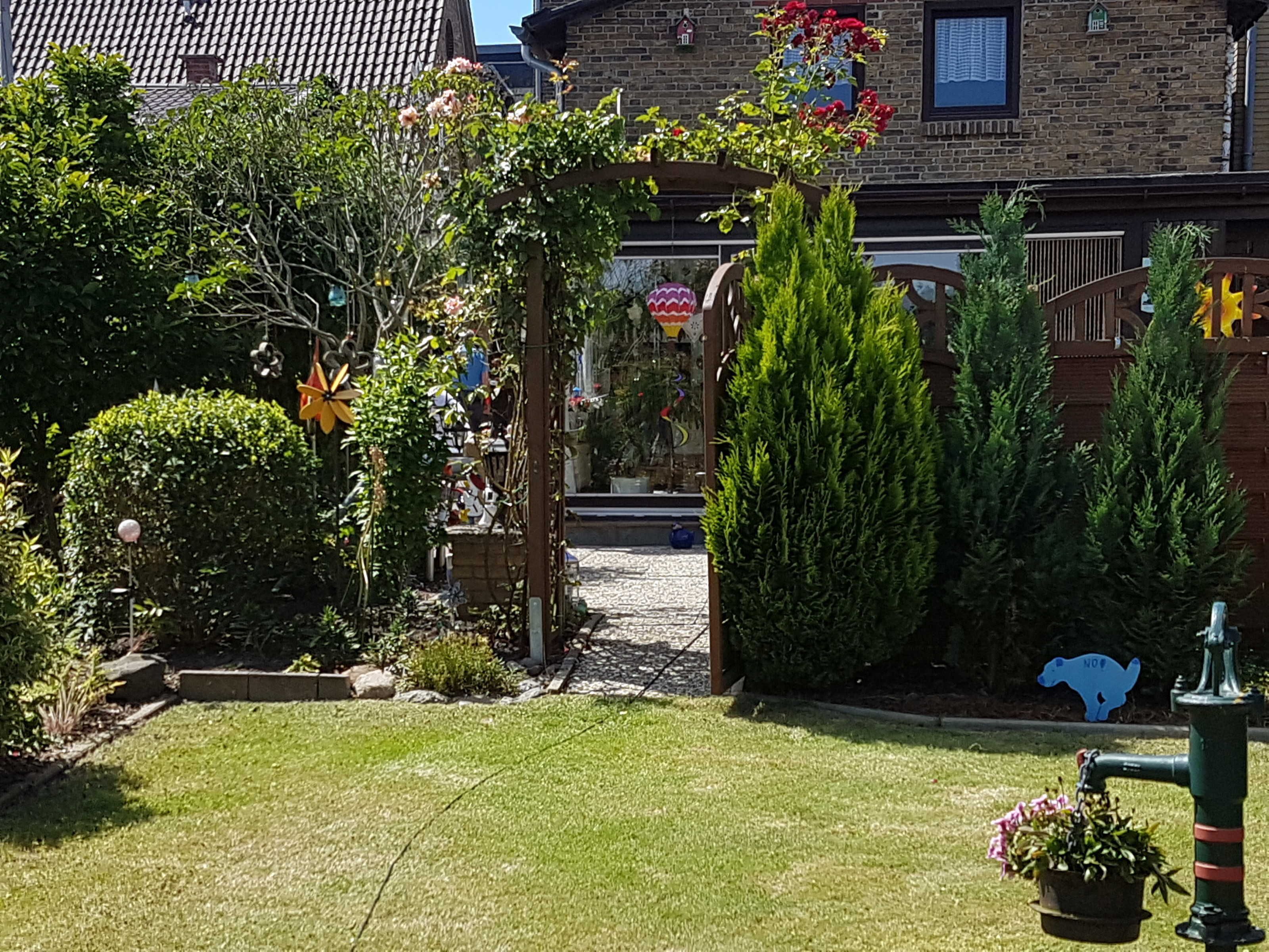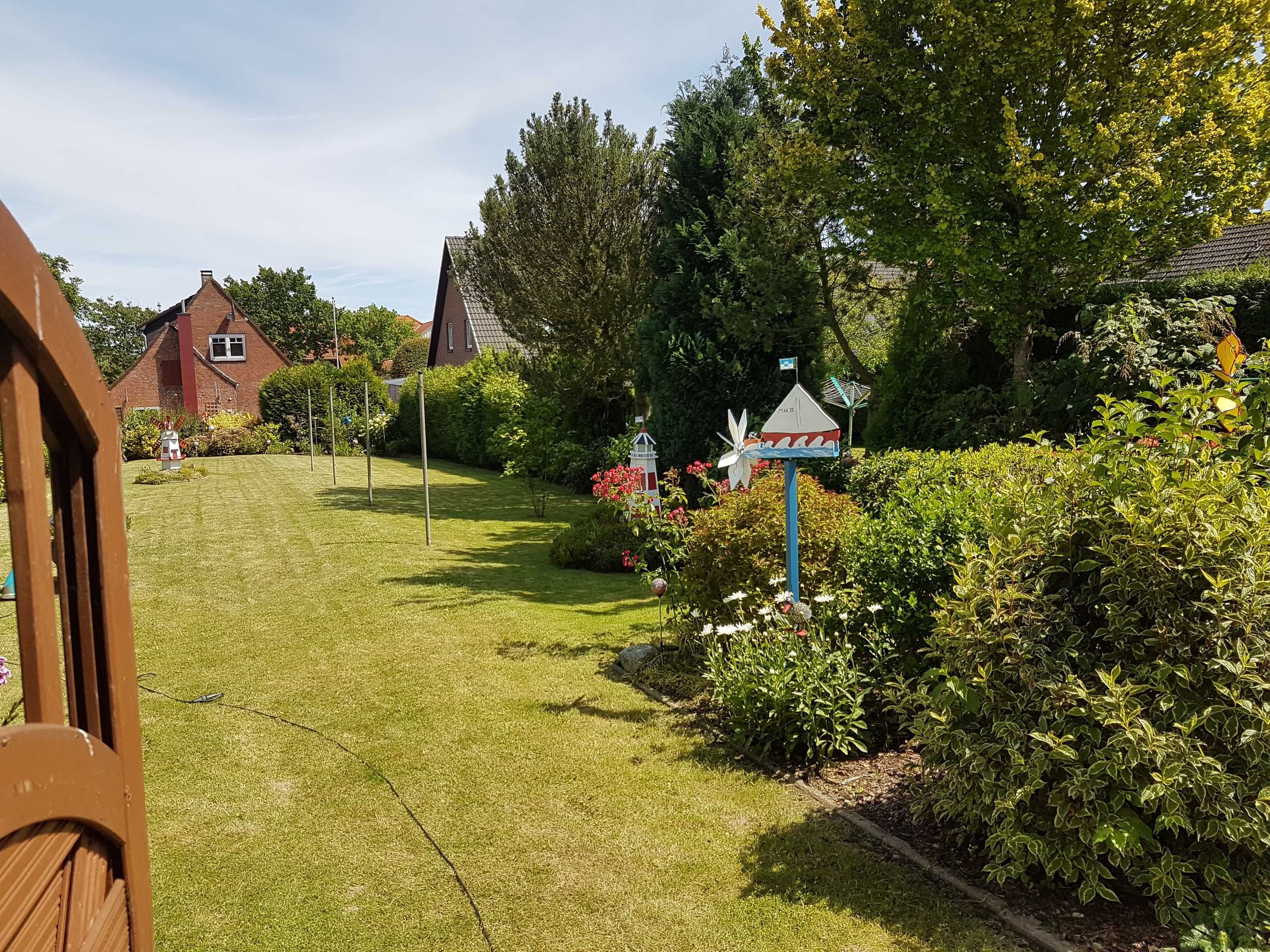 Eine einladende Terasse mit Gartenmöbeln, einem Grill und einer großen Liegewiese läd zum Entspannen ein.