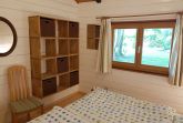 Das Blockhaus ist 54qm groß und bietet Schlafmöglichkeiten für 5 Personen. Es verfügt neben einem Schlafzimmer mit Doppelbett über ein Schlaf-/ oder Kinderzimmer mit Etagen- und Einzelbett sowie wahlweise zusätzlichem Kinderbett. Über den Flur erreicht man den Wohnbereich mit Südterrasse, integrierter Küche und Esstisch sowie das Badezimmer.