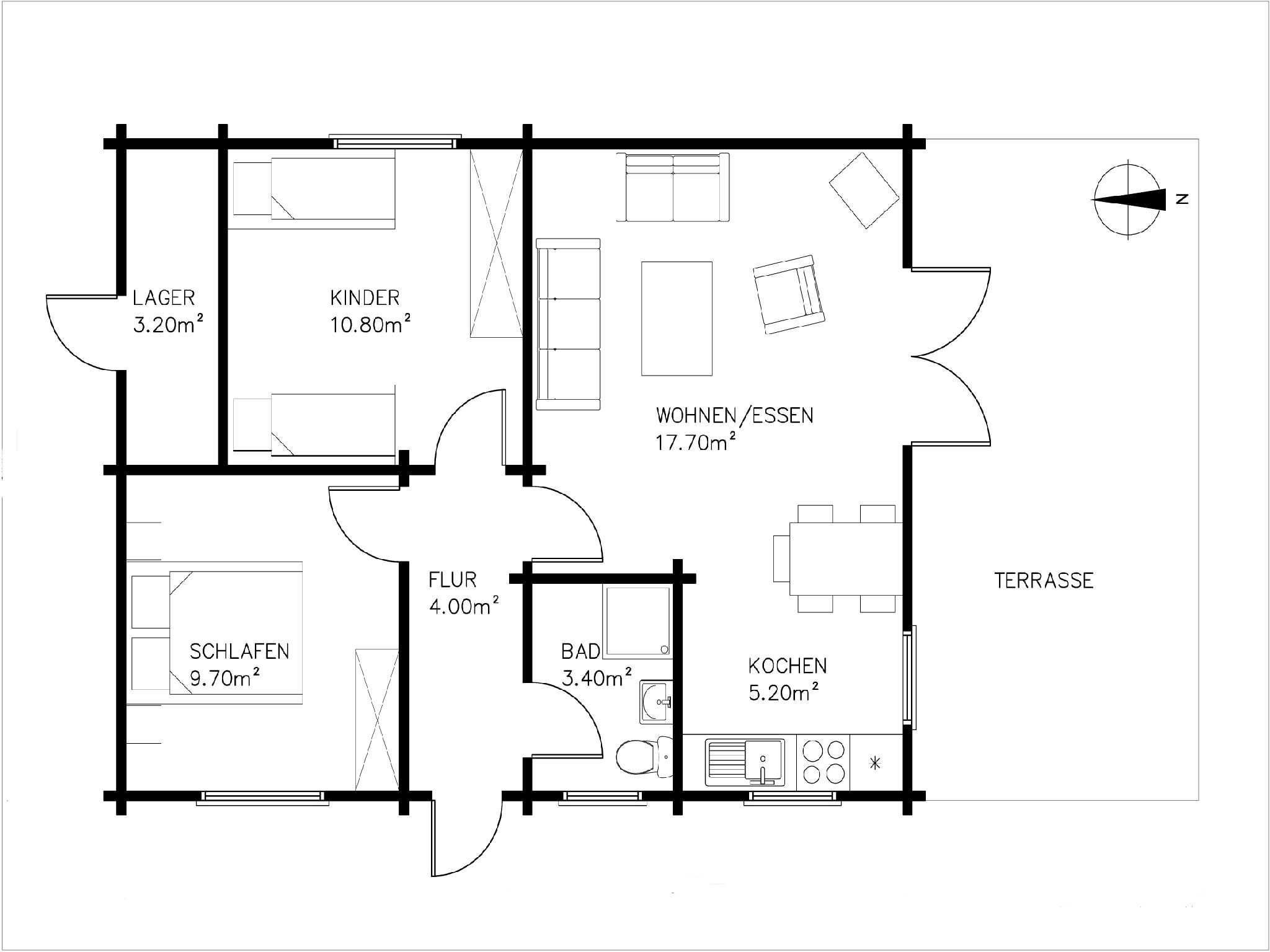 Ausstattung Das Ferien-Blockhaus ist 54 qm groß und für 5 Personen ausgestattet. Es ist gemütlich und komfortabel eingerichtet.