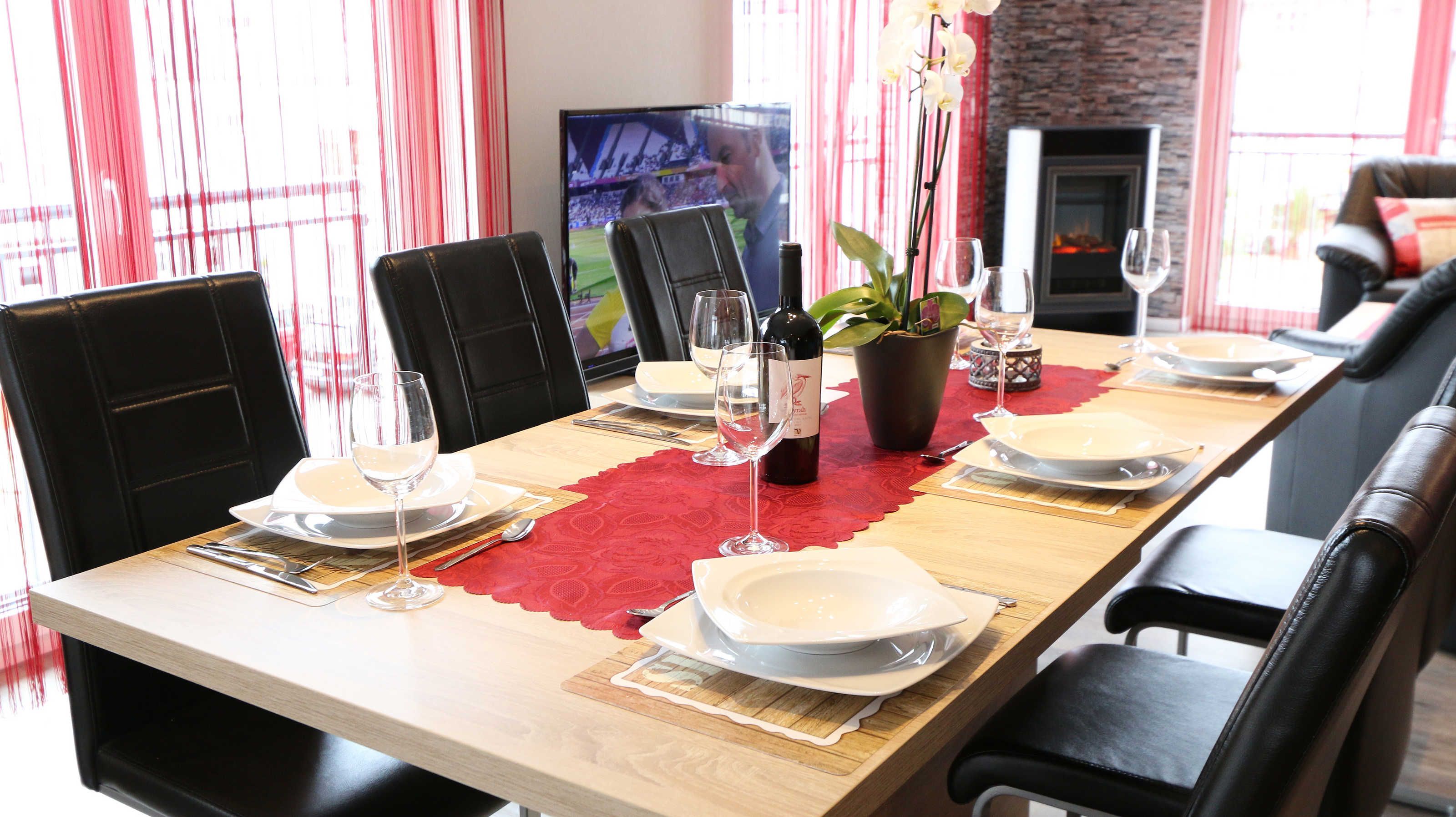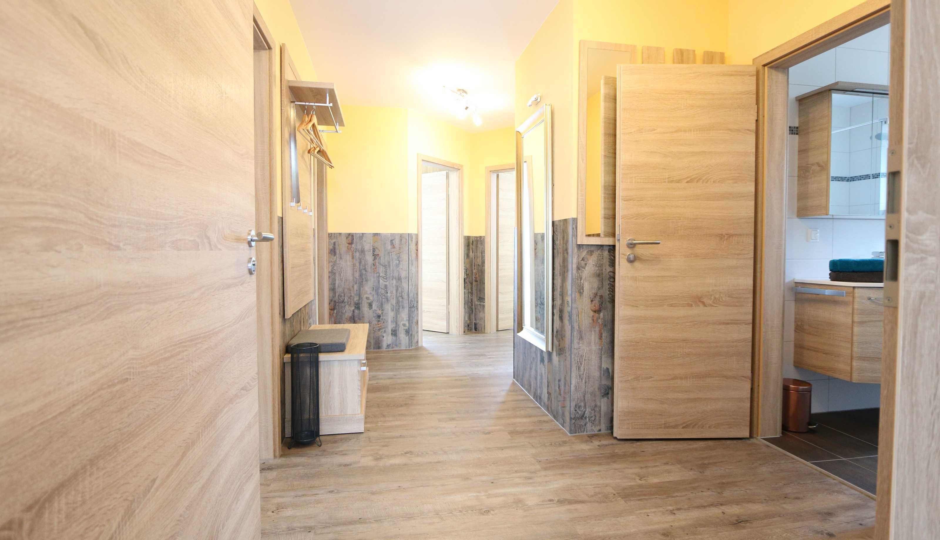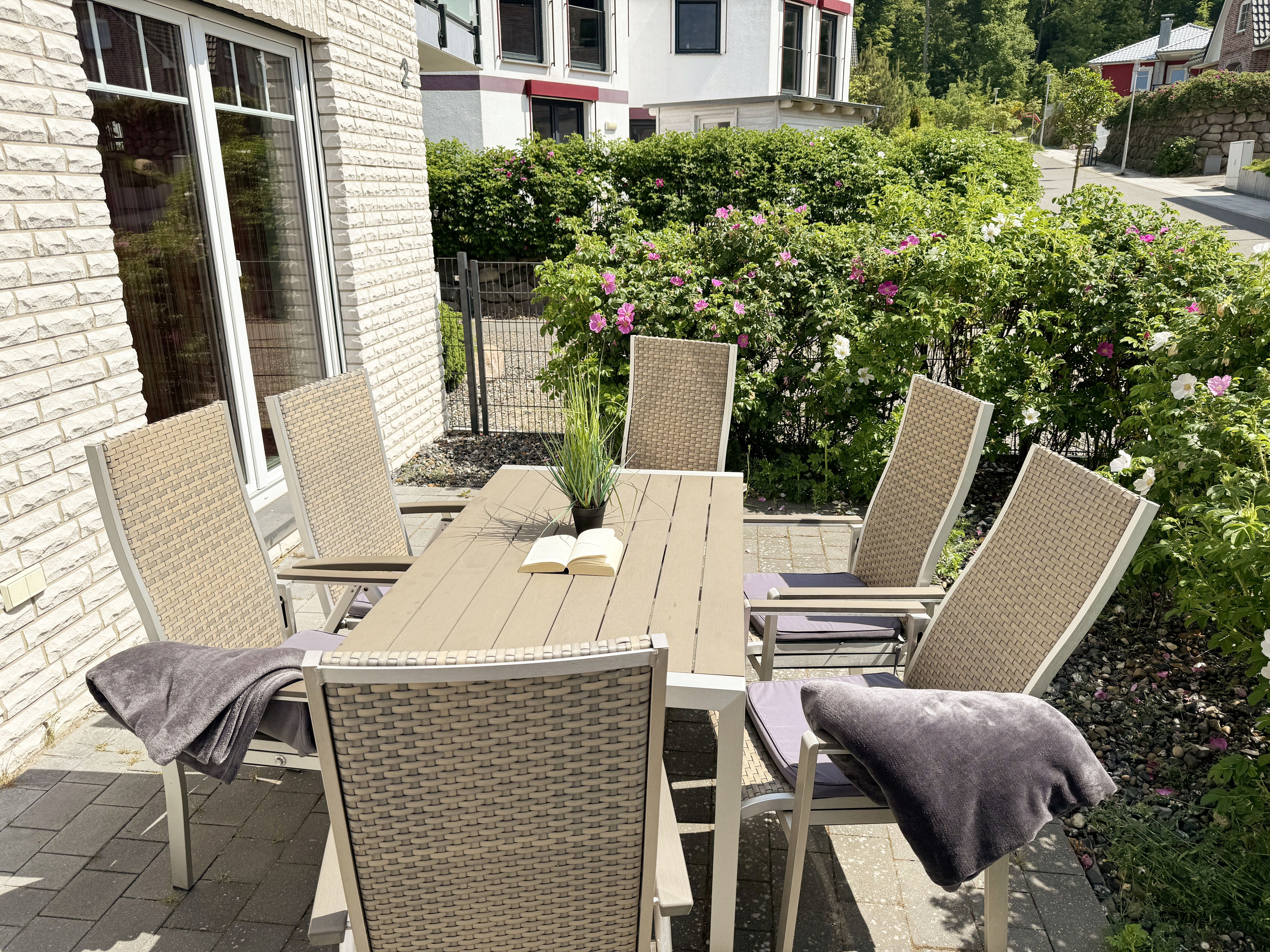 Die komfortabel eingerichtete Ferienwohnung 1 in der Villa Gina mit ca. 108 m² bietet Ihnen ausreichend Platz für 2 bis 6 Erwachsene + 1 Kleinkind bis 3 Jahre im Kinderreisebett. Bereits in der großzügigen Diele erwarten Sie 2 Garderoben. Anschließend kommen Sie in den lichtdurchfluteten Wohn-/Essbereich mit großen bodentiefen Fensterelementen mit einer perfekt geplanten Markenküche. Mit der Kücheninsel mit angrenzendem Tresen und Barhockern werden Sie Freude am gemeinsamen Kochen mit Familie und Freunden haben. Zur Ausstattung gehören ein großer Kühlschrank, Gefrierschrank, Geschirrspüler, Backofen, Ceranfeld sowie eine Mikrowelle. Zu den weiteren kleinen und großen Küchenhelfern gehören Kaffeemaschine, Senseo-Kaffeeautomat, Wasserkocher, Eierkocher, Toaster, elektrische Zitruspresse, Standmixer, Hand- und Stabmixer. Die LED-Beleuchtung an Sockeln und Tresen machen die Küche zu einem gemütlichen Aufenthaltsort. Im angrenzenden Essbereich haben 6 Personen auf bequemen Schwingstühlen ausreichend Platz, ihre Mahlzeiten zu genießen. Im Wohnbereich können Sie es sich auf der großen Ledercouch oder dem Ledersessel bequem machen. Mit einem guten Buch können Sie sich hier entspannen oder auf dem 55 Zoll Smart-TV in Full-HD-Qualität mit Sky (Auswahl von Sport, Film, Dokumentation), LED-Hintergrundbeleuchtung und Netflix Ihre Lieblingssendung anschauen. Auf dem Blu-Ray Player mit USB können Sie Ihre mitgebrachten Filme abspielen. Eine Stereoanlage mit CD, USB und Bluetooth, die auf einem großen Sideboard steht sowie WLAN runden das Entertainmentequipment ab. Die Fußbodenheizung sorgt in Kombination mit den exklusiven Designböden für ein sehr angenehmes Raumklima. Eine automatische Be- und Entlüftungsanlage sorgt zudem für einen hohen Wohnkomfort. Der elektrische Kaminofen bringt Behaglichkeit an kühleren Tagen. Die Terrasse in Südausrichtung mit Ampelschirm sowie eine überdachte Ost-Terrasse sind vom Wohnbereich zu erreichen und bieten zudem einen Kugelgrill. Falls Sie mit Ihrem vierbeinigen Freund gegen eine Gebühr anreisen, ist selbstverständlich in dem rund 47 m² großen Wohn-/Essbereich ausreichend Platz vorhanden für den mitgebrachten Schlafplatz. Elektrische Rollläden befinden sich an der Süd- und Westseite des Raumes. Ein paar Gesellschaftsspiele, Holzspielzeug für die kleinen Gäste sowie einige Bücher finden Sie ebenfalls vor. Kindersicherungen an den zugänglichen Steckdosen sind vorhanden. Für Ihren erholsamen Schlaf stehen Ihnen insgesamt 3 komfortable Schlafzimmer zur Verfügung. In 2 Schlafzimmern finden Sie jeweils ein Boxspringbett mit Taschenfederkernmatratzen und Komfort-Topper in der Größe 1,60m x 2,00m, Nachttischablagen mit dimmbarer Beleuchtung und USB zum Aufladen von Handys oder E-Books, Radiowecker, einen Kleiderschrank sowie einen 32 Zoll-Flachbild-TV mit Smart-TV. Beide Schlafzimmer haben elektrische Rollläden. Im 3. Schlafzimmer befindet sich ein Boxspring-Einzelbett (1,00m x 2,00m) sowie eine bequeme Schlafcouch (1,50m x 2,00m), die tagsüber als Sofa dient. Abgerundet wird das Schlafzimmer mit einem 32 Zoll-Flachbild-TV mit Smart-TV sowie einem Kleiderschrank und 2 Nachttischablagen mit dimmbarer Beleuchtung sowie Radiowecker. Verdunklungsvorhänge sorgen für einen ungestörten Schlaf. Die beiden hochwertigen Tageslicht-Bäder mit Fußbodenheizung sorgen dafür, dass es zu keinem morgendlichen Stau kommt. Das eine Badezimmer ist ausgestattet mit einer bodentiefen Echtglasdusche, Badewanne, 2 Waschplätzen und Spiegelschrank, WC, Kosmetikspiegel, Handtuchtrockner und Fön. Das zweite Bad hat eine Walk-In-Dusche, 1 Waschtisch und Spiegelschrank, WC sowie ebenfalls Handtuchtrockner und Fön. Zusätzlich gibt es in der Wohnung noch einen Abstellraum. Hier befinden sich ein Hochstuhl für die kleinen Gäste sowie Staubsauger und Reinigungsutensilien. Im Untergeschoss befindet sich ein Wirtschaftsraum mit Waschmaschine und Trockner, die kostenfrei genutzt werden können. Ein Wäschetrockner, Bügelbrett und ein Bügeleisen stehen Ihnen ebenfalls zur Verfügung. Des Weiteren finden Sie hier die gemeinschaftliche Sauna mit einer separaten Walk-In-Dusche mit Waschbecken und WC sowie einen angrenzenden Ruheraum mit Liegen und Relax-Stühlen, außerdem ein elektrischer Wandkamin und eine atemberaubende Fototapete. Lassen Sie sich überraschen. Im Außenbereich finden Sie jeweils einen Parkplatz (Nr.01) sowie einen abschließbaren Fahrradschuppen mit Steckdose zum Aufladen für Ihr E-Bike für jede Wohnung. Darin befinden sich auch die kostenlos zur Verfügung gestellten Bollerwagen für Ihre Strandutensilien. Die Erstausstattung eines Wäschepaketes (komplette Bettwäsche, 1 Duschhandtuch, 1 kleines Handtuch) können Sie bis 14 Tage vor Anreise gegen einen Aufpreis dazu buchen oder durch eigene ergänzen. Ab 2 gebuchten Paketen erhalten Sie einmalig 1 Geschirrhandtuch und 1 Duschvorleger hinzu. Wir wünschen Ihnen einen erholsamen und erlebnisreichen Urlaub!