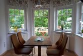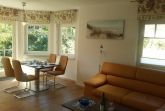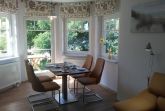Das moderne Wohnzimmer, mit dem Erker als Essplatz, vermittelt ein großzügiges Raumgefühl und bietet eine schöne Aussicht in die Natur, so dass man sich hier richtig wohlfühlt. Die große Couch hat eine Schlaffunktion (2,00 m x 1,40 m), es ist auch eine Aufbettung mittels Campingliege (1,80 m x 0,75 m) möglich. Ein Reisebabybett kann kostenfrei genutzt werden.