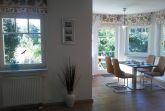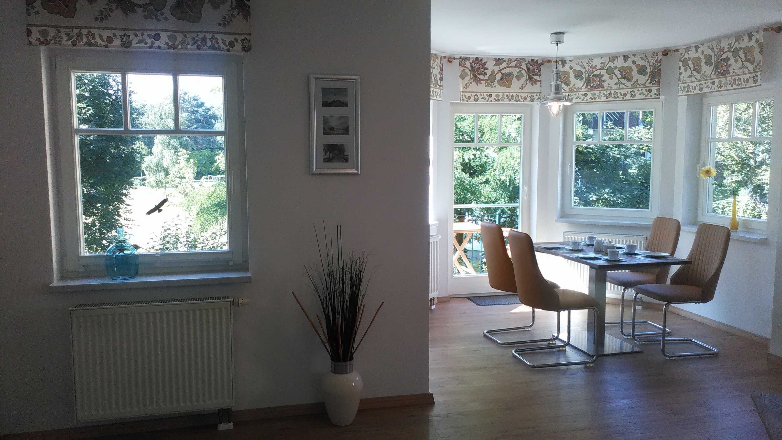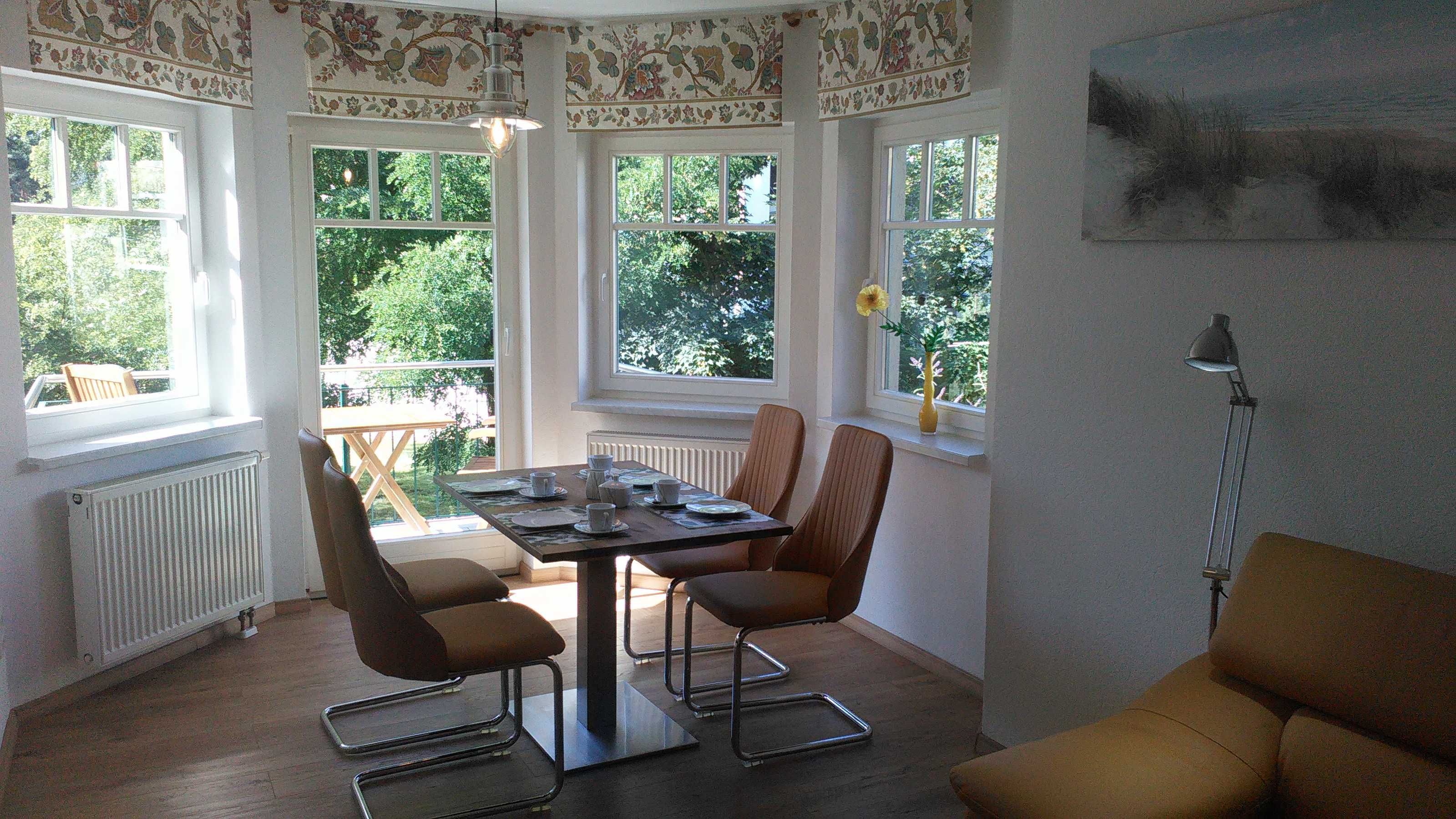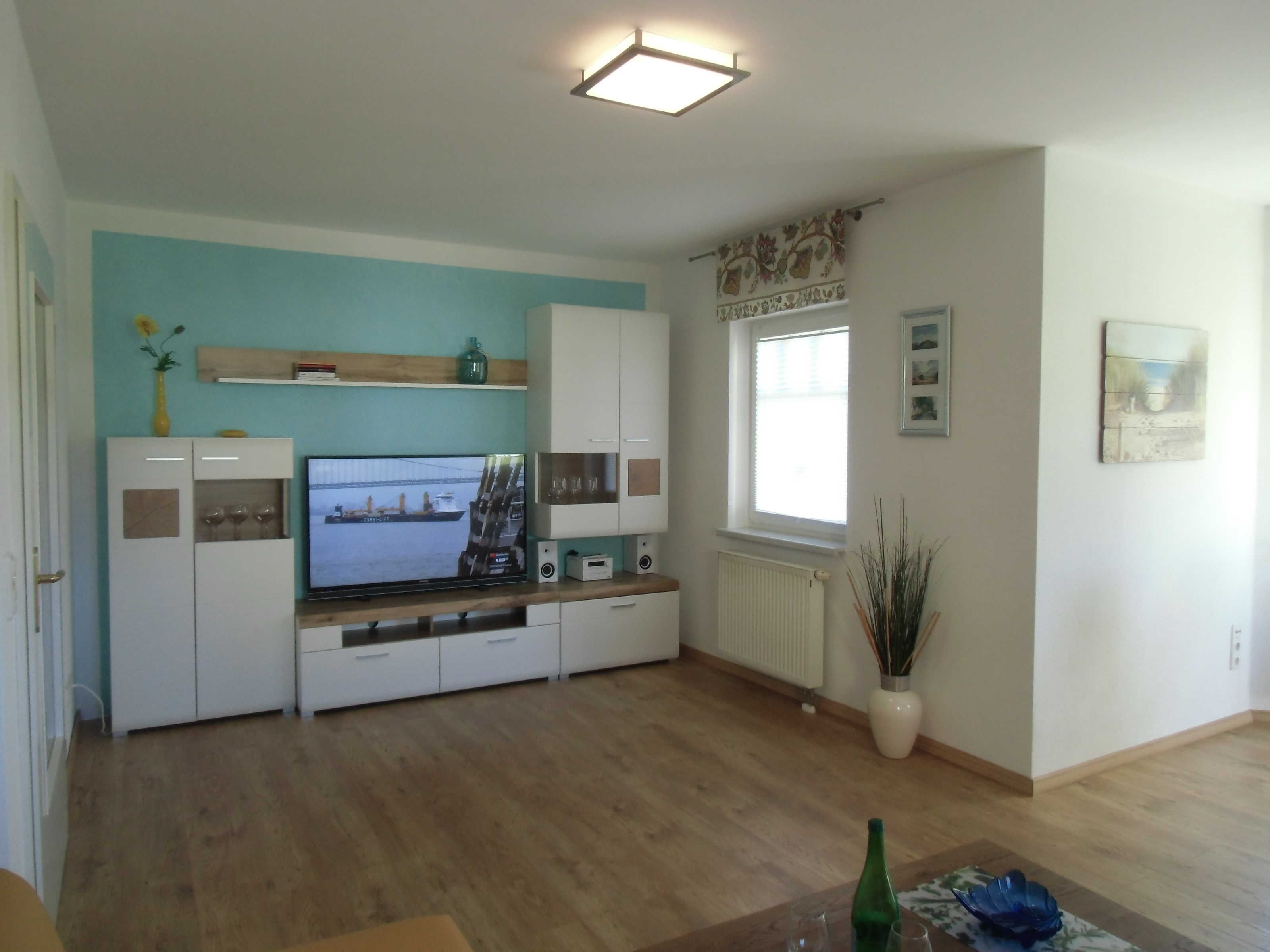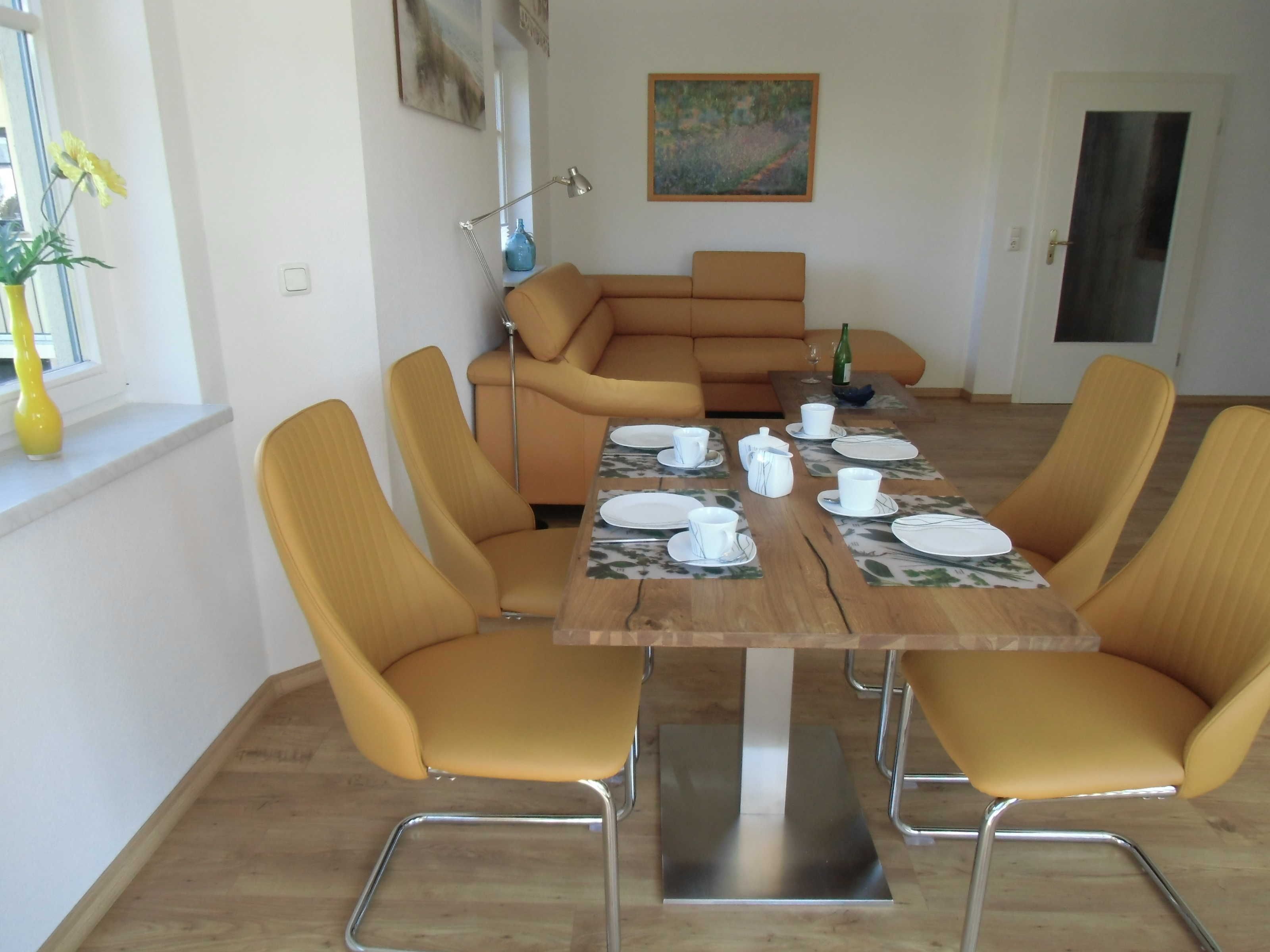 Das moderne Wohnzimmer, mit dem Erker als Essplatz, vermittelt ein großzügiges Raumgefühl und bietet eine schöne Aussicht in die Natur, so dass man sich hier richtig wohlfühlt. Die große gemütliche Couch hat eine Schlafmöglichkeit und bietet viel Platz (2,00 m x 1,40 m), eine weitere Aufbettung ist mittels Campingliege (1,80 m x 0,75 m) möglich, ein Reisebabybett kann kostenfrei genutzt werden.