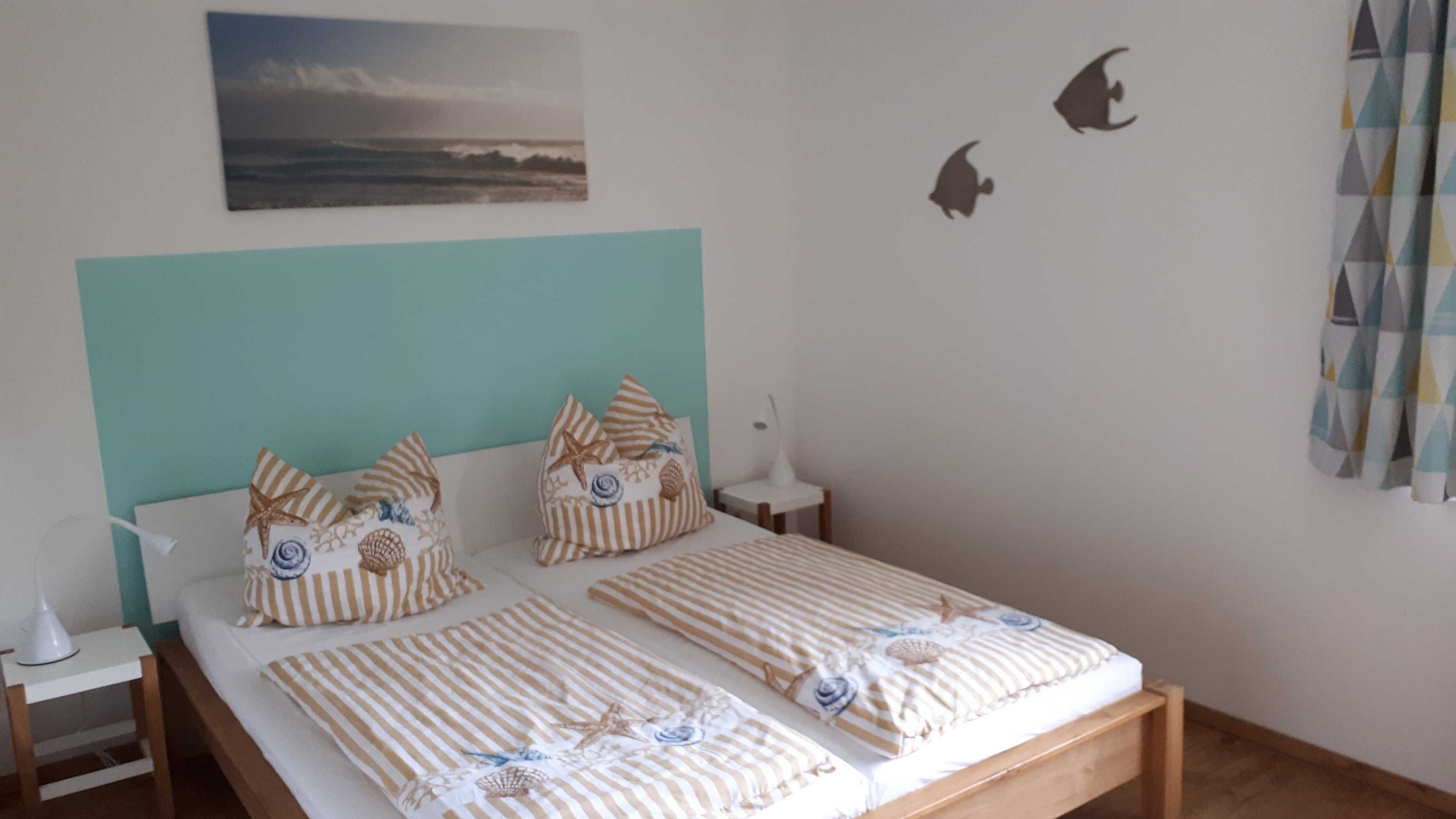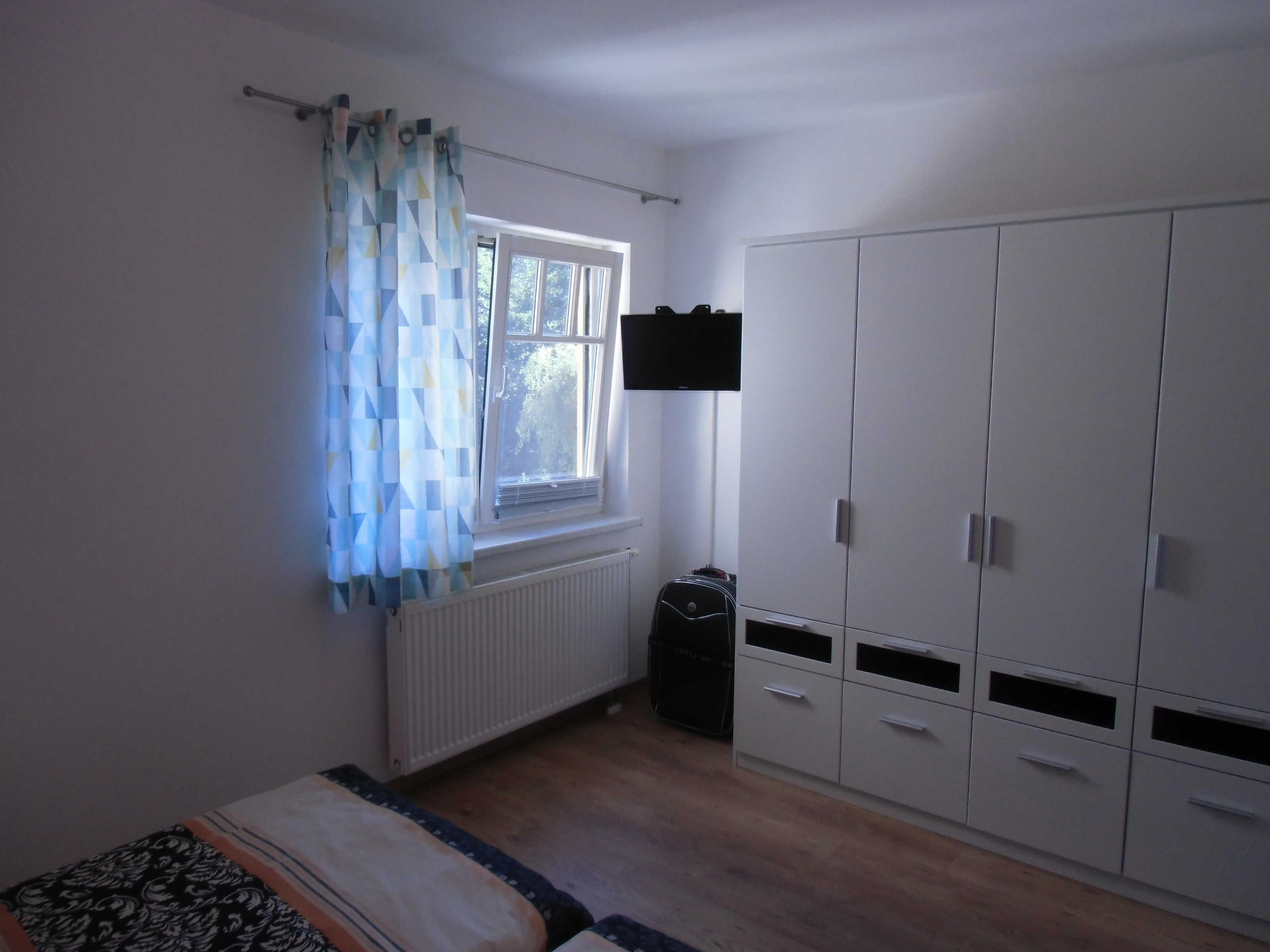 Das Schlafzimmer ist mit einem Doppelbett (Kopfteil klappbar, 2,00 m x 1,90 m) und einem viertürigen Schrank mit ausreichend Stauraum ausgestattet. Das Doppelfenster hat eine Insektengaze. Ein zweites TV Gerät kann hier ebenfalls genutzt werden.