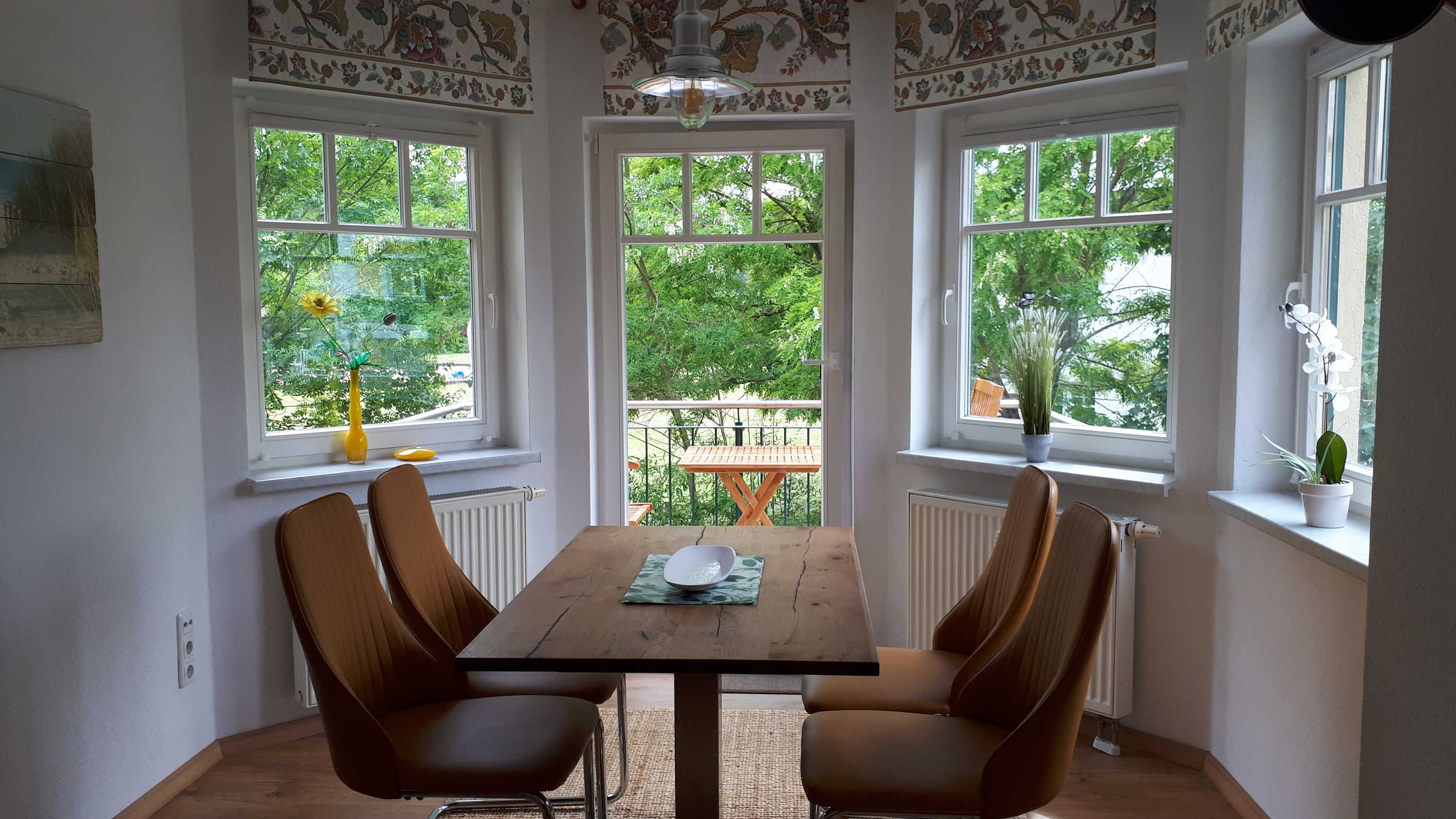 Vom Essbereich geht es direkt auf den kleinen Balkon mit 2 Gartenstühlen und Tisch (weitere 2 einfache Klappstühle sind vorhanden).