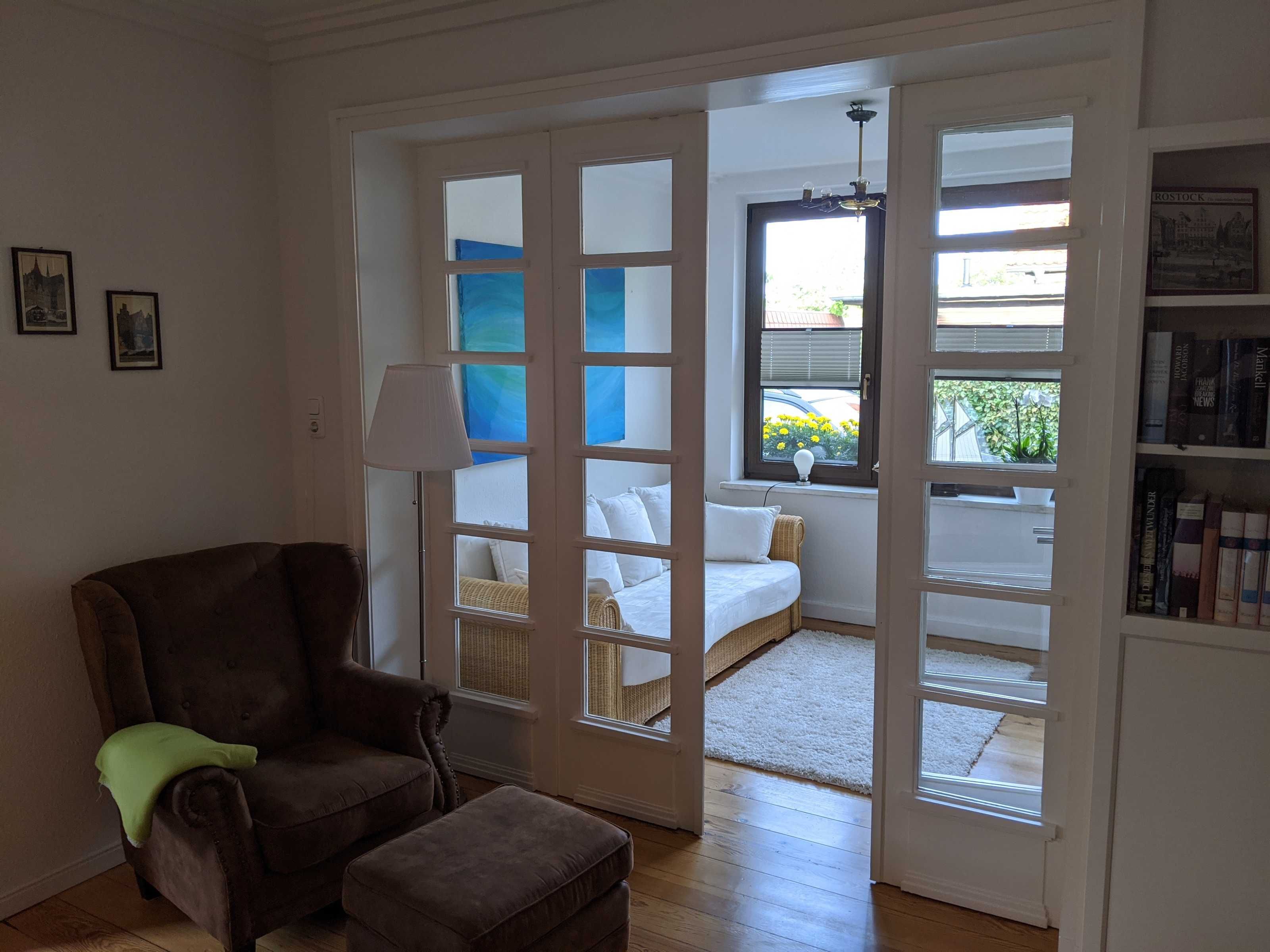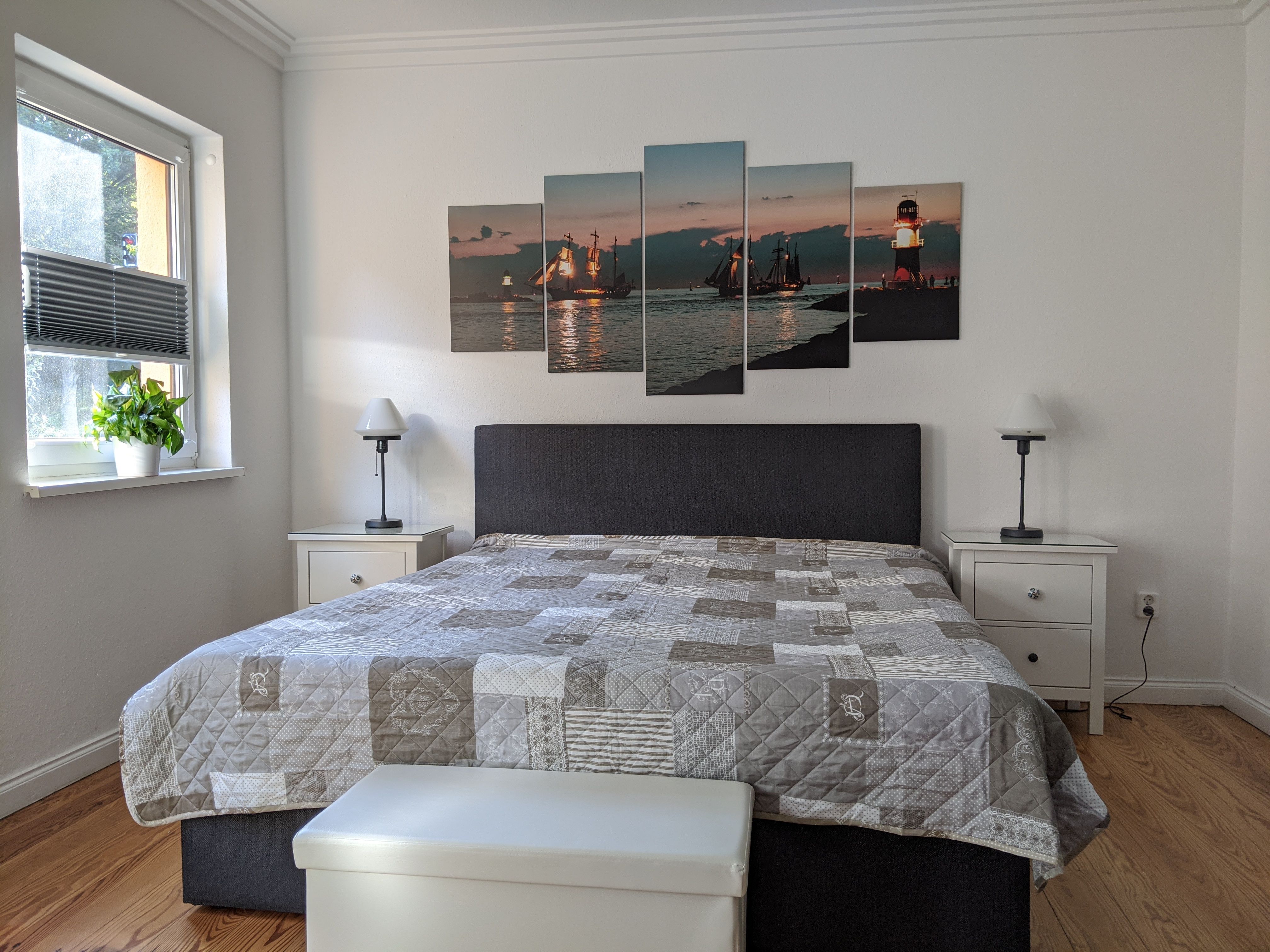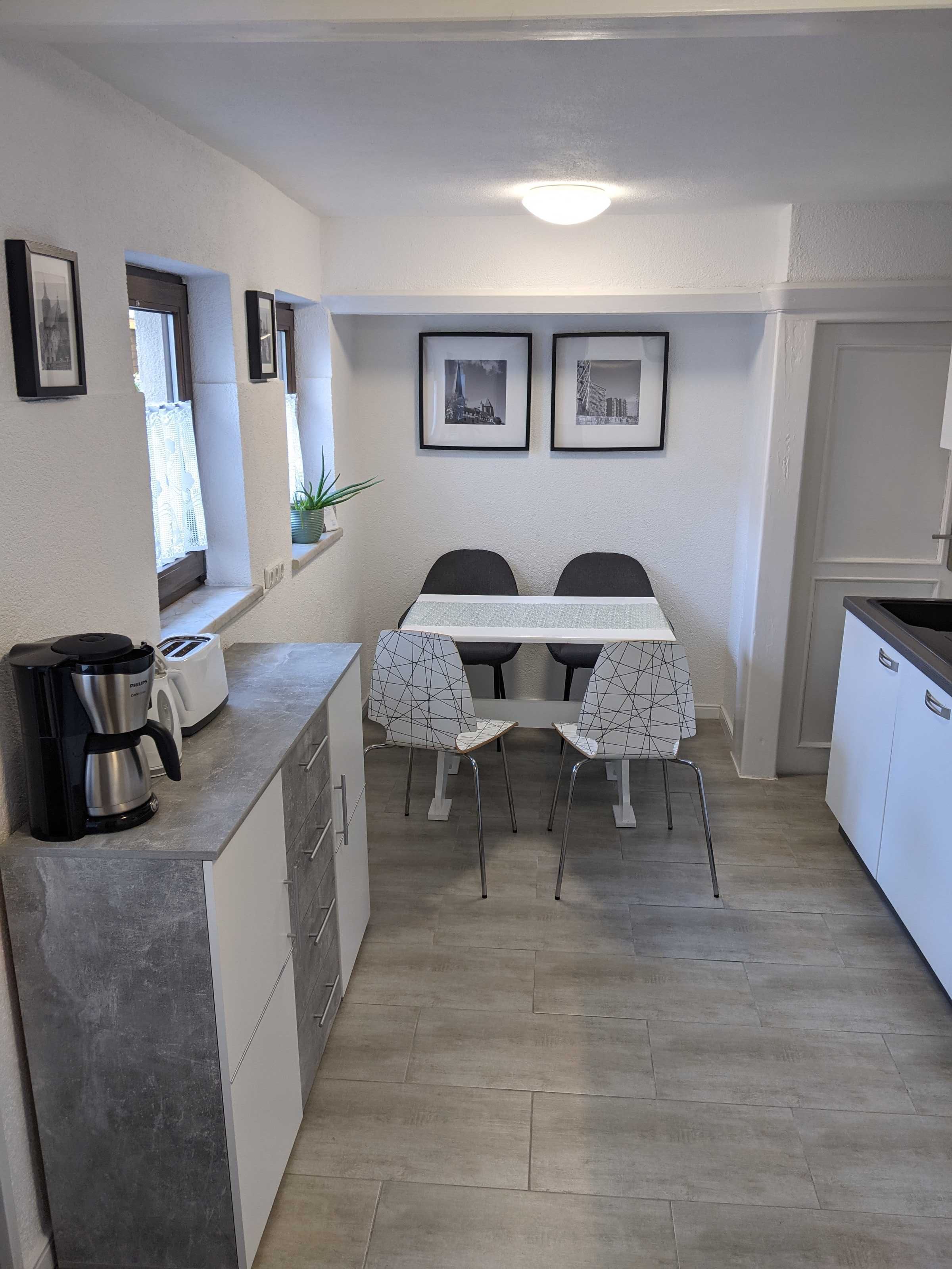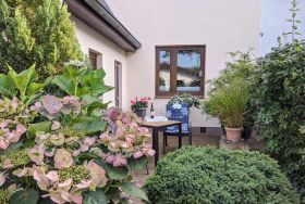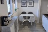 Unsere 2017 neu gestaltete Ferienwohnung befindet sich im Erdgeschoss einer Doppelhaushälfte. Das Obergeschoss ist unbewohnt, sodass Sie Ihre Zeit ungestört genießen können. Die Ferienwohnung wurde hochwertig und mit viel Liebe zum Detail für unsere Feriengäste eingerichtet und bietet Ihnen alle Annehmlichkeiten für einen entspannten Aufenthalt. Das separate Schlafzimmer ist mit einem großen Boxspringbett ausgestattet. Im Nebenbereich des Wohnzimmers ist eine Schlafcouch aufgebaut und bietet so zusätzlichen Schlafraum für zwei weitere Gäste. An die voll eingerichtete Küche mit kleinem Esstisch schließt sich die neu errichtete Terrasse mit entsprechender Sitzmöglichkeit für laue Sommerabende an. Das gemütliche Wohnzimmer mit dem großen Flachbildschirm lädt zu gemeinsamen Abenden der Entspannung ein. Wenn Sie mit der Familie anreisen, bietet unser großer Esstisch im Wohnzimmer einen Ort für gemeinsame Aktivitäten.