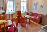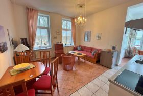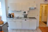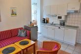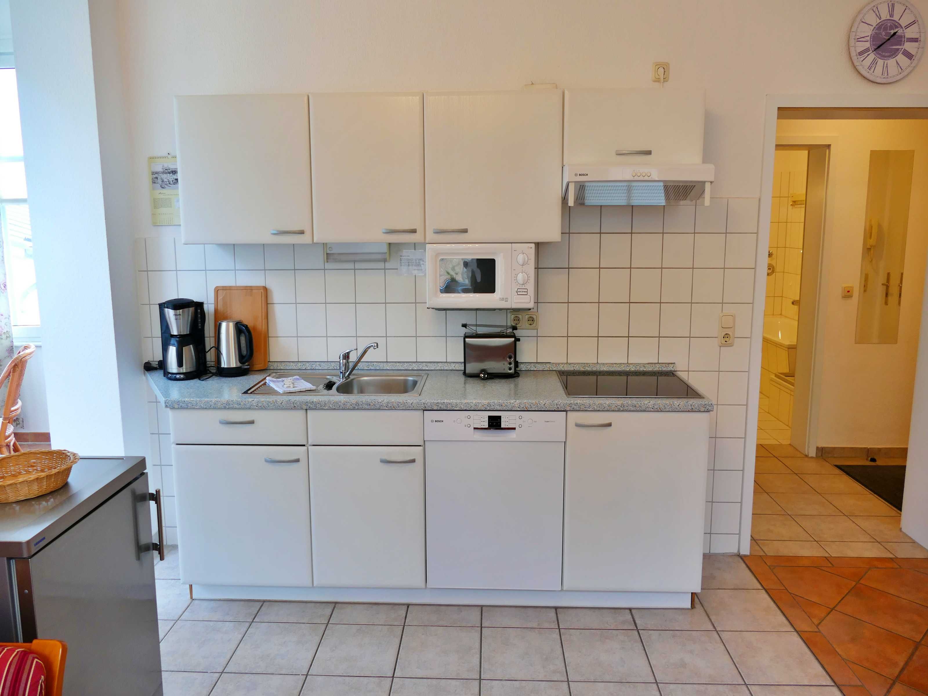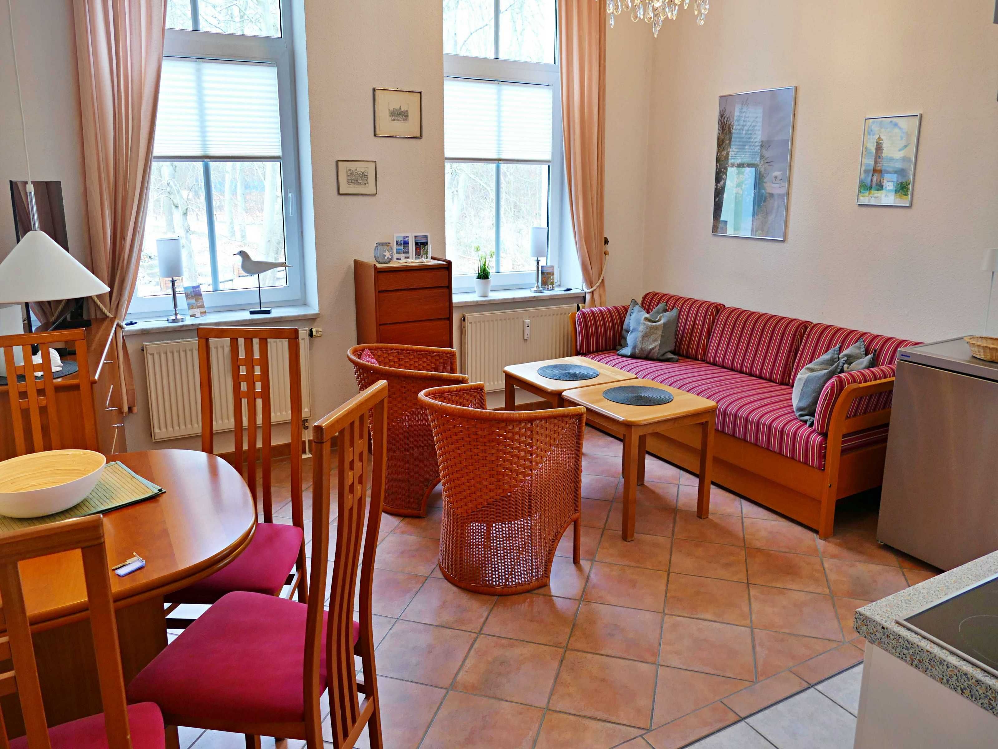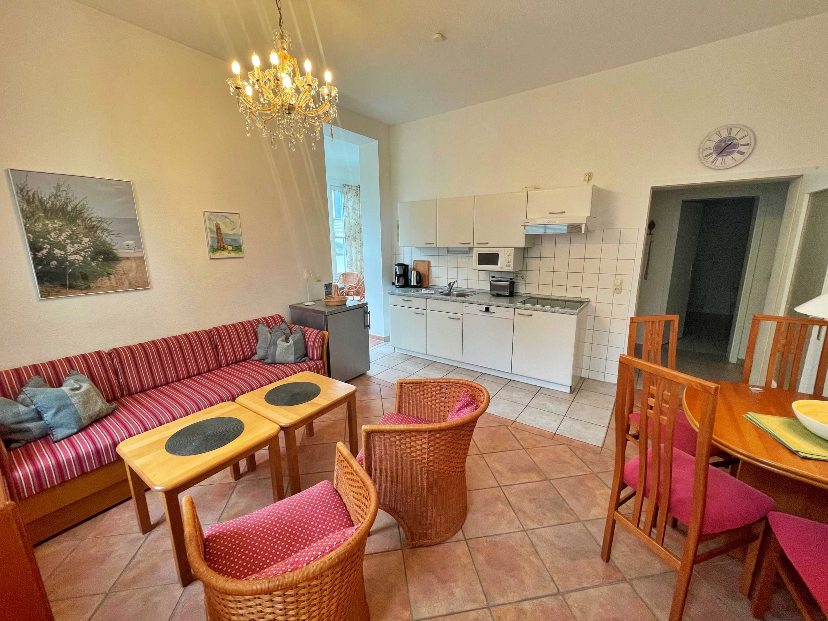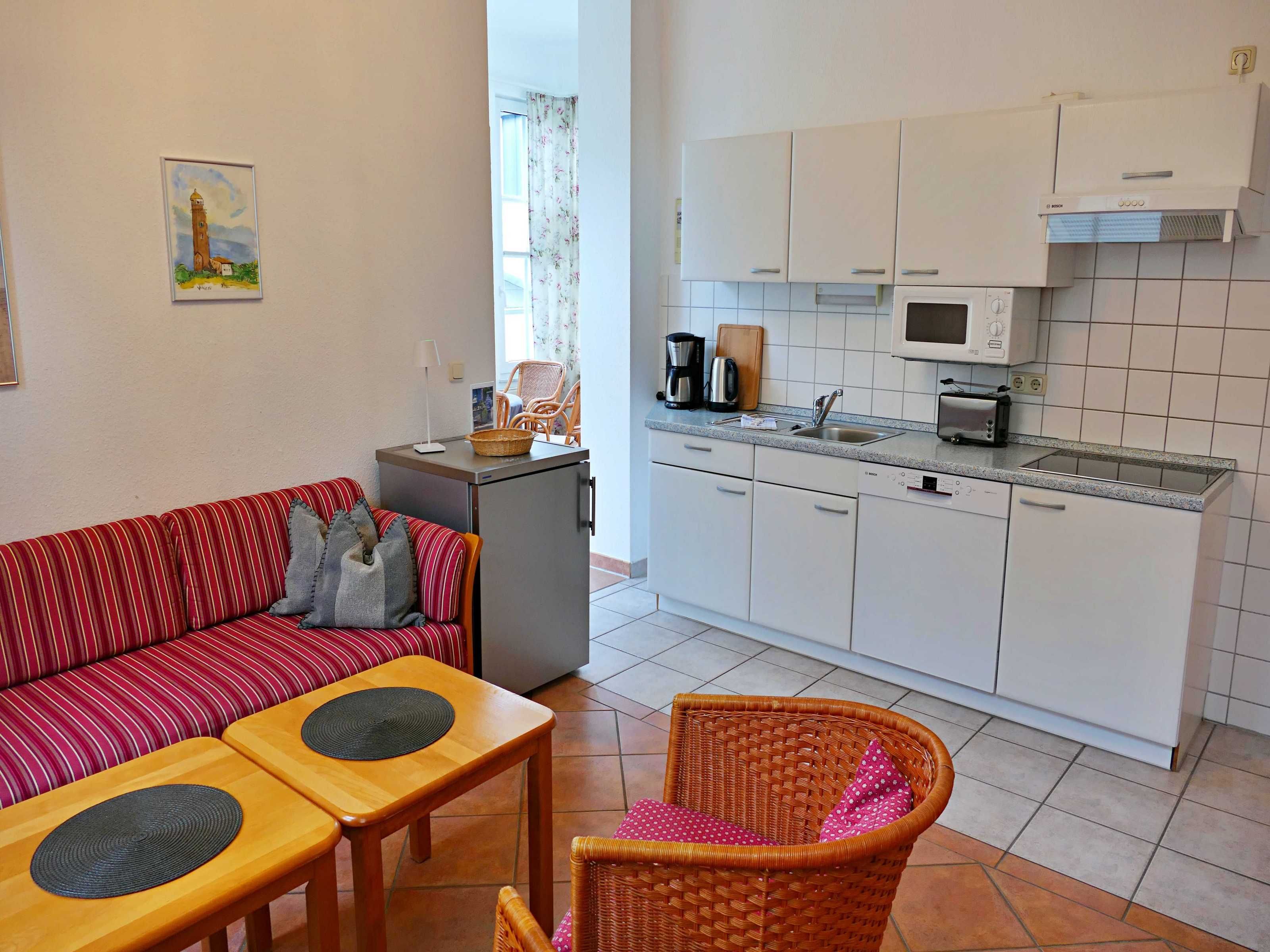 Hell, charmant und stilvoll - diese 46 qm große Ferienwohnung in der 1. Etage ist der ideale Rückzugsort für einen entspannten Urlaub für bis zu 4 Personen. Im hellen Wohnzimmer befinden sich neben einer bequemen Couch, auch zwei Sessel mit Couchtisch sowie ein Esstisch mit 4 Stühlen, der genügend Platz bietet. Die Couch (1,40 x 2,00 m) kann als Aufbettungsmöglichkeit für zwei weitere Personen genutzt werden. Vom Wohnzimmer gelangen Sie in die Veranda, welche über eine gemütliche Sitzecke verfügt perfekt für den ersten Kaffee am Morgen oder um den erlebnisreichen Tag bei einem Glas Wein ausklingen zu lassen. Die offene Küchenzeile mit Ceran-Kochfeld, Spülmaschine, Mikrowelle, Wasserkocher und Kaffeemaschine bietet alles, was man braucht für entspannte Frühstücke oder das kleine Abendessen. Das Schlafzimmer verfügt über ein Doppelbett, Kleiderschrank und ist mit Laminatfußboden ausgelegt. Das Bad mit Badewanne, Dusche und WC rundet das Wohlfühlangebot. Natürlich ist kostenfreies WLAN inklusive. Ihren Pkw können Sie in der Tiefgarage parken und Ihre eigenen Räder ganz praktisch im Fahrradkeller unterstellen. Im Keller befinden sich zudem Waschmaschinen und Trockner, die gegen eine Gebühr nutzbar sind.